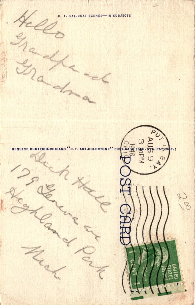 MAKE AN OFFER. THE MORE YOU BUY THE BETTER DEAL I WILL ACCEPT The postcard is a greeting from Put-in-Bay, Ohio, a popular tourist destination located on South Bass Island in Lake Erie. The postcard features sailboat scenes and is a genuine Curt Teich & Co., Inc. postcard, known for their high-quality printing and vibrant colors.
