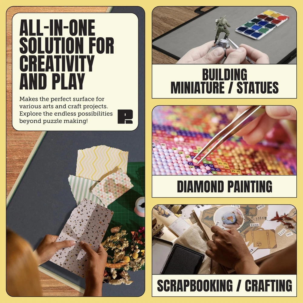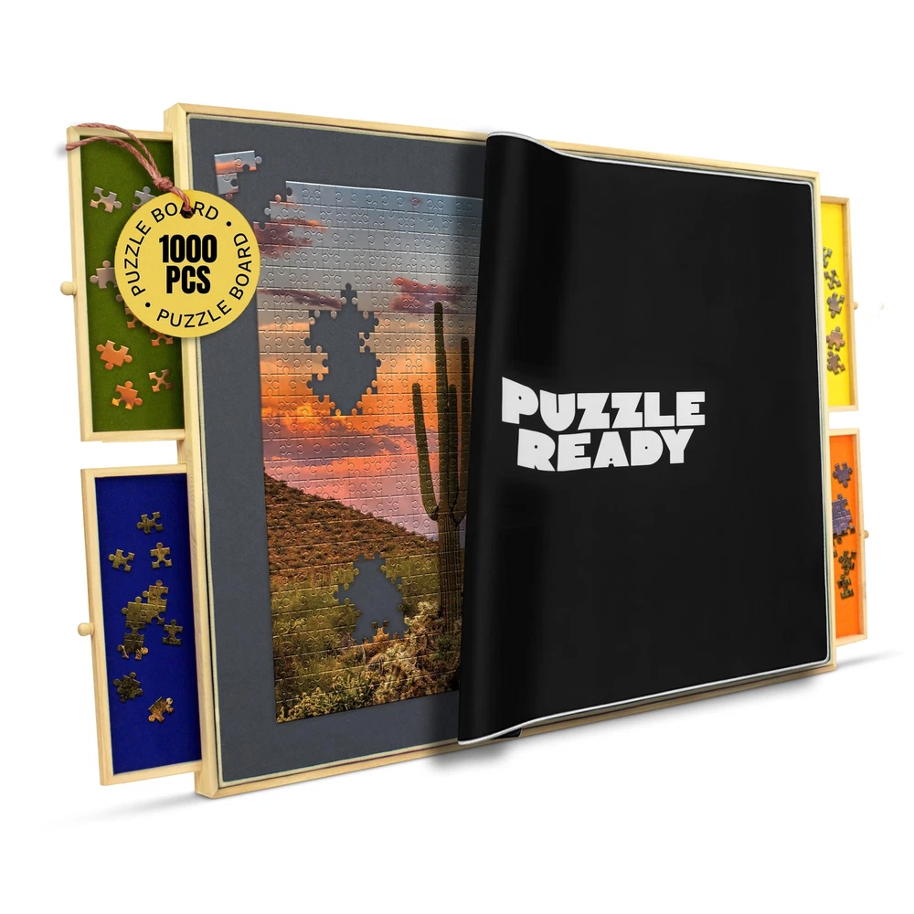 The wooden puzzle plateau is your go-to puzzle board for 1000 piece puzzle. The perfect holiday gift for yourself or a friend. Featuring a smooth, sturdy and soft felt working surface for puzzle assembly. This puzzle plateau makes a great place to keep a puzzle while in progress and also enables you to move it into a safe place while you work on it at home or in your RV. Discover the fun of working puzzles and set up a puzzle station this holiday so you can enjoy your puzzle with family and friends. What customers are saying: "Not Heavy." -Jane from WA "Rotates Easily." -Chris from NY "Portable & Easy To " -Kim from NM "Good Quality" -John from Texas HASSLE FREE JIGSAW PUZZLE HOLDER SET-UP Straight out of the box, with no modifications, start using your new puzzle board in a matter of minutes. You will love it.The working area is 24" x 30" and has a rim along the complete surface to ensure no puzzle go missing. KEEP PIECES ORGANIZED In PUZZLE SORTER TRAYS FOR PUZZLE PIECES The wooden puzzle board has four removable color-coded wooden reinforced sliding sort and go puzzle storage trays to help you keep your various puzzle pieces organized. No more searching for that corner piece or that group of oddly shaped all-black mystery pieces.The drawers are perfectly functional, organize jigsaws sections without losing pace while you build your masterpiece. Each tray is lined with a different color felt to allow for easy discovery. Separate your puzzle pieces by shape or color and you'll be finished assembling your puzzle in no time. EASILY PUT AWAY, PORTABLE & LIGHTWEIGHT Simply cover and put away when you need the extra space for seating or dining. Easy lift and balanced for quick storage. Easy to move.You can cover your puzzle with the unique cover and tuck Family Fun Puzzle Table - Featuring a smooth jigsaw puzzle board, Sturdy, Soft Felt work surface for puzzle Organizing & assembly. This patent pending puzzle plateau makes a great place to keep Jigsaw puzzles in progress & also enable you to move it into a safe place while you work on it at home or in your RV. Use it, again and again, to assemble all your favourite jigsaw puzzles with family and friends for years to come. Easy to Move - Simply cover the Board game table and put it away when you need extra space for seating or dining. Easy lift, Lightweight and balanced for quick Puzzle storage. Easy to move. In a matter of seconds, you can cover your puzzle with the unique Puzzle Mat and tuck it away under a couch or bed for safekeeping. Perfect Size - Your new Sustainable Wooden Puzzle Plateau workspace measures 24" X 30" and fits most of 1000 Piece Jigsaw puzzles. Color-coded Puzzle Sorting Trays help you keep jigsaw puzzles organized—keep your unfinished puzzles safe until next time with the puzzle cover included along with puzzle tray sorters. "Ready to go bigger? Have a look at our Puzzle Board 1500 Pieces!" Designed for Puzzle Lovers: Our Puzzle table is all in solution. Colorful sliding drawers to sort and hold your jigsaw puzzle pieces, Removable puzzle mat to keep safe unfinished puzzles from Pets & Children. And no-slip feet protect your beautiful living room table and ensure no scratches or scuff marks, unlike any other Large Puzzle boards or Puzzle Keeper. Great Christmas Gift for Board Games Enthusiasts - Are you looking for the perfect gift for the puzzle lover in your life? This beautifully designed puzzle board is of the best Puzzle Accessories to use as Birthday Gifts for women, Father’s Day gifts, Gifts for moms, Grandma Gifts, and for all other occasions like Thanksgiving, and Christmas. Enhance your diamond painting experience with . Our table is designed specifically for diamond painting enthusiasts, with a large flat surface for comfortable crafting, built-in storage compartments and drawers to keep all your diamond painting kits, diamond art accessories and tools organized and easily accessible. The durable and easy-to-clean surface, lightweight and portable design make this table the ultimate companion of diamond art adventures.