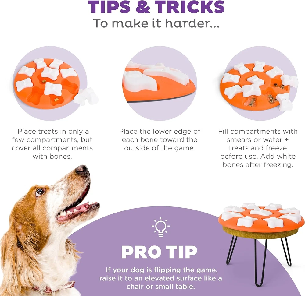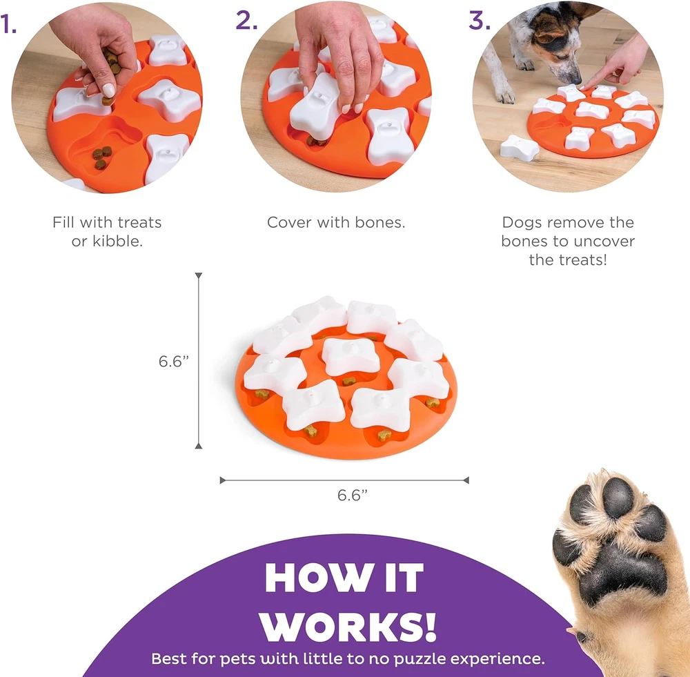 Store New Arrivals Add to Favorite View Feedback Contact Puzzle Dog Toy Nina Ottosson Dog Smart Orange Interactive Treat Puzzle Dog Toy Description Item model number 67331 Style Level 1 (Easy) Color Dog Smart Product Dimensions 11 x 11 x 1.6 inches; 11.2 Ounces Country of Origin China Is Discontinued By Manufacturer No Size Level 1 (Easy) BEGINNER DOG PUZZLE: The Dog Smart by Nina Ottosson is a level 1 interactive dog puzzle toy that will prepare your pup for more challenging games with simple one-step actions. Suitable for any breed and size. ENGAGING & MENTALLY STIMULATING: This interactive dog puzzle features 9 hidden compartments that are covered by 9 removable dog bone pieces. Hide your pup's favorite treats in the compartments and elevate the bone for an easier grab or leave them flush with the board for increased difficulty. Watch as your dog learns to nudge and paw away the bones to reveal the reward! REDUCES BOREDOM & DESTRUCTIVE BEHAVIOR: The Dog Smart interactive dog treat puzzle provides your pup with a fun and rewarding game that can help redirect destructive behavior while supporting their mental wellbeing. BPA, PVC & PHTHALATE FREE: Nina Ottosson by Outward Hound interactive treat dog puzzles are designed with your pet's health in mind from food safe materials that you can trust. Easy to clean with warm water and soap between uses. PLAY IT SAFE: No toy is indestructible. Do not leave toys with unsupervised pets. Remove and replace toy if damaged. The Nina Ottosson by Outward Hound Dog Smart interactive dog puzzle is a fun way to get your dog excited about problem solving games! This level 1 dog puzzle toy features nine treat hiding compartments that can be filled with your pup’s favorite treats and covered with nine dog bones that release the tasty scent of treats through the top hole. Place on the ground and watch your dog use his noggin as he paws, and nudges the bones over to uncover the hidden rewards! You can also vary the level of difficulty by placing the bones flat or tilting them up at an angle over the hidden compartments. Made from food safe composite materials that are BPA, PVC, and phthalate-free. Cleans easily with warm water and mild soap. ABOUT US We offer the best prices around on high quality products. Our E-store includes media such as books, movies, music and games while offering electronics, toys, sporting apparel, clothing, tools, general home, garden items and more. SHIPPING We are always working hard to ensure your package arrives as soon as possible. Please understand that some factors like weather, high postal traffic, and the performance of shipping companies are outside of our control. We offer free shipping to the lower 48 states and ship within 2 business days of payment, usually sooner. We do not accept P.O. Boxes. Please provide a physical address. For shipping outside of the continental USA, we only use eBay's Global Shipping Program.The item is shipped to KY and then sent to the rest of the world. International customers are responsible for all duties and taxes. Continue to check out in order to calculate costs for shipping the item to your country. Messages regarding eBay's Global Shipping Program MUST be directed at eBay EXCLUSIVELY. RETURNS We offer a 30-Day Return Policy on items which you are not completely satisfied with. You have the option for a full-refund or an exchange of the item. No returns are available on items shipped outside of the USA. PAYMENT We accept PayPal. CONTACT US This page content is yet to come Please ad us to your favorite seller and visit again later Thank You CUSTOMER SATISFACTION We try our very best to make sure every customer is completely satisfied. If there's a problem, message us! We're happy to help.