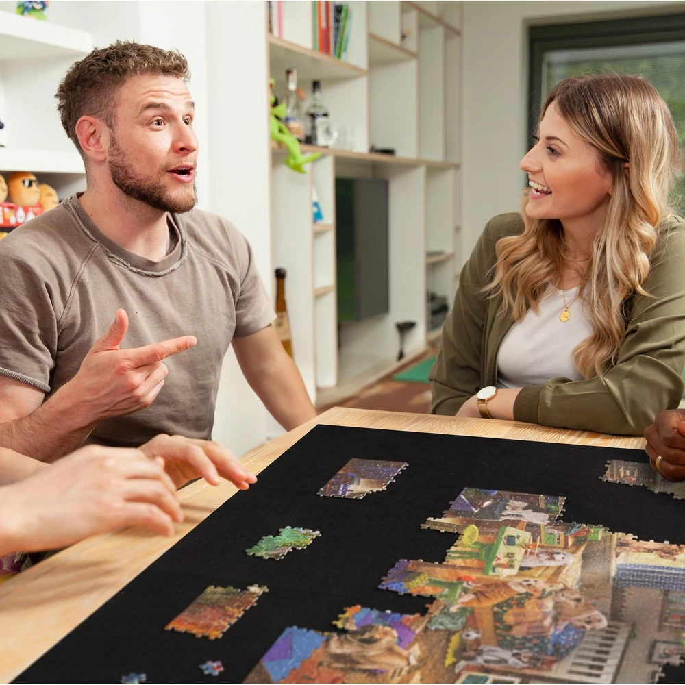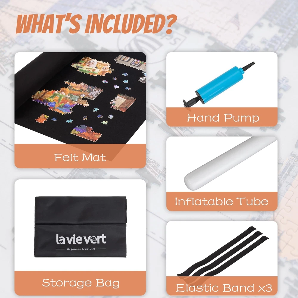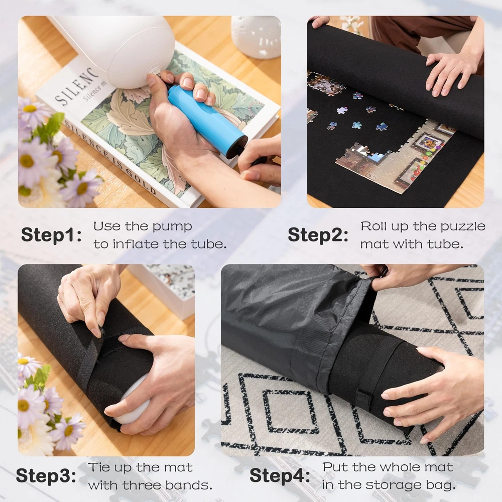 Puzzle Mat Roll Up Portable Puzzle Board with Drawstring Storage Bag for Up to 2000 Pieces, Large Black Felt Mat Puzzle Saver with Hand Pump for Easy Storage High-Quality Puzzle Saver Mat - The puzzle mat is designed to accommodate most 2000-piece jigsaw puzzles. Made from premium felt fabric, it ensures a smooth, crease-free surface during your puzzle assembly. The soft texture allows for easy movement of puzzle pieces and effortless cleaning of any debris. Enclosed Inflatable Tube - This portable puzzle mat comes with an inflatable tube to facilitate easy rolling and prevent creases that can occur from folding. A hand pump is included for quick inflation of the tube. Three elastic bands are provided to secure and stabilize the rolled-up mat, ensuring that no puzzle pieces fall out or get lost. Convenient Storage Bag - An extra storage bag is included to protect the puzzle roll up mat from dust, stains, and moisture. This bag also makes it easy to identify and access your puzzle game, ensuring your pieces stay safe and organized. Easy Operation - To use, simply spread the puzzle mat on a flat surface and begin your puzzle assembly. When you need to pause and your puzzle, place the inflated tube at end of the mat, then roll up the mat evenly. Secure the roll with the provided elastic bands and it in the storage bag. Package Contents - Felt puzzle mat × 1, hand pump × 1, inflatable tube × 1, elastic band × 3, storage bag × 1. Exquisite packaging makes it a perfect gift choice for all ages on Christmas, Thanksgiving, birthdays, and other special days. Please note that package includes no jigsaw puzzles.