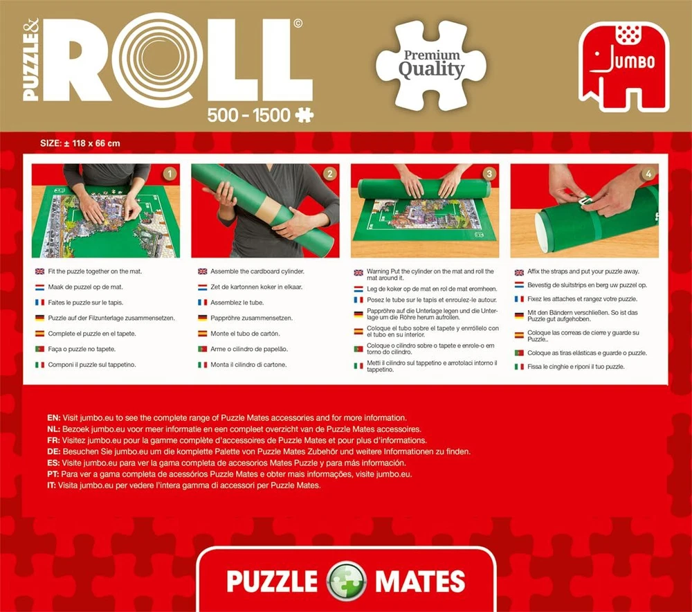 The puzzle mates puzzle & roll is the smart puzzle storage mat you can roll! great for when on the go - start building your jigsaw on the specially designed puzzling felt. When you are ready to or transport your jigsaw, assemble the cardboard cylinder and roll the felt mat around the cylinder and fasten this with the straps provided. The puzzle & roll is suitable for puzzles up to the standard size of a 1500 piece jigsaw puzzle (90 x 60cm). Suitable for puzzles up to the standard size of a 1500 piece jigsaw puzzle (35, 43 x 23, 62 inches) Dimensions: 46, 46 x 25, 98 inches Great for when on the go - start building your jigsaw on the specially designed puzzling felt