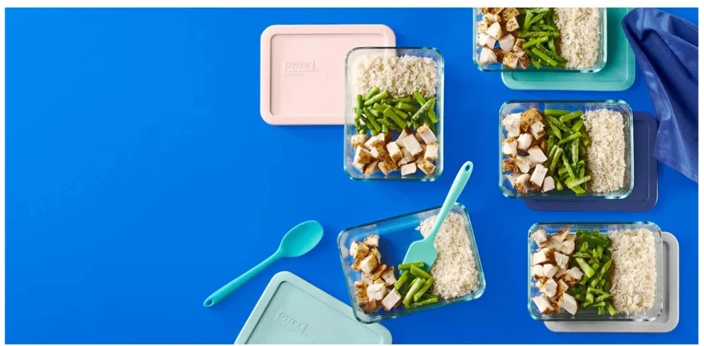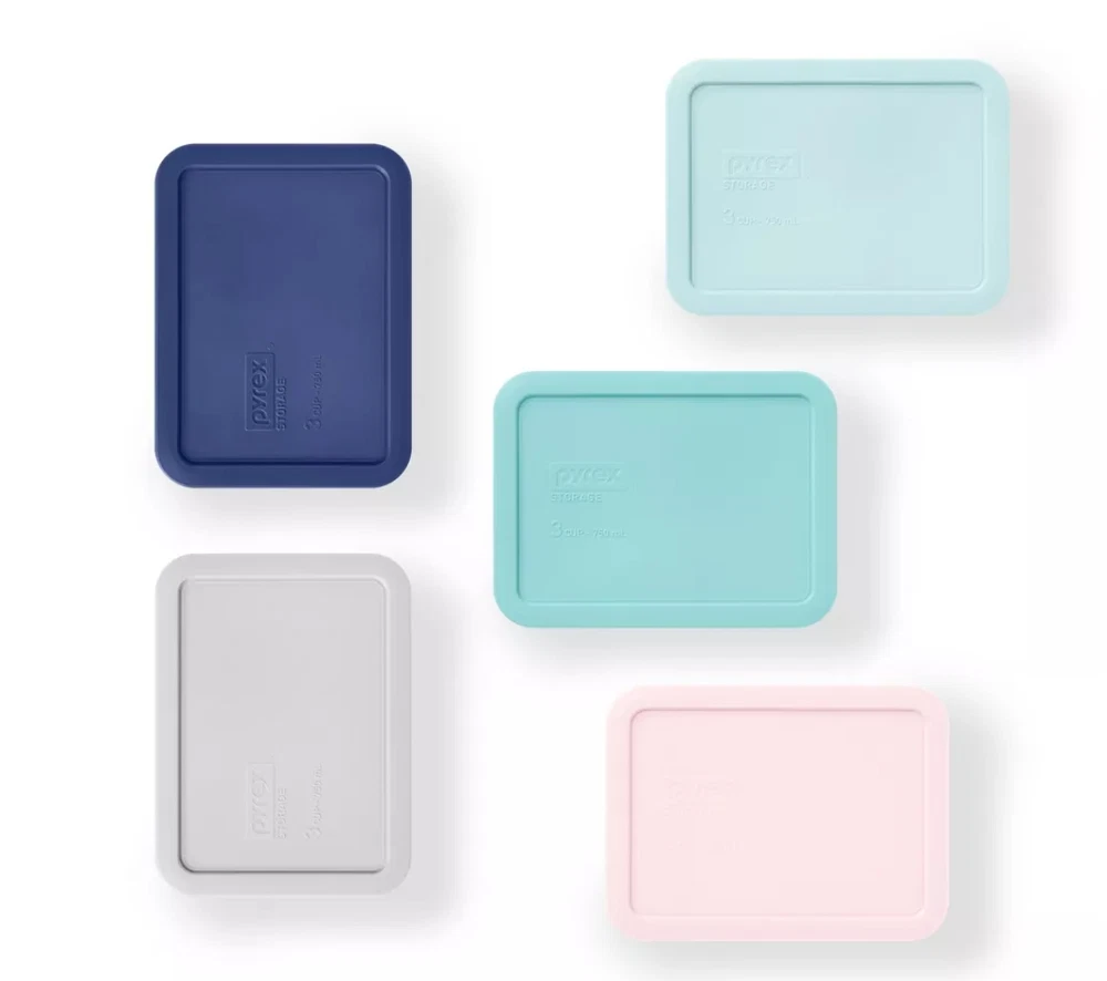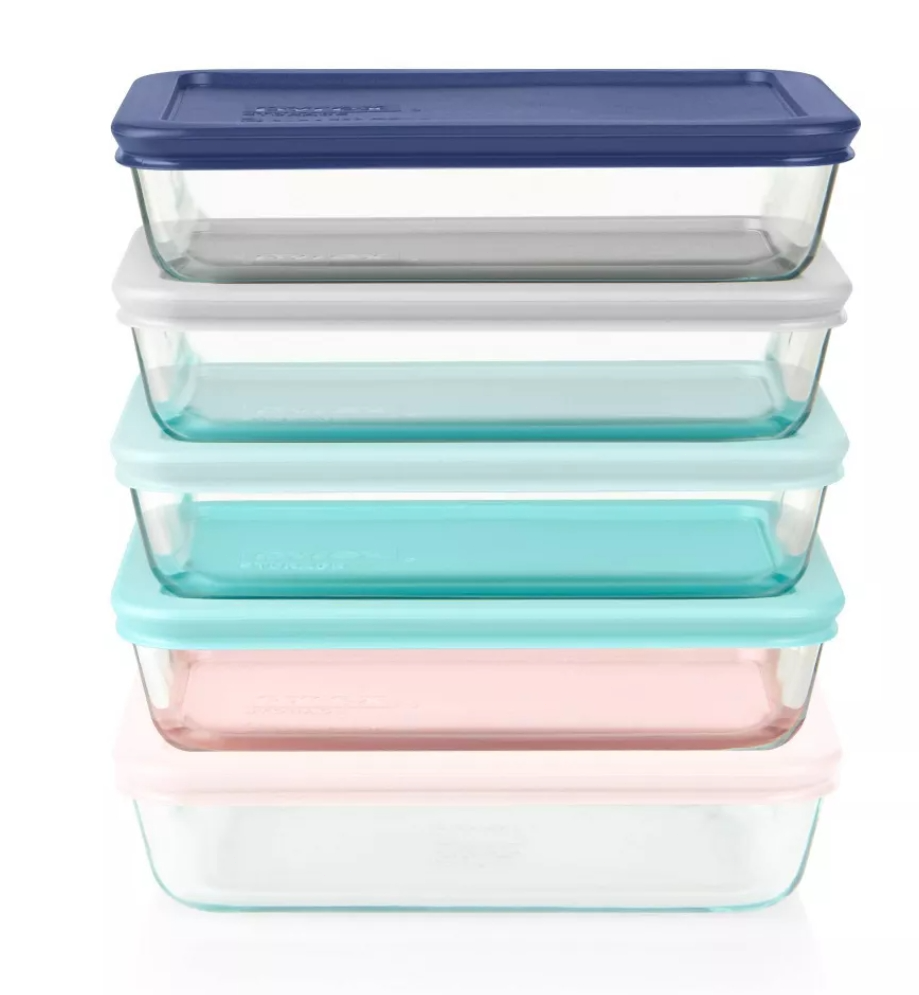 SET INCLUDES: Five 3-cup glass rectangular containers with matching lids DURABLE GLASS: Pyrex's durable, premium tempered glass resists stains and do not absorb food odors or flavors EASY AND VERSATILE: Pyrex's glass is dishwasher, freezer, microwave and preheated-oven safe for your convenience