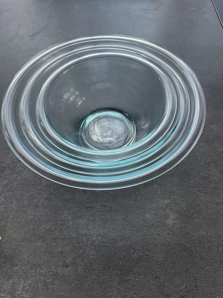 Set of THREE Pyrex nested Mixing Bowls. They have a light bluish tint — very lovely with a modern retro feel. Excellent condition. Included are 2.5 qt., 1.5 qt., and 1 qt and measure 10”, 8.5”, and 7” respectively. Likely produced from the late 1990s to early 2000s.
