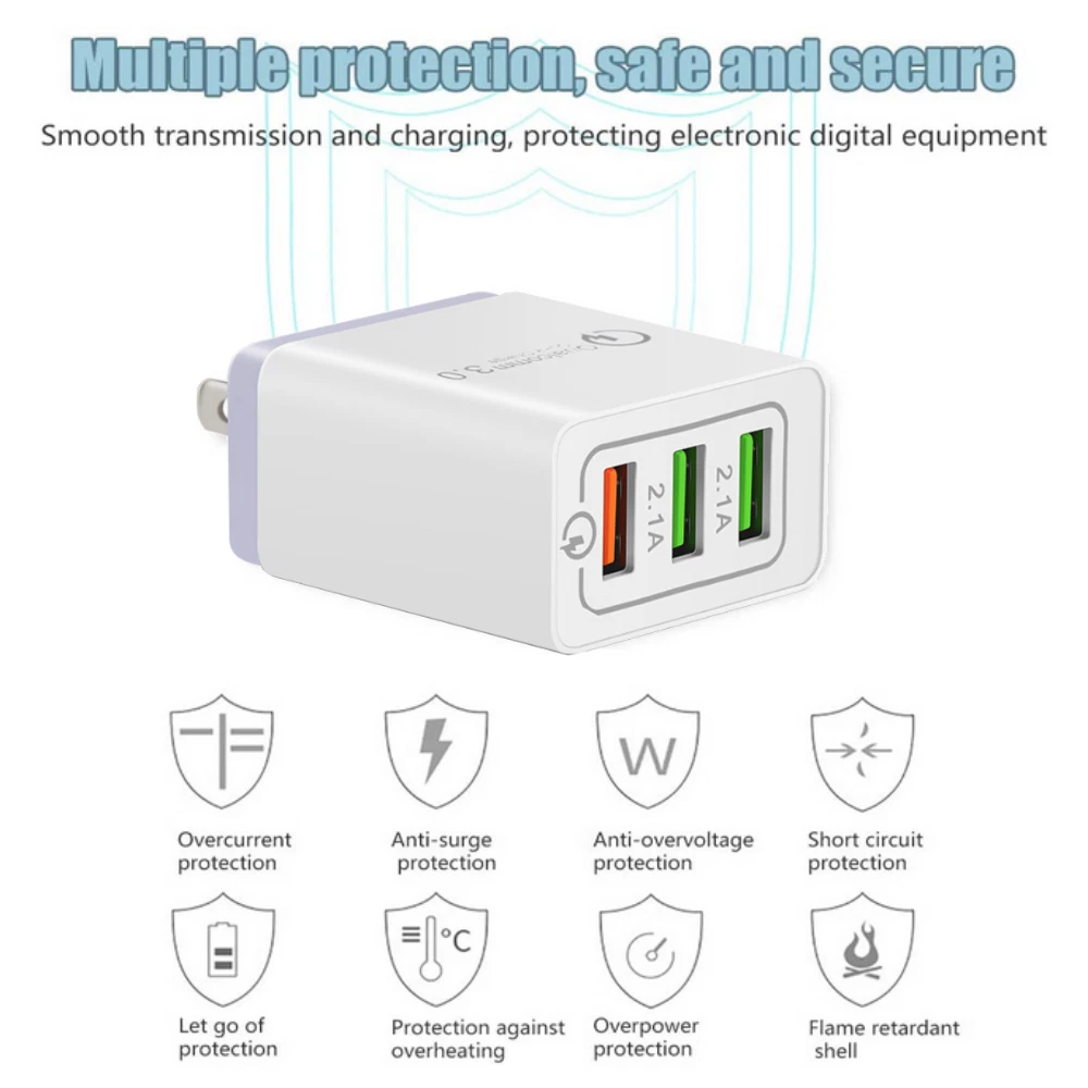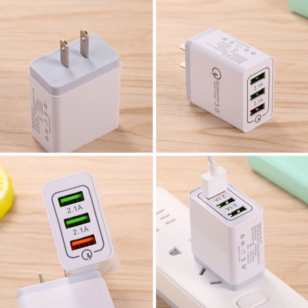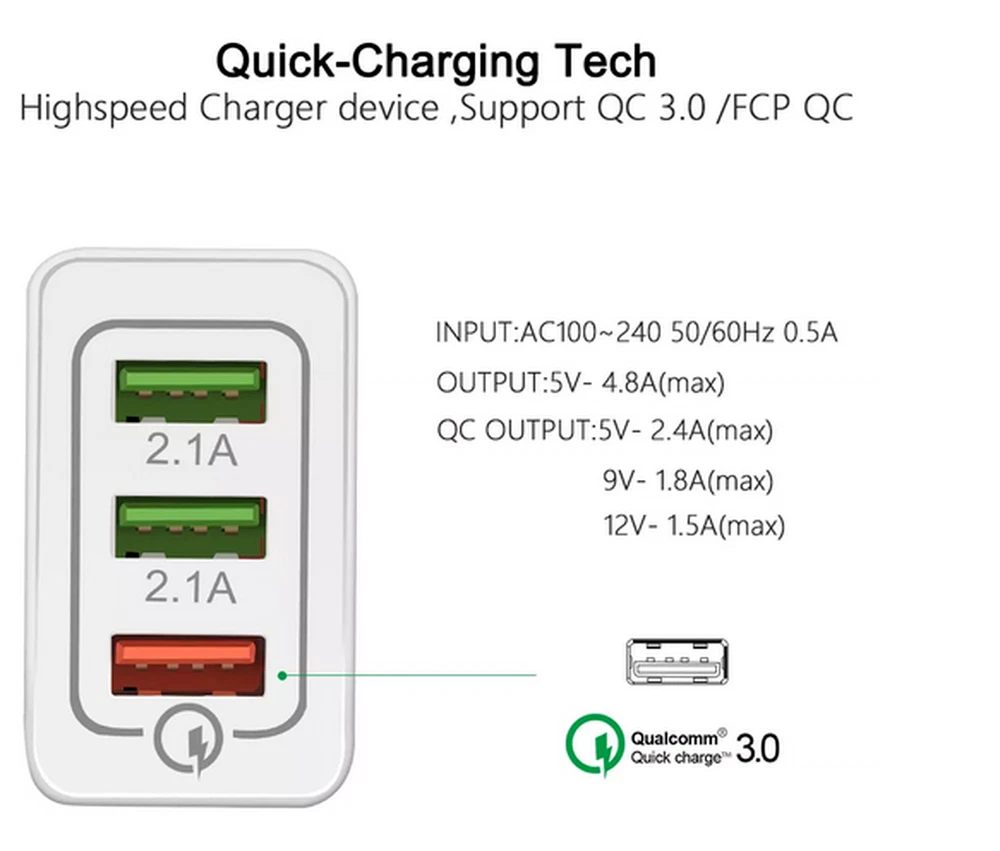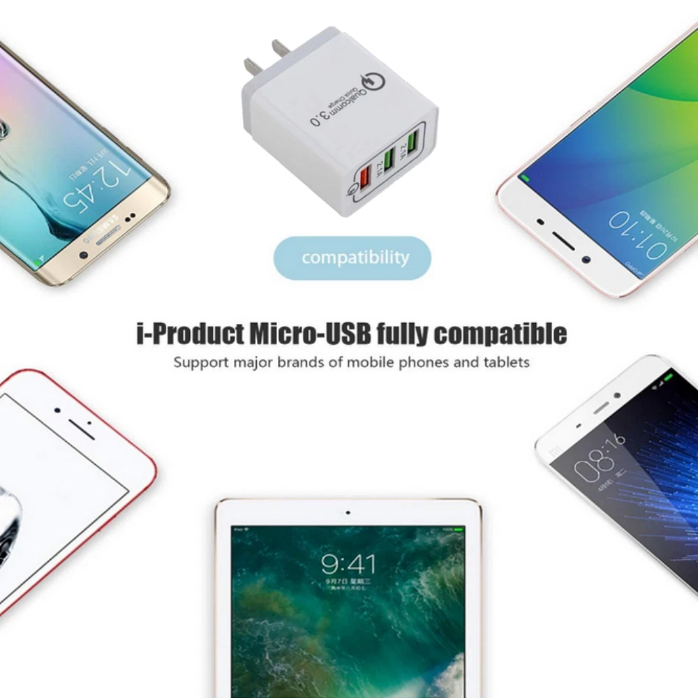 Quick Charger with 3 Ports ---ONE quick charging port: support quick charge enabled devices up to 4 times faster than conventional 1A adapter, also compatible with Quick Charge 2.0/1.0 enabled Android phones. ---TWO standard 2.1A charging ports: can charge with high- speed to your quick charge limited USB devices. Maximize the charging efficiency for all your charge devices, make it great outlets saver! Safe Charging First-Multi Ports USB charging block features with Built-in safeguards to protect your devices against any dangers like over-current, over-voltage, and overheating. Intelligent IC identification technology can automatically detect charging equipment and output for the optimal current for devices, ensuring completely safe charging environment. Super Travel Ready-Foldable prongs and lightweight design make it the best travel charger to put in your pocket or bag during business trips or vacations. Just carry one wall charger you can charge 3 devices at the same time, or share charging ports with others, bring you unbelievable convenience anywhere like travel, home, office charging Smart IC Chip- Build-in smart chip, the Wall Charger will automatically recognize any USB devices and maximize the output current up to 10W. Type: QC 3.0 Quick Charging Wall Charger Adapter Station Material: ABS+PC Plug Type: US Plug Interface: 3 / 4 X USB Input: AC 100V-240V, 50/60Hz, 0.5A Output: 5V/3A, 9V/2A, 12V/1.5A QC3.0 Output: DC 5V/2.4A, 9V/1.8A, 9V-12V/1.5A Color:White Compatible With: For iPhone 1 4 ,1 4 pro,14 pro max For iPhone 13,1 3 pro,13 pro max For iPhone 12,12 pro,12 pro max For iPhone 11,11 pro,11 pro max For iPhone XS, XS Max, XR For iPhone X, 8, 8 Plus For Samsung Galaxy S20 ALL For Samsung Galaxy S10, S10+ For Samsung Galaxy S9, S9+ For Samsung Galaxy S8, S8 For Samsung Galaxy S7, S7 edge For Samsung Galaxy S6, S6 edge, S6 edge For Samsung Galaxy Note 9, 8, 7, 5 For Google Nexus 7, 6, 5, 4 For Nokia Lumia 1520, 1020, 930, 929, 928, 925, 920, 830, 820, 8Sirocco For LG G2, G3, G6 , V30, V30s ThinQ For Sony Xperia XZ2, XZ2 Compact For HTC Droid DNA, 8X For Huawei Mate RS For Xiaomi MIX 2S For YOTA Phone 2 For Motorola Droid Turbo 2 Package Included: 1/2/3/5/10/20/50/100x USB QC3.0 Quick Charge Wall Charger