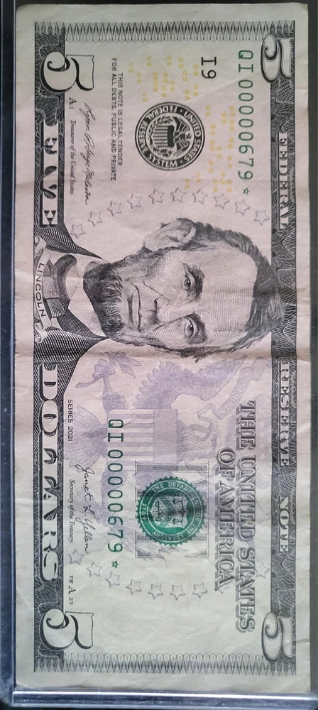 This low, rare fancy serial number star note QI00000679* adds to the uniqueness of this $5 replacement note from 2021. The note is circulated and ungraded, making it a perfect addition to any collection. The 2021 Series is the current production of all strar/replacement notes. This note was a 1st run print out of Forth Worth of a combined 3,200,000, just to give you an idea on how rare this note and serial number are. Your winning bid will also include a hard plastic protective cover that it will be shipped in for extra protection due to the fact of the pristine condition on this note. However it should be known that i acquired it in general circulation while working at a cash register. States Mint has certified the note, ensuring its authenticity. This small size note is a part of the Federal Reserve series and is a must-have for any coin and paper money collector. The denomination and year of issue are clearly stated on the note, making it easy to identify. Add this rare and unique note to your collection today! Check out my other items for more great rare collectibles with currency !!! Message me with any questions or don't hesitate to make me an offer.