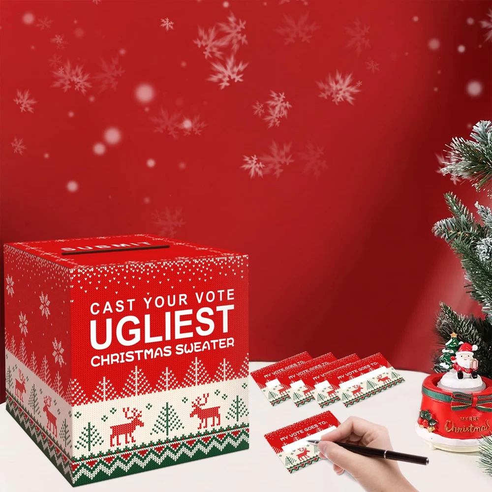 QIKSION Ugly Sweater Contest Ballot Box, Voting Cards Box Set with 50 Voting Cards Sweater Contest Ballot Box for Christmas Games Party Decorations MORE BENEFITS Package Include: Includes 50 ballot cards and 1 Ugly Sweater Contest Ballot Box, card box measures 8.7 x 8.7 x 8.7 inches, ballot Cards are plentiful enough to meet your party use, and everyone can attend the Christmas ugly sweater party! Easy to Assemble and Use: The ugly sweater voting box is simply designed for effortless assembly, it can be quickly folded into the shape of a ballot box, please refer to the picture for the specific assembly method. Funny Xmas Games: The ugly sweater party decorations are widely suitable for christmas sweater parties, carnival, New Year party, celebrations and other holidays. Perfect For All Ages: When the holidays come around, this Ugly Sweater Contest Ballot Box provides a fun, interactive game for your guests, kids, adults, and people of all ages to have fun and relax, too. It will be a very memorable Christmas ugly sweater party! QIKSION provides different color of card box for your options in the store. If you are dissatisfied with our gift card box, please feel free to contact us. We are glad to help you.