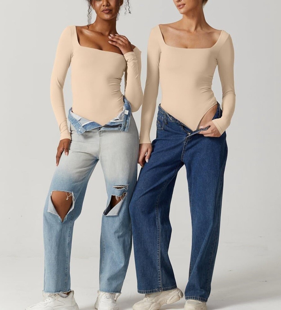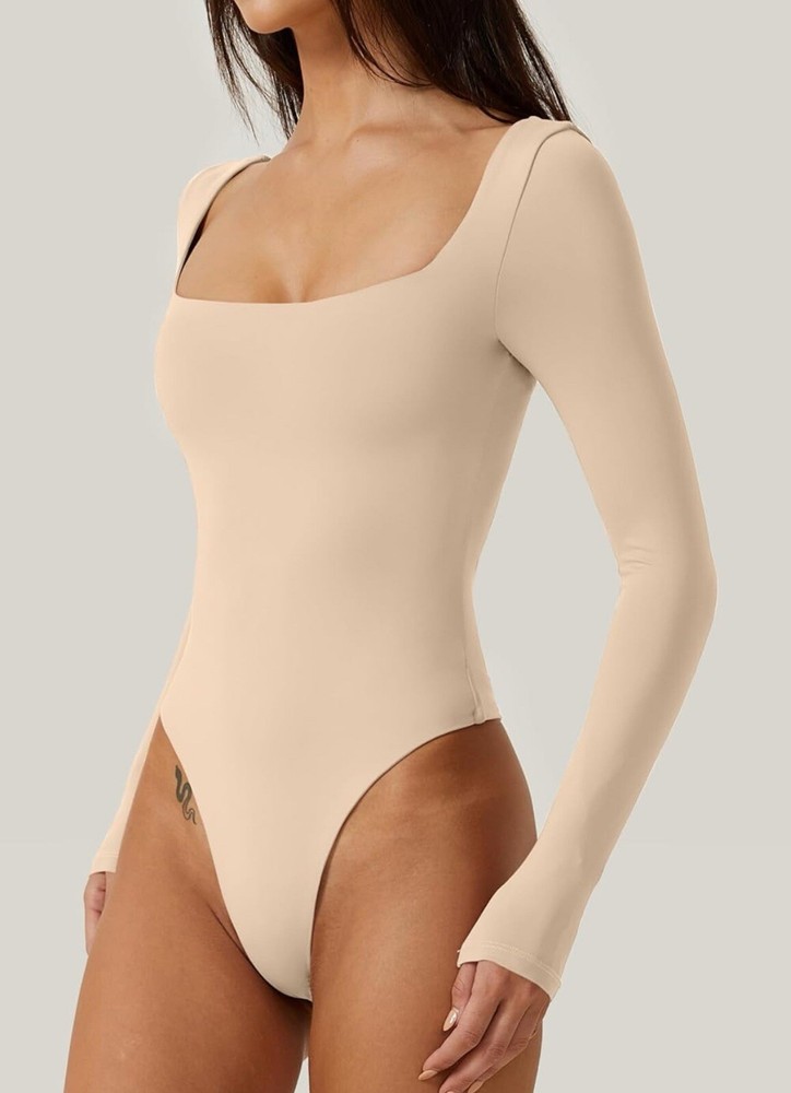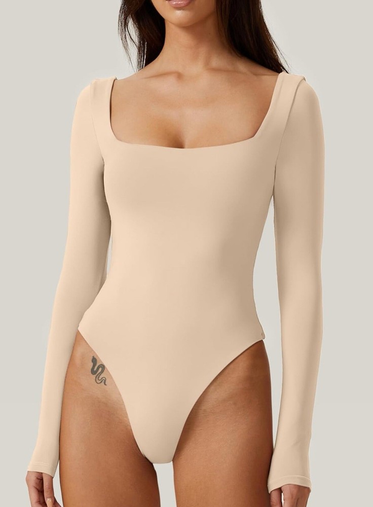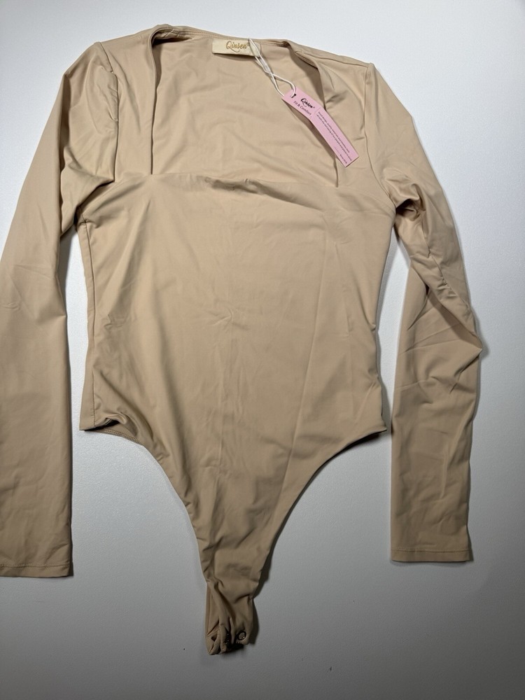 Elevate your wardrobe with this chic QINSEN bodysuit. Designed with a sexy square neckline and long sleeves, this beige bodysuit is made of a comfortable blend of nylon and elastane. The classic fitted sleeve and snap closer accents add a touch of elegance to this basic style piece. Perfect for any occasion, this bodysuit is available in size L and is suitable for regular fit. The lined feature ensures double comfort and makes it a must-have addition to your clothing collection. Get ready to turn heads with this sexy bodysuit from QINSEN.