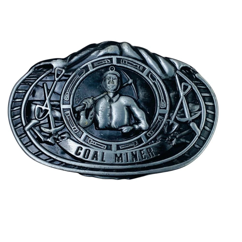 This belt buckle is a commemorative piece featuring a classic design with a "Coal Miner" theme. Made of pewter-tone metal, it measures 4.05" in width and 2.70" in height, fitting belts up to 1.65" in width. The buckle is suitable for unisex adults and has a solid pattern, making it a really nice accessory for mining or energy enthusiasts. Unique ID: QK15115.