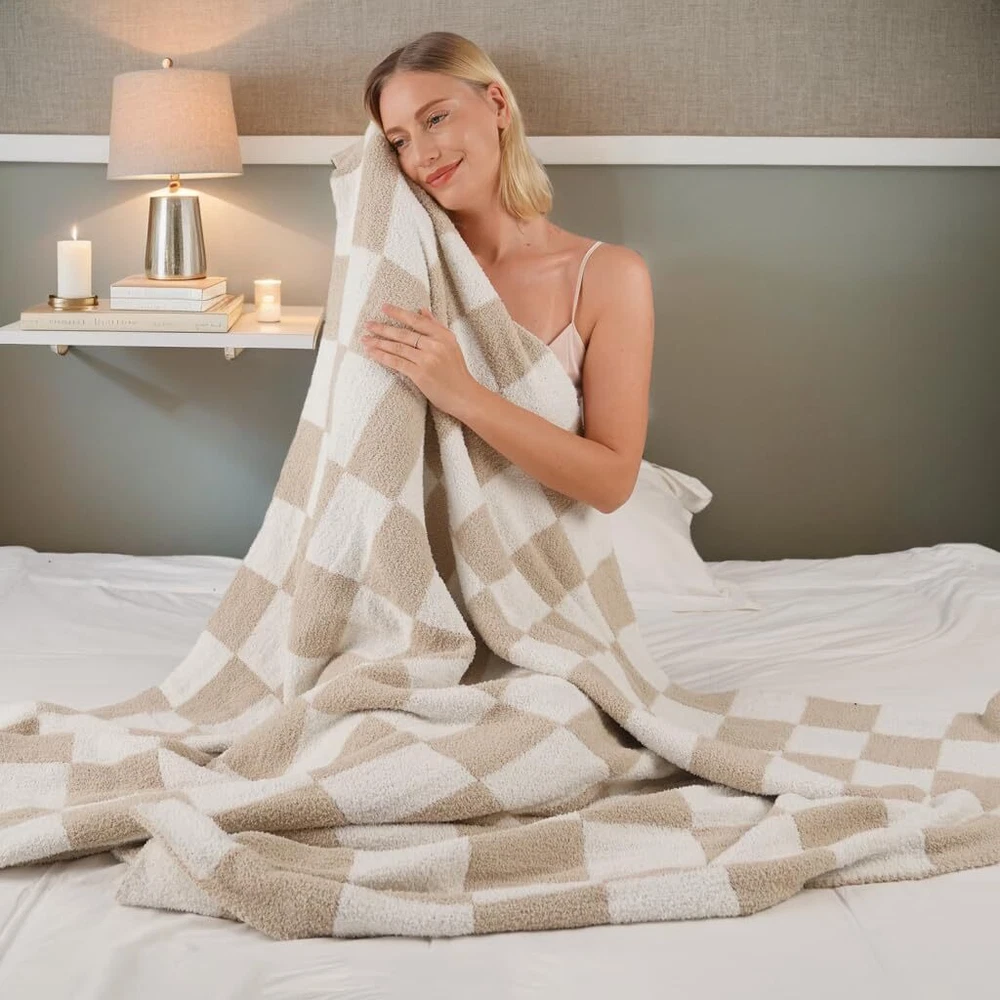 Soft Fluffy Fabric:This blanket is made of 100% microfiber material, The soft, smooth and rich velvet texture of this yarn makes the blanket very comfortable. It's sturdy and durable, doesn't pill, wrinkle, fade, and doesn't lose its luxurious softness over time. Blanket Size:50'' x 60'',suitable for relaxing nap time, watching TV, reading a book, snuggling or cuddling. Our blankets can cover on the chair ,couch or bed as a chic home decor,make your home look more vitality. Inspiration Feature: The stitching of the two colors is not monotonous, and the checkerboard-style contrasting color style is simple and reflects the high-level beauty. Add a touch of warmth to you and your house. Care Instructions:Machine wash with cold water separately on gentle/delicate cycle. Tumble dry on low heat.Reacts with dryer's heat to return to its original softness. And does not fade even after multiple washes. High Safety Standards: Our blankets are made of OEKO Standard 100 material and are OEKO-tex certified. It goes through three different quality tests during the production process to ensure that it does not contain harmful chemicals, keeping your skin and your family safe and healthy.