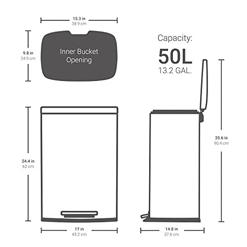 Well Designed and Engineered 50L Stainless Steel Step-On Trashcan Suitable for any area of your home, this well-designed and engineered 50L Stainless Steel Step-On Trashcan is versatile and fits seamlessly in various spaces. The Rectangle Shape design allows it to blend in perfectly in areas such as kitchens, offices, living rooms, restaurant bathrooms, bedrooms, dorm rooms, or any open space . The removable bucket liner feature allows you to keep the bag hidden from public view, maintaining a neat and clean appearance. 50L capacity with easy step-on mechanism Stainless steel construction with soft close lid closer Removable bucket liner keeps the bag hidden from sight Keeps trash orderly for a tidy space Versatile slim design suitable for many areas Make trash disposal easy and stylish with this Stainless Steel Step-On Trashcan. The removable bucket liner ensures that the bag remains hidden, contributing to a neat and organized space. The easy step-on mechanism and soft close lid closer add convenience to your waste management. OUR PROMISE: 100% Satisfaction Backed by Dedicated Customer Support Team, Worry Free Defective Replacement at No Additional Charges to You. OUR QUALITY: High-Quality Stainless Steel and ABS Construted. Our Trashcan is Build to Last! Fingerprint and Smudge Resistant Coating Make Cleaning a Breeze. OUR CRAFTSMANSHIP: Large, Wide Opening Area. Provides Easy Access for Daily Chore Work. OUR DESIGN: Modern, Stylish, Elegant, Completes and Show Case Your Home With This Missing Piece OUR VISION: Multi-Purpose, Suitable for Kitchen, Bath, School, Hotel, Airport, Construction Site, Office Space, Indoor/Outdoor, Boat, RV, and More..