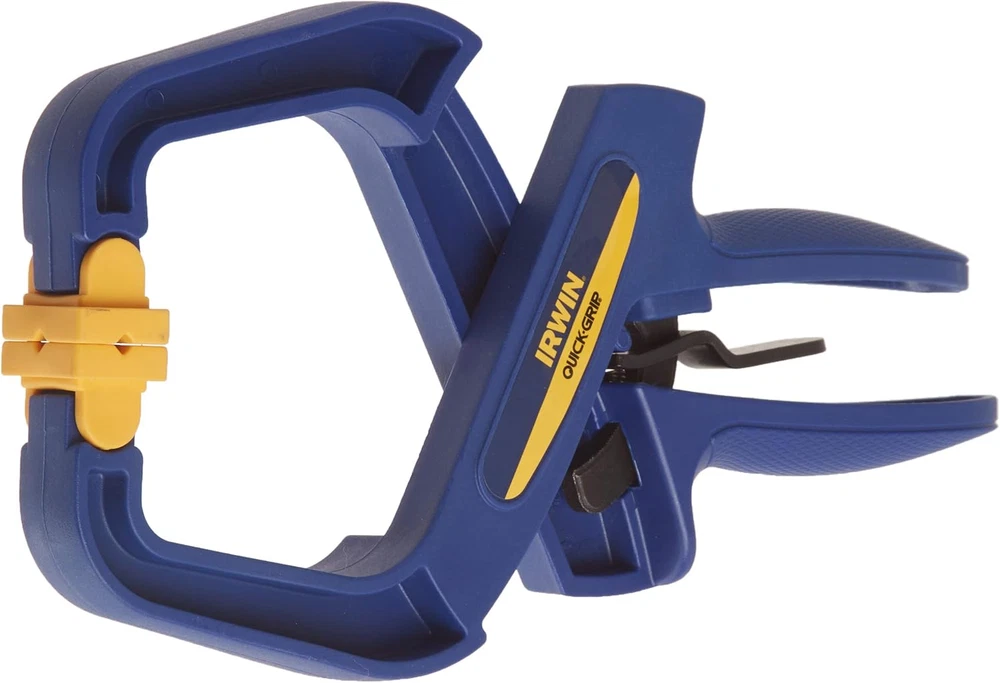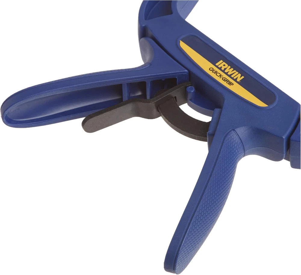 QUICK-RELEASE trigger allows for fast and easy positioning and release Ratcheting mechanism provides adjustable clamping pressure Significantly reduced hand force needed to generate clamping pressure makes these clamps more comfortable to use High-tech resin construction provides strength and durability Specially designed jaws hold odd-shaped workpieces Product Description The IRWIN QUICK-GRIP Handi-Clamp features a QUICK-RELEASE trigger that makes positioning easier while allowing the clamp to release faster. This clamp is designed to be more comfortable to use with a ratcheting mechanism that requires significantly reduced hand pressure and makes the clamp easier to adjust. Constructed of high-tech resin, the clam has specially designed jaws to hold odd-shaped workpieces. From the Manufacturer Handy is the word that springs to mind with the latest multi-purpose clamp from the makers of Quick-Grip bar clamps. Introduced at this year's National Hardware Show, the Quick-Grip Handi-Clamp curved bar clamp is designed as the answer to hundreds of quick clamping needs around the home, workshop, or job site. Whether it's used for holding down counter-top laminate for gluing in a kitchen remodel, holding a work-piece steady, or providing a "third hand" in the workshop or garage, the Quick-Grip Handi-Clamp curved bar clamp ratchets quickly and easily with a one-handed squeeze of the handle. Manufactured from durable and lightweight impact-resistant resin, the Quick-Grip Handi-Clamp curved bar clamp incorporates swivel pads that adjust instantly to any angle and shape to be clamped, and a quick-release trigger frees the work-piece rapidly. Full Lifetime Warranty - Each Quick-Grip is manufactured to be free from defects in material and workmanship for the life of the tool, except for damage caused by abuse, misuse, or alteration.