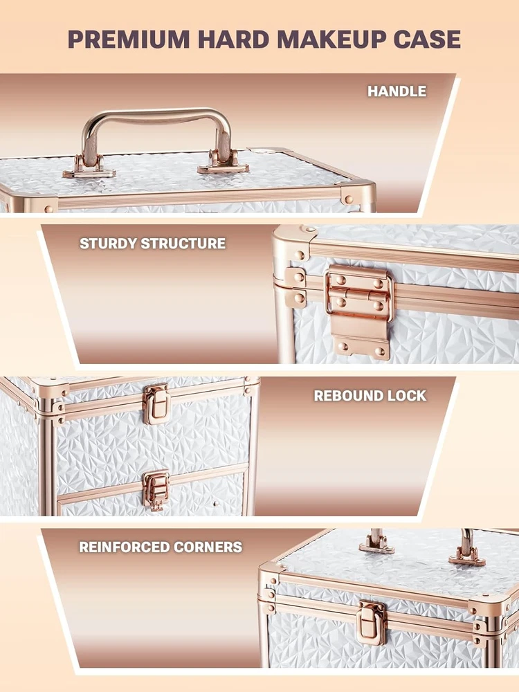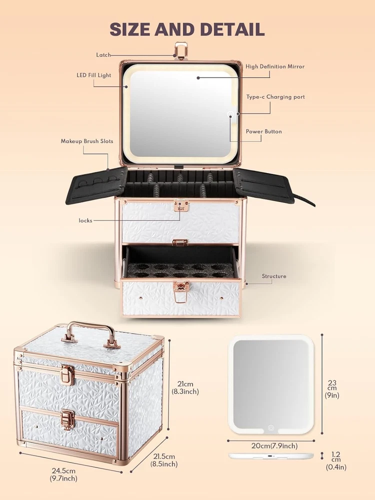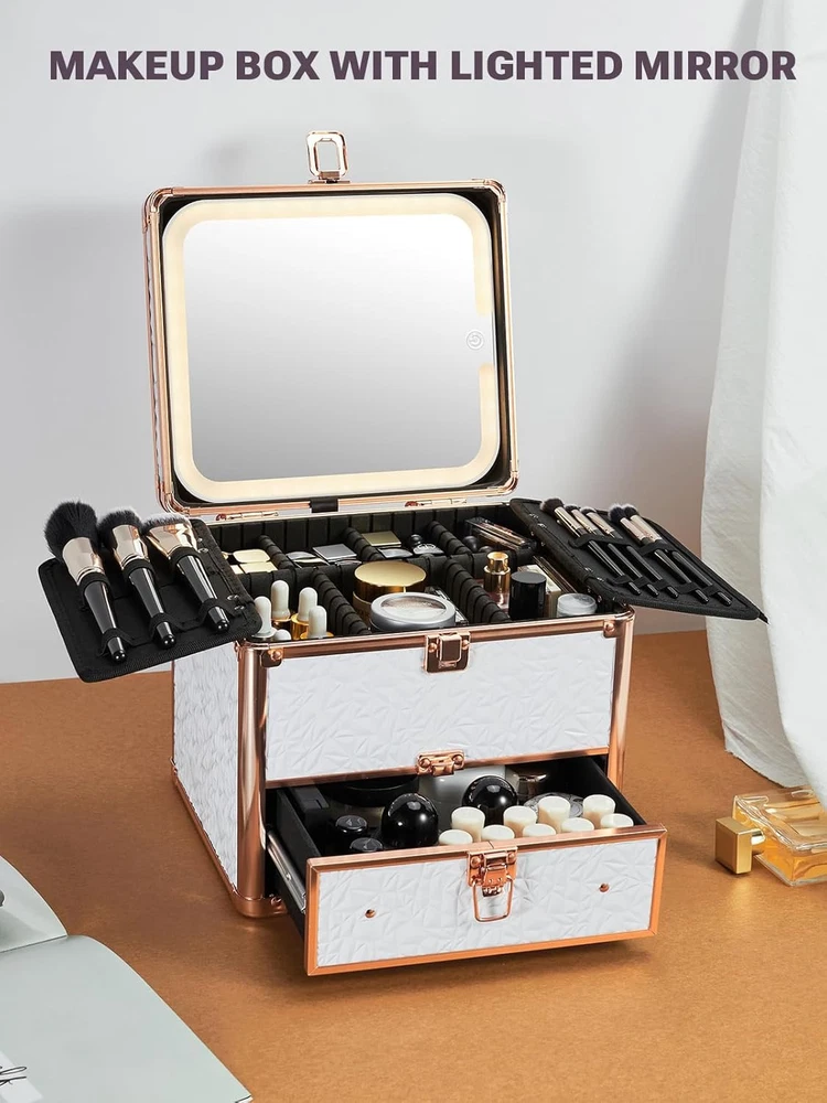 Qislee Makeup Box with Drawer and A Detachable Lighted Mirror, Bright White Description Features: Vanity Mirror with Strong Magnets: This makeup mirror has 4 hidden magnets, perfect as a wall mirror for any ferrous metal surface like lockers, fridges, toolboxes, or office cabinets, adding functionality and style Smart Lighted Mirror: This 9x7.9x0.5 inch smart light up mirror offers adjustable cold, natural, and warm light settings, plus brightness control from 0% to 100% with a touch. Perfect for makeup, it includes a 360° swivel bracket with tilt angles of 30°, 60°, and 90°, ideal for use as a desk mirror Multifunctional Makeup Organizer: This makeup case organizer has 6 detachable EVA partitions, 2 brush storage boards and 1 drawer for customizable storage. And 6 different colors are available, choose the favorite for yourself or your loved one Professional Hard Makeup Travel Case: Measuring 9.6x8.3x8.1 inches, this portable case is ideal for all makeup artists. Made of cardboard with ABS aluminum metal-reinforced corners for durability, it features a latch with a quick rebound lock Wonderful Gift Idea: This travel makeup case with LED mirror is a perfect gift for birthdays, Mother's Day, Valentine's Day, anniversaries, Halloween, Christmas, and more. Ideal as a gift for mom, yourself, wife, teacher, friends, or daughter. Product Details: Package Dimensions : 10.37 x 10.25 x 9.75 inches; 5.55 Pounds Department : Women Batteries : 1 P76 batteries required. (included) Manufacturer : Qislee Country of Origin : China Brand: Qislee Shape: Rectangular Frame Material: Metal Mounting Type: Tabletop Mount Special Feature: Lighted, Adjustable Handling We will ship all orders within 3 business day of payment. Delivery We take pride in offering fast and reliable delivery for your orders! We are committed to getting your products to you as quickly as possible. Generally, we would like to inform you that all orders will be delivered to you within 1-3 business days after processing.However, in some cases, delivery times may vary depending on the buyer's location. Especially in remote or rural areas, the expected delivery time may be extended. In such situations, we do our best to ensure that your order reaches you as quickly as possible.If there are any delays, we will be happy to contact you to explain the situation. Our goal is to enhance your satisfaction with our fast delivery times. We work diligently to ensure that your order arrives safely.Trust us and enjoy our speedy delivery! Return Policy All items qualify for returns within 30 days of receipt. Buyer is responsible for return shipping on any item that is not damaged. Feedback We take our reputation seriously, we buy and sell online, so we understand the value of trust. If you are unsatisfied with your order, please contact us and we will work with you to resolve it to your satisfaction.