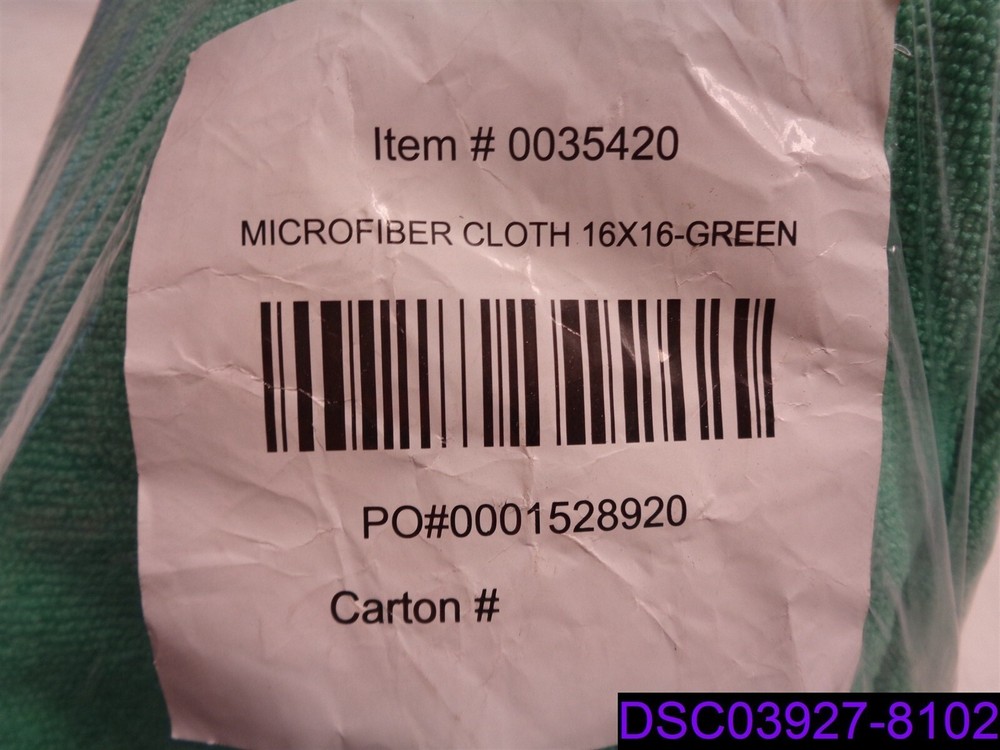This item is:_______________Qty = 12: Green 16" x 16" Microfiber Cleaning Cloth Towel P/N 0035420_____________________________________________________ This item is new, however, The original packaging may be missing or imperfect. See photos. Includes 12x what is shown in the picture. 1001 Warehouse Location:___Warehouse #1_Shelf__6273 box 423________________________________ Sales tax will be added to items shipping to locations in Kansas. _____________________________________________________________________ _____________________________________________________________________ _____________________________________________________________________ By bidding and or purchasing this item(s) you (the buyer) agree to the following terms and conditions: 1. An item is defined as the following: The unit or units purchased in the ebay listing, (it could be a single unit, multiple units, a mixture of units, a variety of units, the incorrect unit or any combination of units not mentioned). It also includes the packaging, or lack thereof, the shipping label, and any contents place in the package by error. 2. The Seller is defined as seller and/or consigner. 3. The buyer is defined as the entity that purchased the item from seller and/or consigner. 4. If the buyer does not agree to these terms and conditions then do not purchase from us. 5. All items are sold AS IS No warranty or liability is expressed or implied. 6. The buyer agrees that: All items are shipped without insurance. It is the responsibility of the buyer to let us know if they want insurance on the item. Insurance cost is $2.00 for every $50 insured, in $50 increments. The buyer agrees that if no insurance is purchased and the item is not received or received damaged that no claim shall be brought against the seller. 7. We only ship to PayPal confirmed street addresses, no exceptions. No PO Boxes, APO, FPO or similar addresses. 8. The buyer agrees that the sale is considered complete once the carrier has picked up the item from the seller. 9. The buyer agrees that if there is a dispute that arises that the dispute will be settled in the State of Kansas under the laws of Kansas. 10. The buyer agrees that the item fits the buyers purpose prior to bidding. 11. The buyer agrees to indemnify and hold harmless the seller from any and all claims arising out of any conditions or defects for the item or items that they purchased 12. We only ship to the continental United States. The shipping price quoted is for the continental United States Only. All other locations will be charged extra. Out of county buyers agree to pay any additional charges that we ask them to pay including but not limited to import duties, shipping costs, packaging costs, time costs, and other costs. If the item is shipped via ebay global shipping program these terms and conditions still apply. 13. Claims made against the carrier for non-delivery, lost in transit or any other reason shall be made solely by the buyer without aid from the Seller. 14. In the event that any clauses or phrases contained here within are ruled out by a judge, the law, a lawyer, jurors, and or any other entity all others remain in effect. 15. If any claim is brought against the Seller the buyer agrees to pay for any and all costs including legal fees, travel, time, accommodations, and other costs. Late payment will result in the seller charging interest at the maximum legal rate. 16. In any event or circumstance the maximum liability to the Seller is the purchase price plus cost of shipping plus sales tax if applicable. This amount is not subject to inflation, interest, inconvenience fee or any other price adjustment. 17. The buyer agrees there will be no refunds for any reason outside of the Ebay return policy. 18. The buyer understands that our items are wholesale, overstock, unclaimed, foreclosure purchase or salvage goods. Most boxes have been opened for inspection and photos. If items are listed as new they may not come with original packaging. 19. The buyer agrees that they are trained, licensed, qualified, and understand how to properly use, dispose of and handle the product in accordance with law and regulations. 20. The buyer agrees that if any part of these terms and conditions is determined to be void that it does not void or alleviate the enforcement of the remainder of this contract. 21. seller and/or consigner is not an authorized distributor, reseller or representative of the products featured on this website. All product names, trademarks, brands and logos used on this site are the property of their respective owners. The depiction, description or sale of products featuring these names, trademarks, brands and logos is for identification purposes only and is not intended to indicate any affiliation with or authorization by any rights holder.