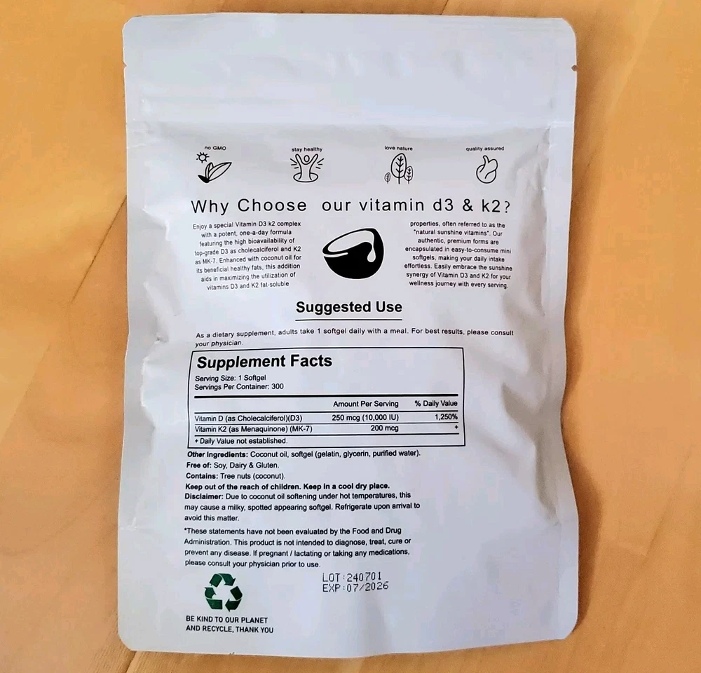 Vitamin D3 10,000 IU + K2 (MK-7) 200 mcg Quantity: 300 softgel capsules Exp: 7/2026 Brand New, manufacturer-sealed, see photos FREE standard shipping with USA!