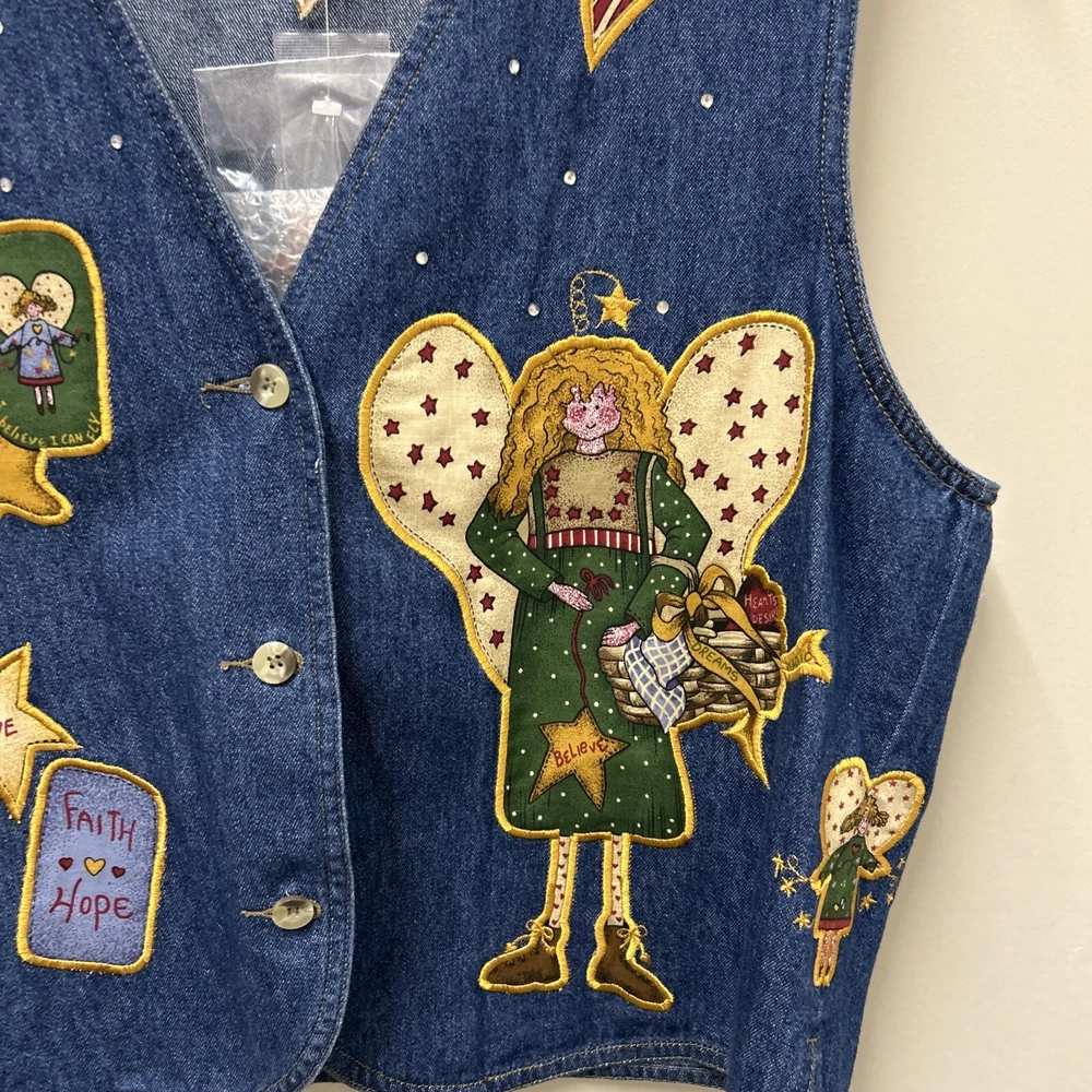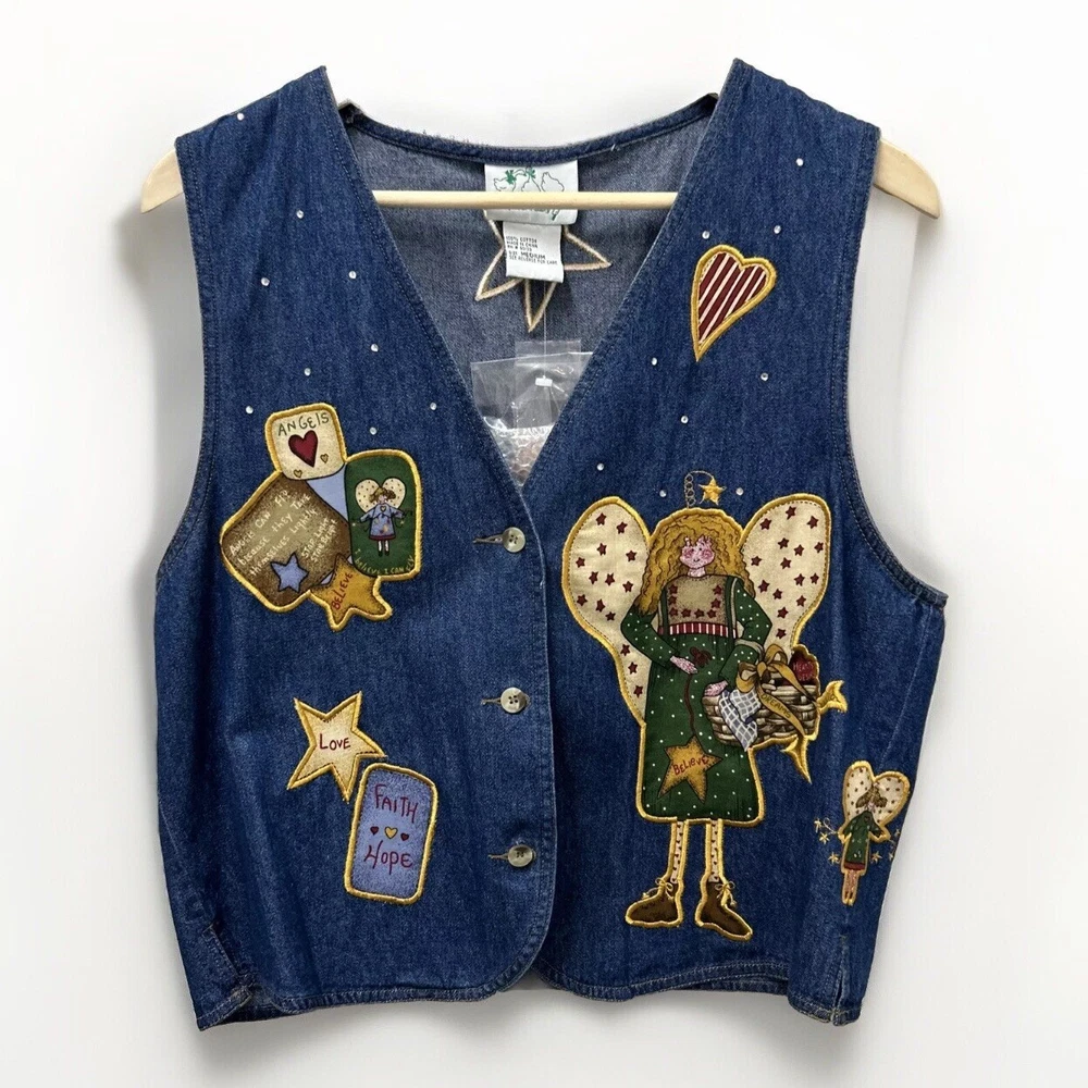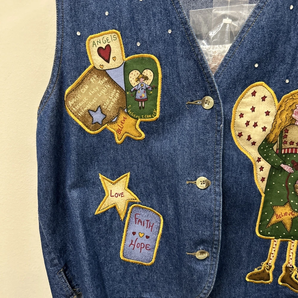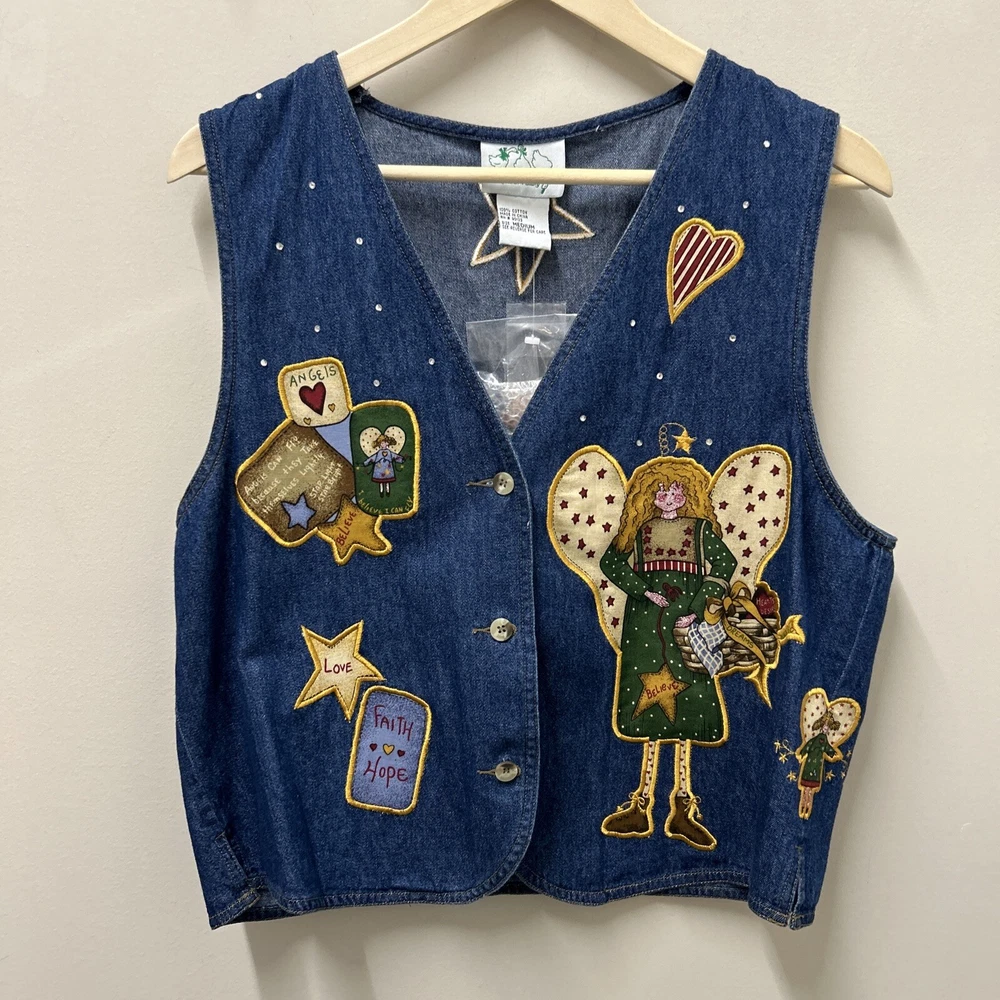 Color: Blue Size: Large Accents: Patches Size Type: Regular Season: Fall, Spring, Winter UPC: Does Not Apply Brand: Quacker Factory Fabric Type: Denim Jacket/Coat Length: Short Closure: Button Country/Region of Manufacture: China MPN: Does Not Apply gtin13: Does Not Apply Insulation Material: N/A Fit: Regular Type: Jacket Personalize: No Theme: Angels, Christmas, Classic, Cottagecore, Grannycore, Holiday Occasion: Business, Casual, Travel Lining Material: N/A Sleeve Length: Sleeveless Pattern: Angel & Stars Garment Care: Machine Washable Modified Item: No Department: Women Vintage: No Outer Shell Material: 100% Cotton Handmade: No Style: Vest Features: Extra Buttons