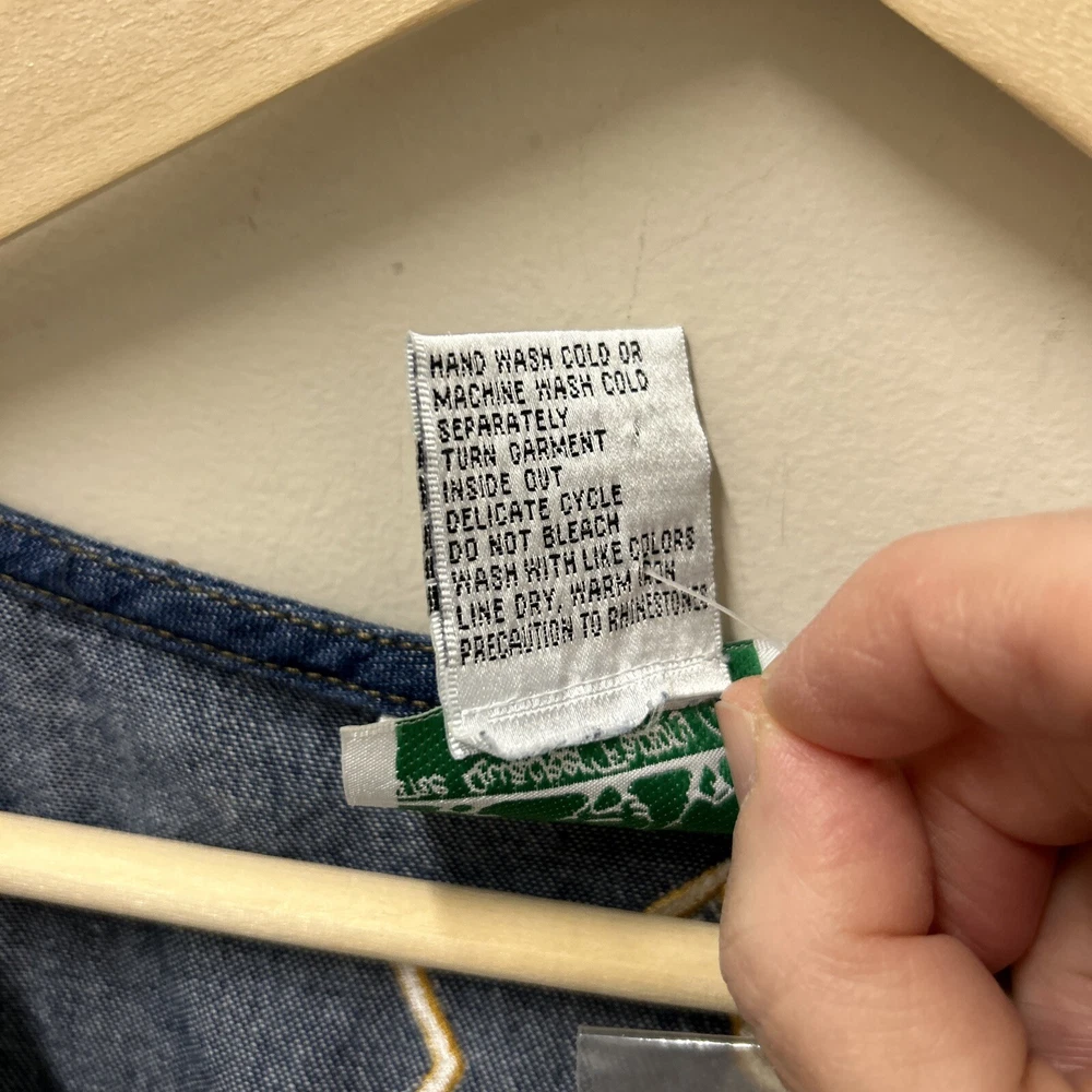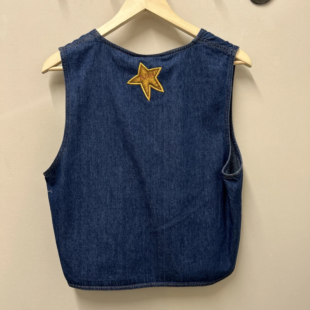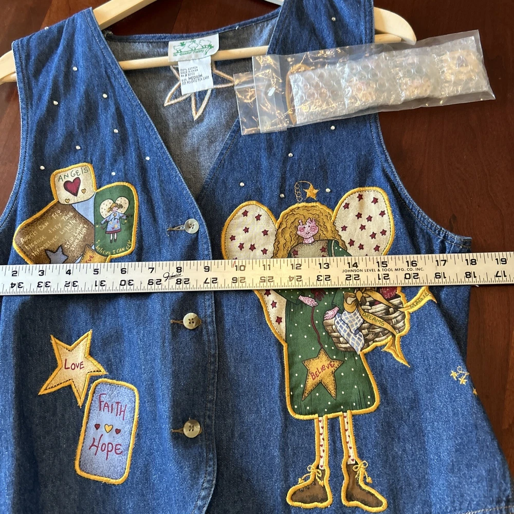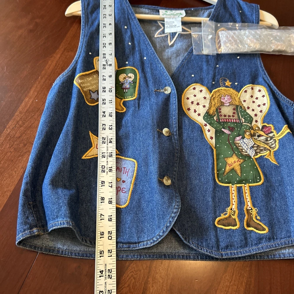 Color: Blue Size: Large Accents: Patches Size Type: Regular Season: Fall, Spring, Winter UPC: Does Not Apply Brand: Quacker Factory Fabric Type: Denim Jacket/Coat Length: Short Closure: Button Country/Region of Manufacture: China MPN: Does Not Apply gtin13: Does Not Apply Insulation Material: N/A Fit: Regular Type: Jacket Personalize: No Theme: Angels, Christmas, Classic, Cottagecore, Grannycore, Holiday Occasion: Business, Casual, Travel Lining Material: N/A Sleeve Length: Sleeveless Pattern: Angel & Stars Garment Care: Machine Washable Modified Item: No Department: Women Vintage: No Outer Shell Material: 100% Cotton Handmade: No Style: Vest Features: Extra Buttons