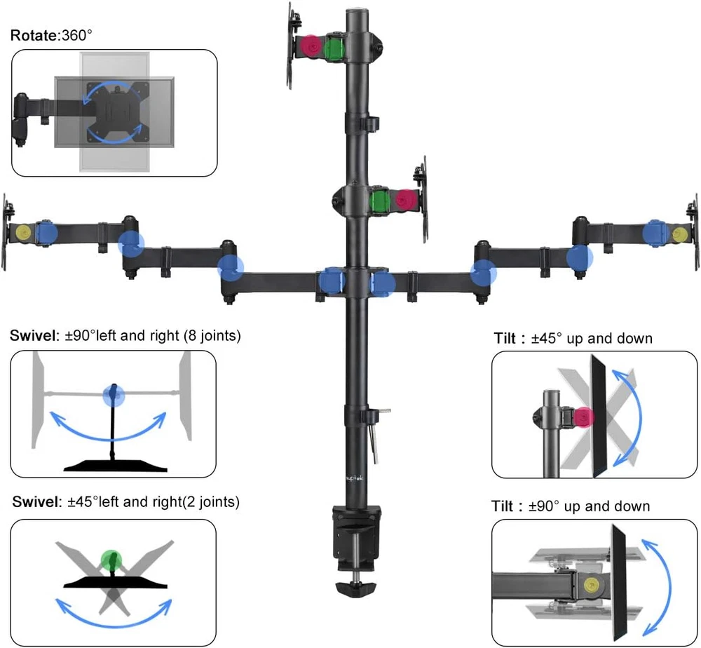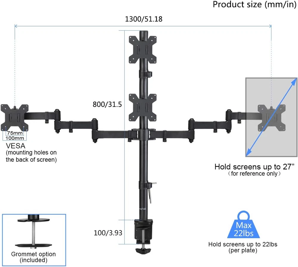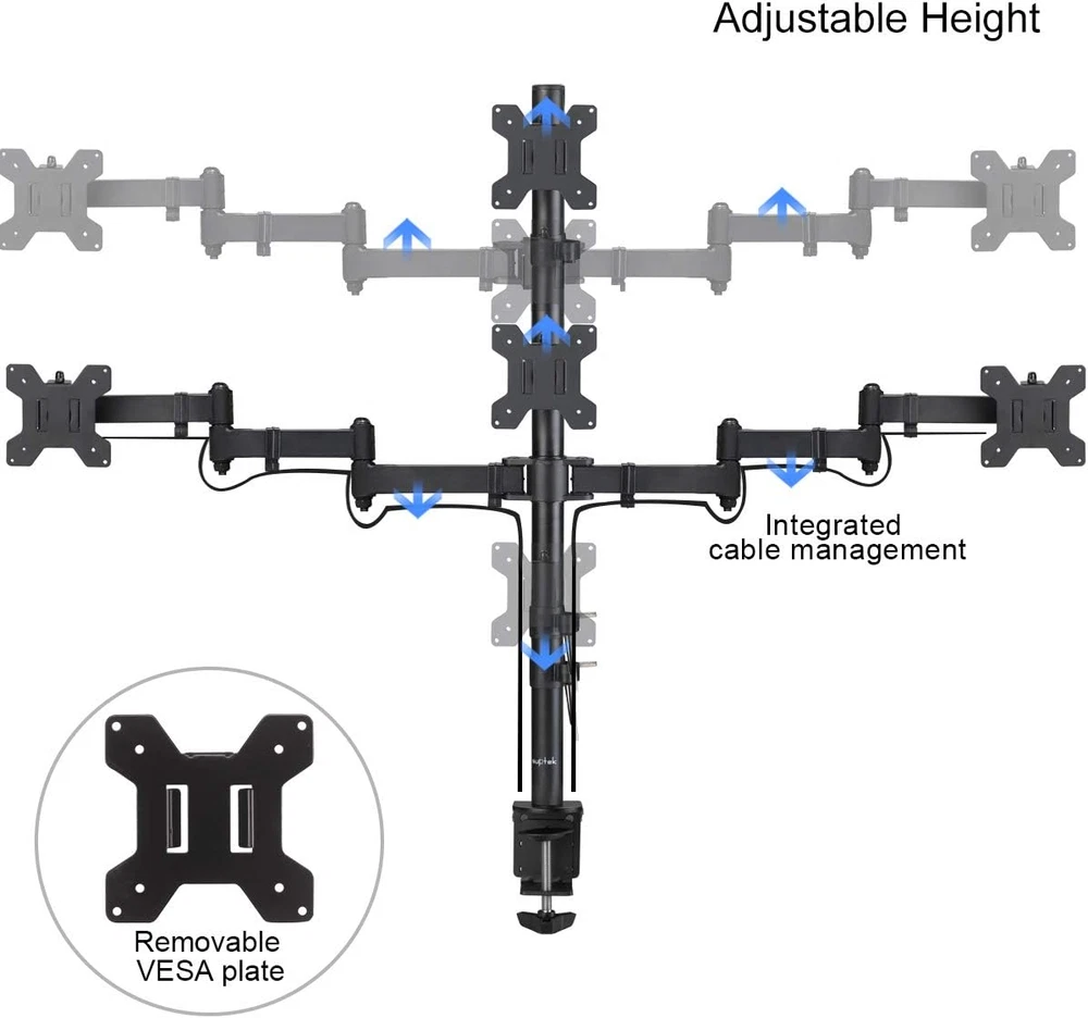 Store New Arrivals Add to Favorite View Feedback Contact Quad LED LCD Monitor Stand up Desk Mount Extra Tall 31.5 Inch Pole Heavy Duty Fully Adjustable Stand for 4 (3+1) / Four Screens up to 27 Inch (MD6864) Description Item model number MD6864 Maximum Compatible Size 27 Inches Mounting Type Tabletop Mount Color 4 (3+1) Quad plates-desk mount-80cm stand Item Weight 15.53 pounds Material Alloy Steel Material Type Alloy Steel Manufacturer Part Number MD6864 Compatible Devices Monitor Movement Type Rotate, Swivel, Tilt Minimum Compatible Size 27 Inches Is Discontinued By Manufacturer No Product Dimensions 21.54 x 9.45 x 3.7 inches Size 4 monitor plates - desk clamp Compatibility - Quad monitor mount ideal for most screens up to 27" (not for three 27"curved monitors in horizontal position) and 22lbs each with 75x75mm or 100x100mm backside mounting holes. Fully aticulation - Rotate 360°, tilt ±90° up and down, swivel ±90° left and right (middle plates tilt ±45° up and down, swivel ±45° left and right), extra tall height adjustment along the center pole. Two install options - C-clamp and optional grommet base (fits desk up to 4" thickness) save your valuable desk space. Integrated cable management - Keeps your desk tidy and clean by organizing your power and AV cables in detachable cable clips. Easy installtion - Step-by-step user manual and organized hardware kit for hassle free mounting. Product Description Monitor Mount/Stand Raise your monitors to optimal height according to your different needs. Ergonomically designed to encourage proper sitting or standing posture to help relieve stress on your neck, shoulder and back. This monitor mount can raise your monitors to an ergonomic eye level position, which helps you adjust your sitting or stand posture to reduce neck and back pain. You can easily adjust your monitors to an optical angle with full motion adjustment. You could also easily share your screens with others. Improve your working and life from now! Four VESA plates, each holds screen with 75mm or 100mm VESA holes. 800mm pole raises your monitor by 800mm high at most. Rotate 360°, tilt ±90° up and down, swivel ±90° left and right, to meet all of your needs (middle plates tilt ±45° up and down, swivel ±45° left and right). Each plate holds screen up to 22lbs, up to 27” size. Integrated cable management and tool holder keeps your desk tidy and clean. C-clamp and optional grommet base save your valuable desk space. Tool holder It is designed to keep your essential tools. If you need to loosen or tighten the arm, you could adjust easily with these tools. Cable Management With integrated cable management, you won't be troubled by messy wires any more. It is specially designed to save more space and ensures an elegant and tidy look. Two Install Options This heavy-duty C-clamp secures to the edge of a desk or table. The portion of the clamp in contact with the top surface of you desk is lined with thin padding to protect the desk surface from scratching. An optional grommet base is included. ABOUT US We offer the best prices around on high quality products. Our E-store includes media such as books, movies, music and games while offering electronics, toys, sporting apparel, clothing, tools, general home, garden items and more. SHIPPING We are always working hard to ensure your package arrives as soon as possible. Please understand that some factors like weather, high postal traffic, and the performance of shipping companies are outside of our control. We offer free shipping to the lower 48 states and ship within 2 business days of payment, usually sooner. We do not accept P.O. Boxes. Please provide a physical address. For shipping outside of the continental USA, we only use eBay's Global Shipping Program.The item is shipped to KY and then sent to the rest of the world. International customers are responsible for all duties and taxes. Continue to check out in order to calculate costs for shipping the item to your country. Messages regarding eBay's Global Shipping Program MUST be directed at eBay EXCLUSIVELY. RETURNS We offer a 30-Day Return Policy on items which you are not completely satisfied with. You have the option for a full-refund or an exchange of the item. No returns are available on items shipped outside of the USA. PAYMENT We accept PayPal. CONTACT US This page content is yet to come Please ad us to your favorite seller and visit again later Thank You CUSTOMER SATISFACTION We try our very best to make sure every customer is completely satisfied. If there's a problem, message us! We're happy to help. WE ACCEPT Copyright © 2021 AutoDS. | All Rights Reserved