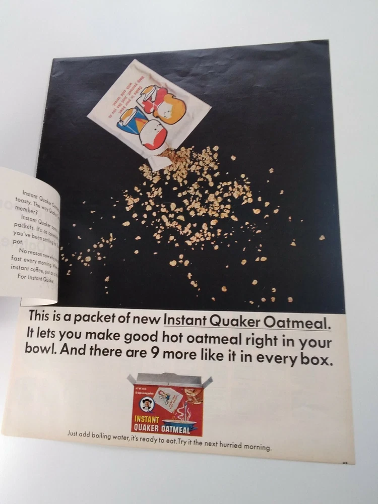 Date of Creation:1966Color:Multi-colorCountry/Region of Manufacture:United StatesType of Advertising:Print AdModified Item:NoOriginal/Reproduction:OriginalBrand:QuakerTheme:CerealSeller Notes:“good, slight wear and marks, bagged and boarded, please see pics”