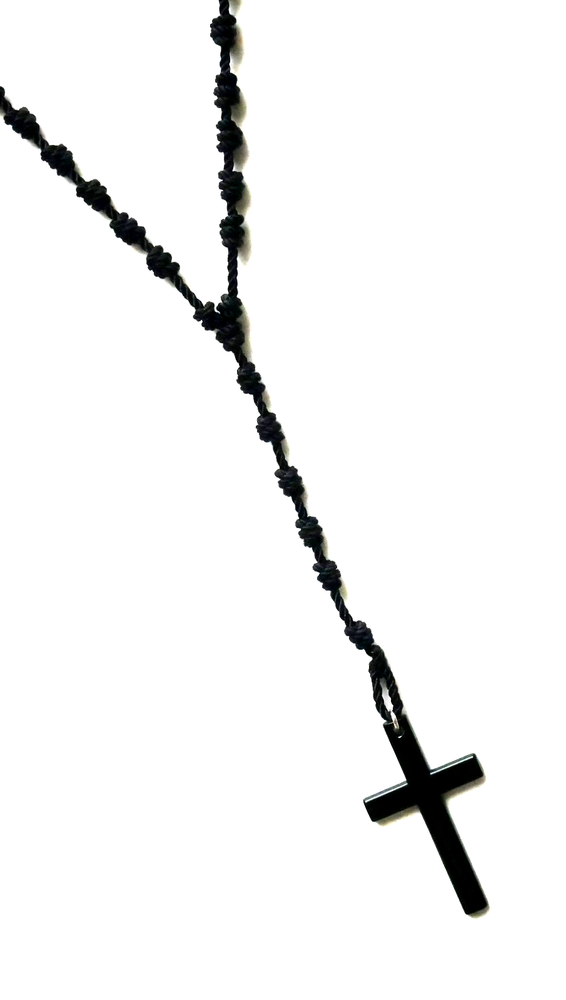 Quality Black Knotted Cord ROSARY with Black Cross and Pouch. SIZE/LENGTH: 20" including the cross. MATERIAL: Made with nylon cord. CROSS: Beautiful black enameled Cross measures 1-7/8" x 1-1/8" Very good quality! NOTE IT CAN BE USED AS A NECKLACE ROSARY Comes with a FREE beautiful black or blue velveteen pouch. Please feel free to email me with questions about this item. Also please check my other listings. I am always available to answer your questions promptly. Buy from us with confidence.