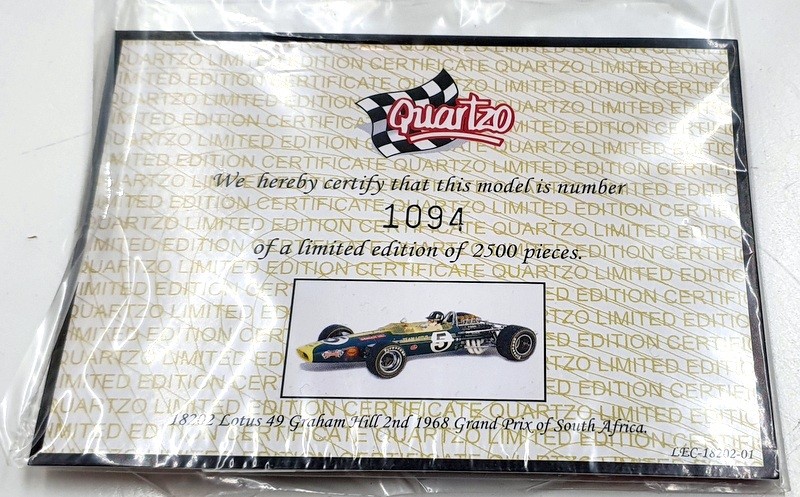 Quartzo 1/18 Scale Diecast 18202 - Lotus 49 Graham Hill 1968 South Africa GP #5 Contact Us Home About Us Feedback Contact Us Add to favourites Quartzo 1/18 Scale Diecast 18202 - Lotus 49 Graham Hill 1968 South Africa GP #5 click thumbnails above to enlarge Shop Home Our Feedback Ask a Question Product Description 1/18 Scale Diecast Model by quartzo The Model Is In NEAR MINT Condition. The Box Is In GOOD Condition, worn, cellophane has come away from box at the top - SEE IMAGES FOR BEST DESCRIPTION AND GRADING CONDITIONS Product Details Scale 1/18 Material Diecast Brand quartzo EAN 7427264846732 Additional Info GRADING CONDITIONS MINT - The item is in perfect condition. NEAR MINT - Almost perfect, any imperfections will be extremely minor. EXCELLENT - The item will have had very careful use, with only small imperfections. GOOD - The item will have had more use, showing obvious imperfections. FAIR - The item will have heavy signs of wear, showing major imperfections. SPARES or REPAIR - The item will be in a poor condition. Payment Shipping Returns About Us Methods of Payment Our preferred method of payment is Paypal. Any questions please ask! Thanks. WORLDWIDE MAIL-ORDER SPECIALISTS Shipping within the UK is FREE OF CHARGE - Plese see the eBay postage tab for other worldwide shipping charges. We ship from our warehouse is the UK. We ship worldwide everyday using a Tracked / Signed For service. Over 30 years of experience shipping collectible models worldwide - you can trust our service. Any questions, please ask. Thanks for looking ! Returns We hope you are completely satisfied with your purchase. In the unlikely event that there is a problem / fault with the item we will happily provide you with a refund (excluding returns postage). About Us R.M.Toys Ltd is a family led company with over 50 years worth of experience specialising in high quality collectable models & worldwide delivery. We have continued to expand and develop as the retail market and technology has evolved and we are in no doubt we will need to continue with that trend so we hope we have been able to showcase our service and provide you, our customer, with everything you have required. Our aim is to ensure no matter what the model, we will provide an excellent service experience. To us, this means great availability, excellent customer service as well as quick & secure delivery, to anywhere across the world. All that is left to say is Thank You for taking the time to read our page and using our company to assist with your collection and gift needs - every order placed is gratefully received and as important to us as the next. Kind Regards The RM Toys Team R.M.Toys Ltd - All Rights Reserved || Design by Tapika Store The Model Is In NEAR MINT Condition. The Box Is In GOOD Condition, worn, cellophane has come away from box at the top - SEE IMAGES FOR BEST DESCRIPTION AND GRADING CONDITIONS