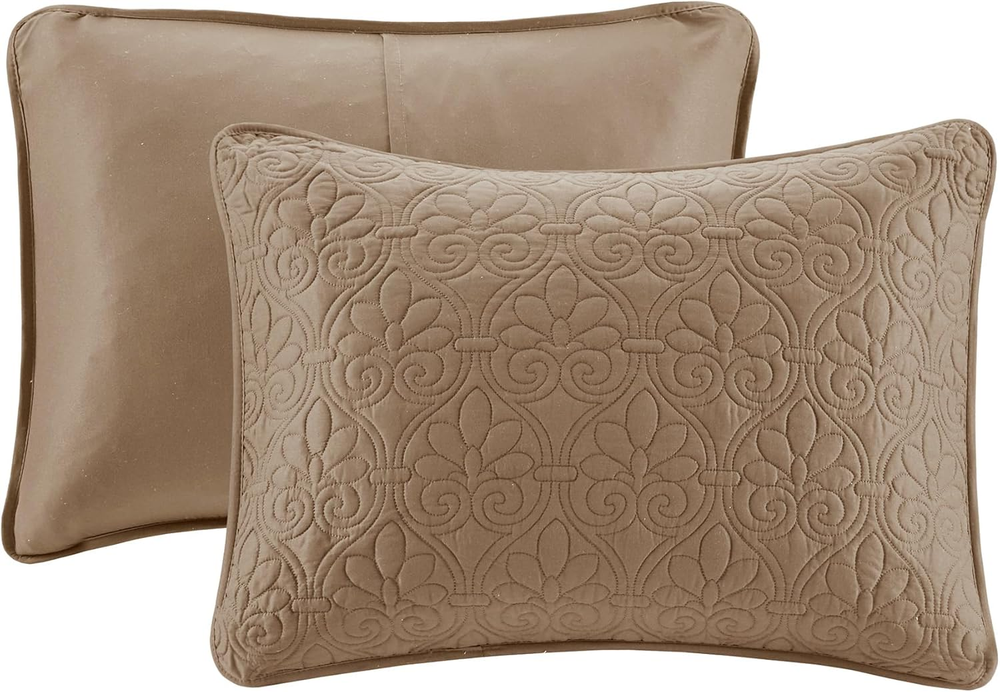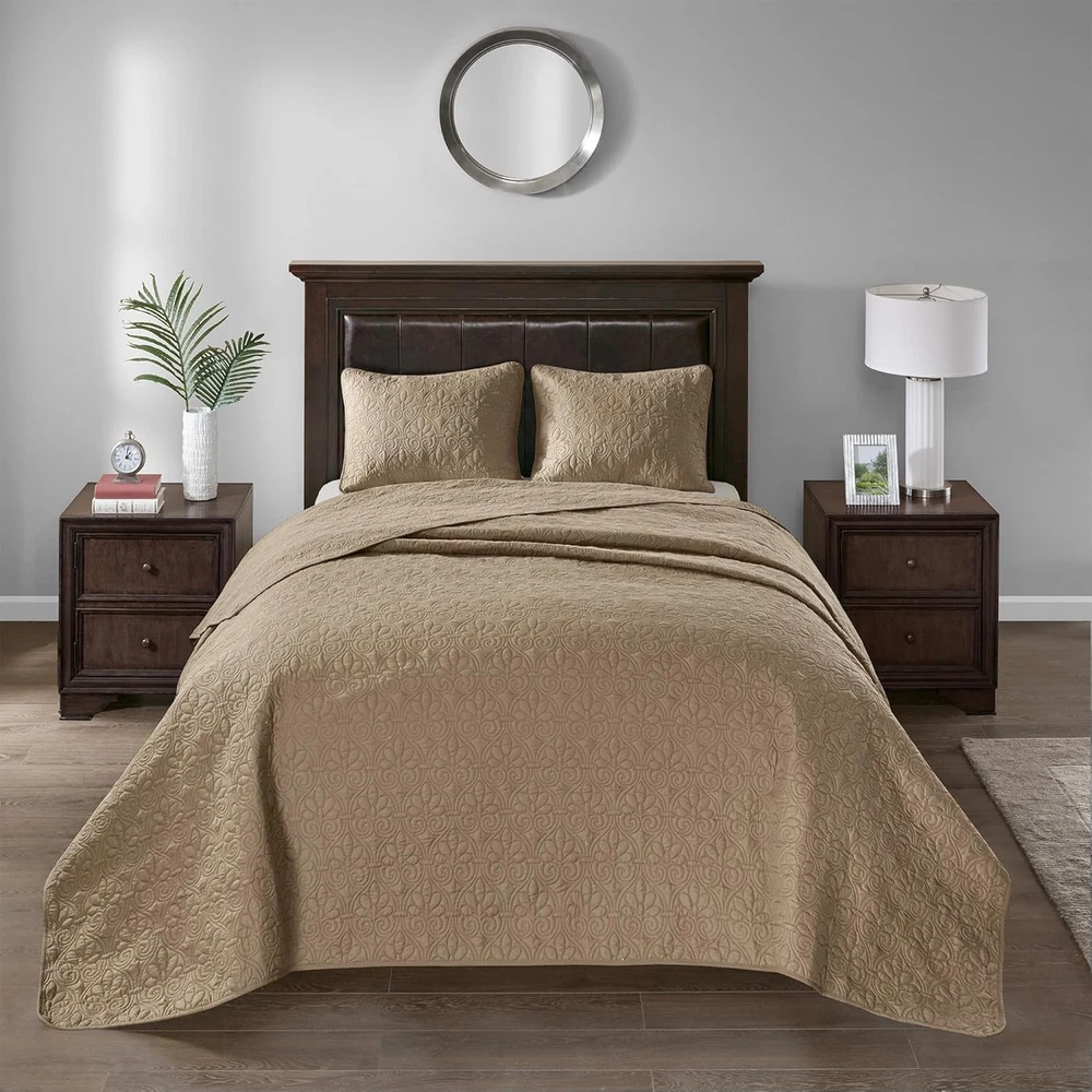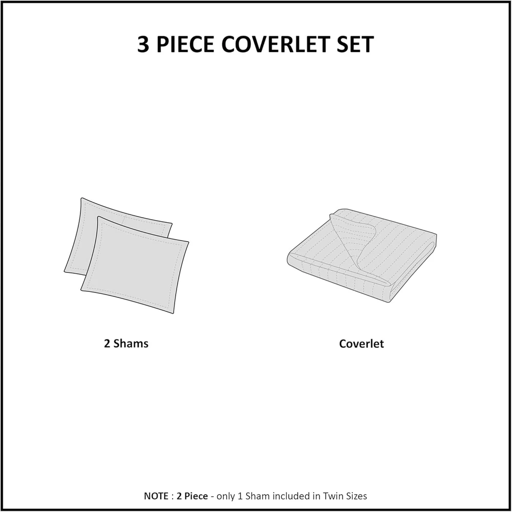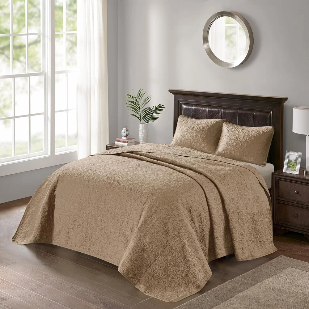 100% Microfiber Face & Reverse, Filling: 90% Cotton, 10% Olefin Madison Park Quebec Reversible Bedspread Set is the perfect classic update to your bedroom décor. Bedspread dimension is oversized to drape better on high depth mattress The classic stitch pattern pairs easily with your existing decor and will sure to add a new decorative element to your bedroom Naturally lightweight fabric perfect for summer use or layer it on for cold weather Set includes: 1 Bedspread: 120"W x 118"L, 2 King Shams: 20"W x 36"L Care instructions: machine washable The Madison Park Quebec Reversible Bedspread Set offers a charming cottage-inspired update to your bedroom. The reversible bedspread and shams (1 in Twin/TwinXL) flaunt a classic stitch pattern that creates a rich depth and texture on the face of the bedding set. Prewashed cotton filling provides added comfort and durability, while the oversized dimensions allow the bedspread to drape better.