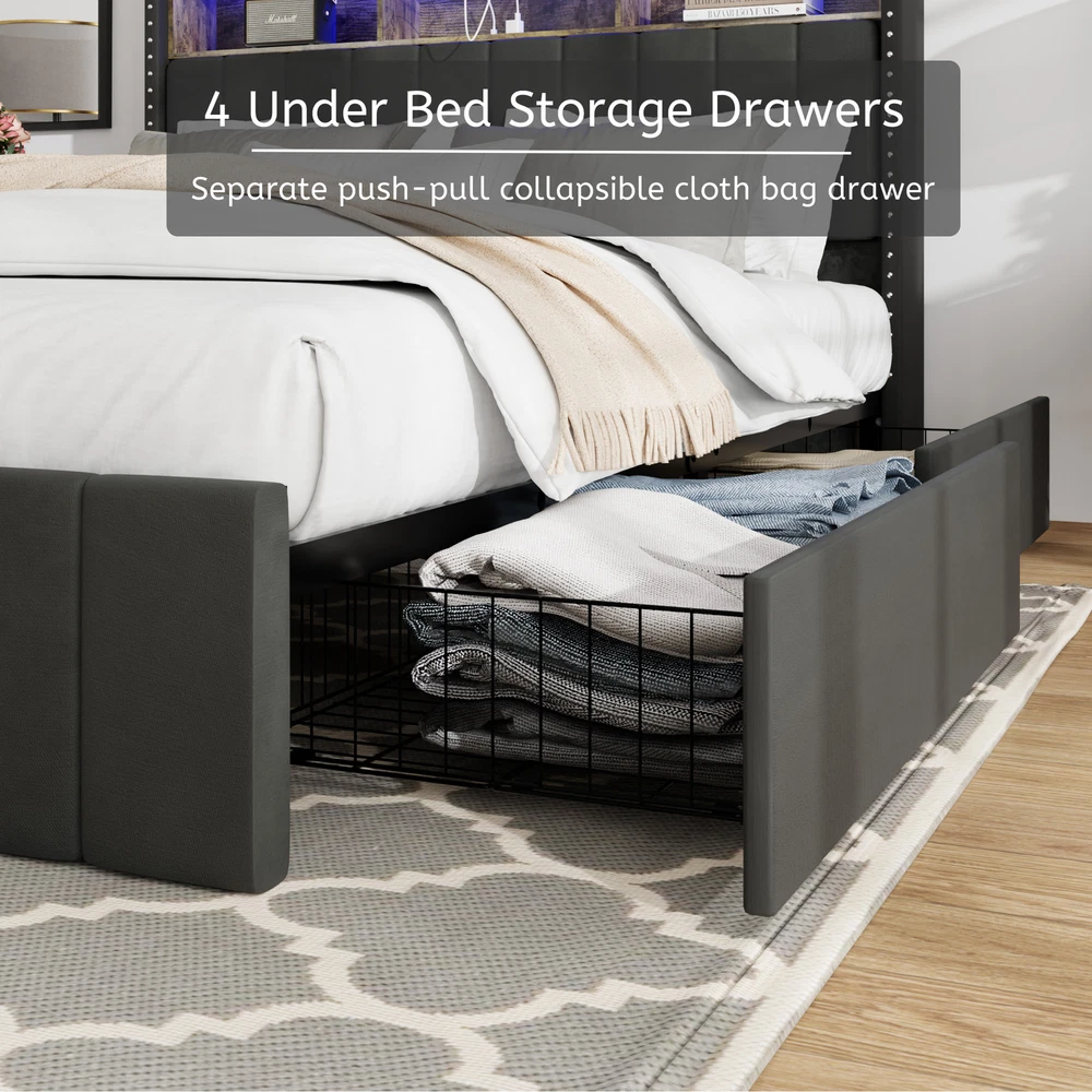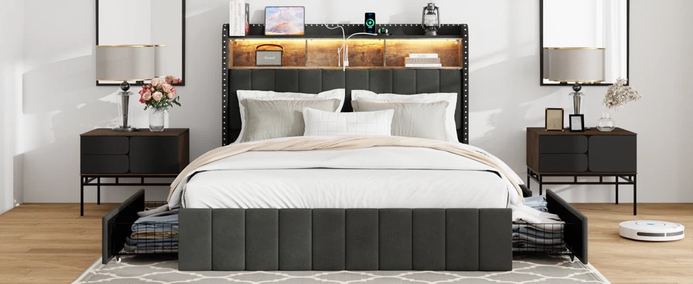 Brand Unbranded Item Length 65.5 Item Width 18.70 Item Height 10.60 Color Antique Gray Frame Material Fabric Metal Type BED FRAME Compatible Mattress Size As described Diamond-ring-1 Simple life Queen Bed Frame with Storage Headboard, Wooden Bed Frame with 47.2" Bookcase Headboard, 4 Storage Drawers & Charging Station, No Box Spring Needed/Noise Free/All-Metal Support, Vintage Gray 【Large-Capacity Storage Bookcase Headboard】 Storage shelves on the headboard not only provides you with large storage space, but also makes it convenient for you to place or retrieve commonly used items such as books, phones, alarms, etc. It is a very practical design. 【Practical Built-in Charging Station】The storage headboard is equipped with a built-in charging station, including 2 AC Outlets, a USB port and a type-C port, allowing you to charge various electronic devices within easy reach. 【4 Lockable Storage Drawers】Four under bed storage drawers serve as hidden storage spaces, providing you with more storage space and making your bedroom look clean and tidy. The drawer can be fixed to the bedside with a latch to prevent it from slipping out. Multi-Function RGB LED Light: Enhance your home experience with the bed frame's RGB LED light strip. Easily personalize the LED color, brightness, modes, and timing functions with mobile app. Clear instructions walk you through the straightforward setup process, allowing you to craft a dynamic and tailored ambiance to suit various styles and occasions Sturdy Structure & No Box Spring Required: The queen size platform bed frame features a combination of an ultra-durable metal frame and wooden slats, ensuring even support and superior weight distribution. With a weight capacity of 1000 lbs, it offers a strong sense of security and promotes restful sleep without the need for a box spring Item Specifics Brand Unbranded Item Length 65.5 Item Width 18.70 Item Height 10.60 Color Antique Gray Frame Material Fabric Metal Type BED FRAME Compatible Mattress Size As described Payment Returns Diamond-ring-1 Simple life DESCRIPTION PAYMENT SHIPPING RETURN POLICY CONTACT US Shop Category Store Home Other Hot Item Delivery New List Item Help & Info Payment Policy Shipping Policy Return Policy FAQ About Us Queen Bed Frame with Storage Headboard, Wooden Bed Frame with 47.2" Bookcase Headboard, 4 Storage Drawers & Charging Station, No Box Spring Needed/Noise Free/All-Metal Support, Vintage Gray 【Large-Capacity Storage Bookcase Headboard】 Storage shelves on the headboard not only provides you with large storage space, but also makes it convenient for you to place or retrieve commonly used items such as books, phones, alarms, etc. It is a very practical design. 【Practical Built-in Charging Station】The storage headboard is equipped with a built-in charging station, including 2 AC Outlets, a USB port and a type-C port, allowing you to charge various electronic devices within easy reach. 【4 Lockable Storage Drawers】Four under bed storage drawers serve as hidden storage spaces, providing you with more storage space and making your bedroom look clean and tidy. The drawer can be fixed to the bedside with a latch to prevent it from slipping out. Multi-Function RGB LED Light: Enhance your home experience with the bed frame's RGB LED light strip. Easily personalize the LED color, brightness, modes, and timing functions with mobile app. Clear instructions walk you through the straightforward setup process, allowing you to craft a dynamic and tailored ambiance to suit various styles and occasions Sturdy Structure & No Box Spring Required: The queen size platform bed frame features a combination of an ultra-durable metal frame and wooden slats, ensuring even support and superior weight distribution. With a weight capacity of 1000 lbs, it offers a strong sense of security and promotes restful sleep without the need for a box spring Item Specifics Brand : Unbranded Item Length : 65.5 Item Width : 18.70 Item Height : 10.60 Color : Antique Gray Frame Material : Fabric Metal Type : BED FRAME Compatible Mattress Size : As described Payment Returns All rights reserved.