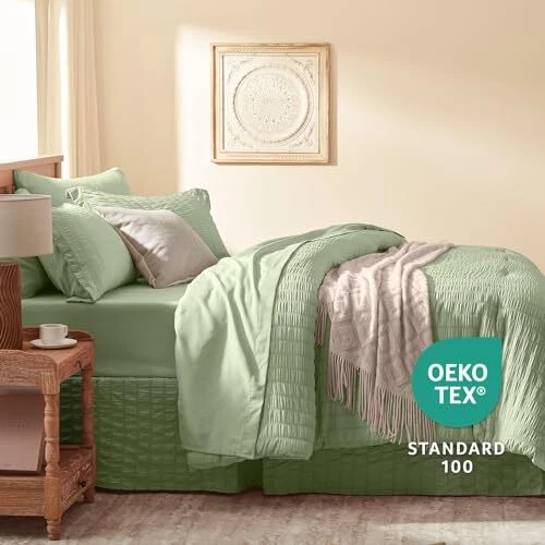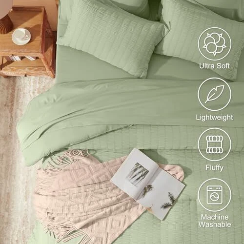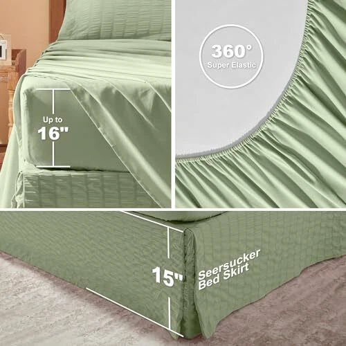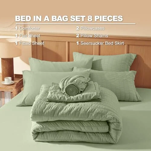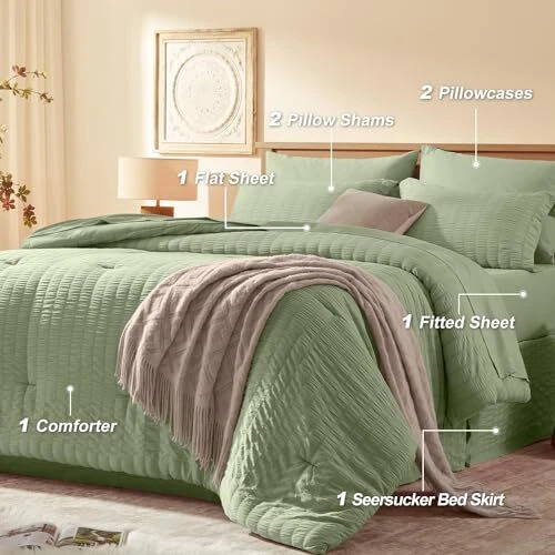 Queen Comforter Set 8 Pieces, Seersucker Bed in a Bag Queen, Sage Green