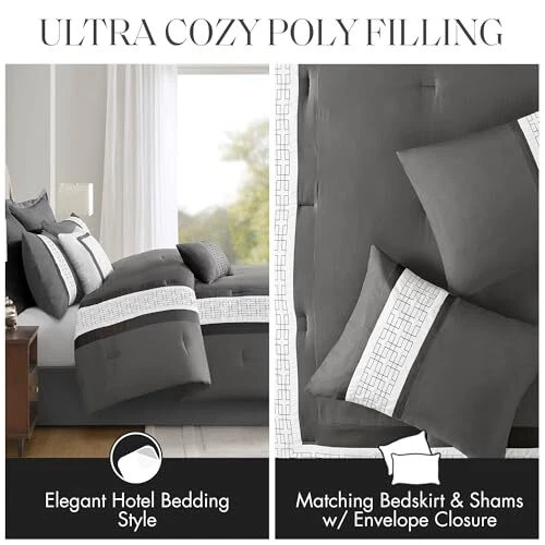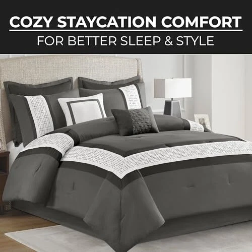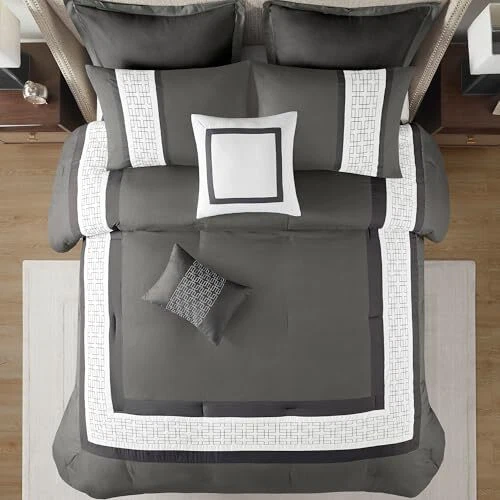 Menu 1. We require immediate payment. 2. We currently accept payment via eBay managed payments only. 3. Once payment is cleared, we will dispatch your shipment within 1-3 business days. Please refer to the "Shipping" tab for more information regarding shipping speed to your destination. Queen Comforter Set Hotel Style Comforters for Queen Size Bed, Pieced & Embroidered Border, All Season Comforters Queen Size Bed Set, Shams & Bedskirt, Powell, Queen Dark Grey 8 Piece Product description Microfiber Hotel Bedding Style: Transform your home into a luxurious retreat with our deluxe hotel-style bedding set, featuring elegant embroidery and a pieced border for a chic, modern update. Bedskirt, and elegant décor pillows are included to complete the look Comfort & Luxury: Experience a luxurious staycation with our hotel-style comforter set. The ultra-soft brushed microfiber and plush, lofty poly-filling provide cozy comfort and warmth, making it perfect for all seasons Quality Feel - The design features bartacking to keep the fill evenly distributed & prevent clumping, ensuring a smoothly comfortable feel and reliable warmth for perfect snuggles. Includes 2 decorative pillows & a bedskirt for added comfort and elegance WHAT IS INSIDE? - 1 Full/Queen Comforter: 90"W X 90"L, 2 Standard Shams: 20"W X 26"L. 2 Decor pillows 18"W x 18"L (1), 12"W x 16"L. 2 Euro Shams 26"W x 26"L (2). 1 Bedskirt 60"W x 80"L + 15"D. Shipped in a compressed packaging to reduce carbon footprint DURABLE & EASY CARE: Our microfiber comforter set offers durability to withstand daily wear and tear. Simply machine wash cold. Gently and separately. Do not bleach, Tumble dry low. Iron on medium temperature if needed PLEASE MESSAGE US IF YOU HAVE ANY OTHER QUESTIONS, AND MANY THANKS FOR READING ALL OF THIS. Copyright ©#. All Rights Reserved.