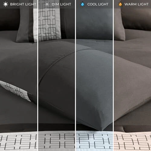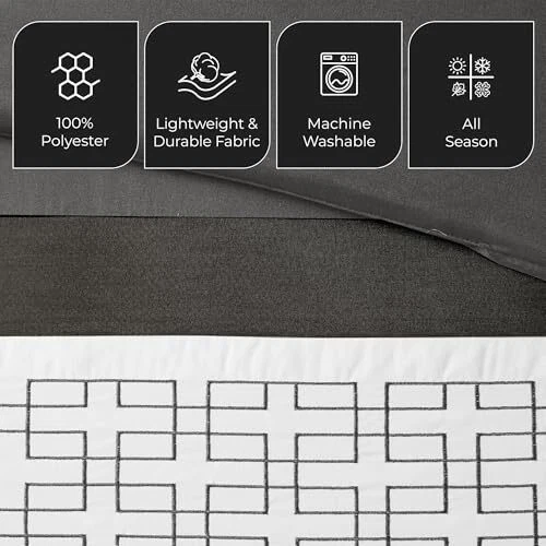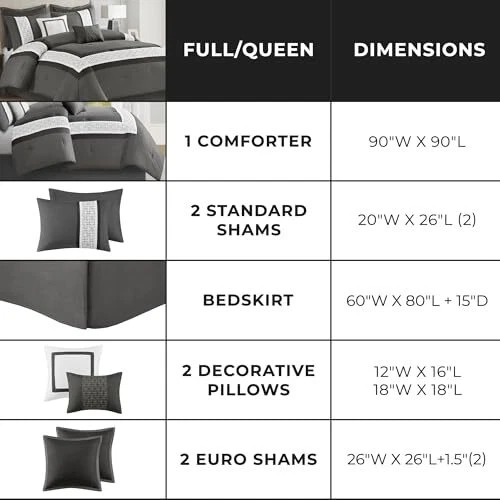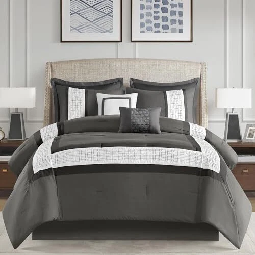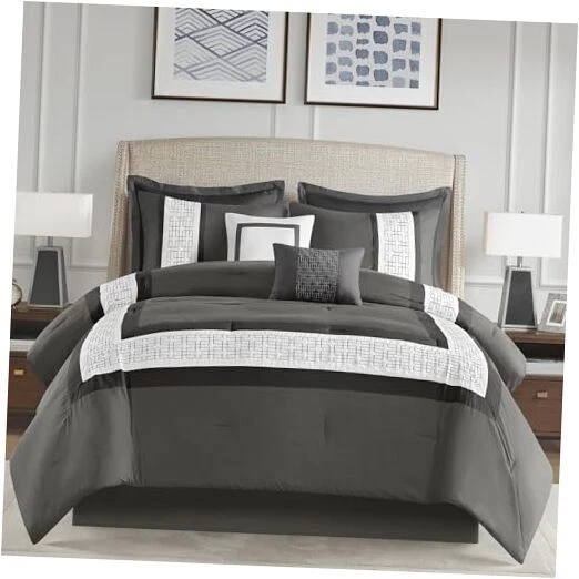 gtin13: Does Not Apply Type: Does Not Apply Material: Microfiber MPN: Does Not Apply Color: Dark Grey Theme: Modern/Contemporary Seasons: All Included Components: 1 Comforter, 2 Standard Shams, 1 Bedskirt, 2 Decorative Pillow, 2 EAN: Does Not Apply Item Weight: 7.93 pounds Brand: Does Not Apply Style: Modern/Contemporary Item Length: 90 Pattern: Border Item Width: 90 Number of Pieces: 8 Item model number: 5DS10-0294 Thread Count: 85 Country of Origin: China Manufacturer: E&E Co. Ltd DBA JLA Home Product Dimensions: 90 x 90 x 1.5 inches Item Height: 1.5 Fabric Type: Microfiber Size: Queen Product Care Instructions: Machine Wash Batteries required: No UPC: 022164438529 Item dimensions L x W x H: 90 x 90 x 1.5 inches
