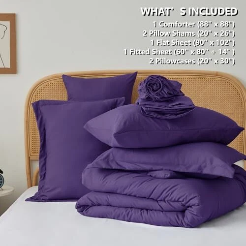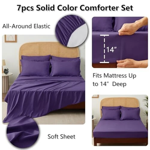 Return Policy Fast Delivery Trusted seller Queen Comforter Set(88"x88"),All-Season Comfort Set 7-Piece Soft Luxury Bedding,Purple Bed in a Bag with Comforter, Sheets, Pillowcases & Shams Product Description Considerate Design:This bedding set includes a fitted sheet with a pocket for mattresses up to 14" deep,envelope closure pillowcases to keep your pillows secure,and the neutral design feature of sewing lines will also stable inside filling. Ultra Soft Fabric:The comforter sets is crafted from premium microfiber which is breathable and sweat-absorbent.Combine with a sturdy quilting process that securely keep your belongings in place while preserving the beauty of the design. Let your family enjoy a comfortable sleep all season. What You Can Get: Queen Size bed in a bag includes 1 Comforter 88"x88", 2 Pillow Shams 20"x26", 1 Flat Sheet 90"x102" , 1 Fitted Sheet 60"x80"+14" and 2 Pillowcase 20"x30" OEKO TEX 100:We're proud to be certified by OEKOTEX when it comes to sustainability, ethical manufacturing and safety.This high-quality and long-lasting bedding set is a safe and comfortable choice. Easy Care:This bed set is durable and easy to maintain, with even dense stitching and machine washability for long-lasting use.Since the comforter comes in vacuum-sealed packaging, it is highly recommended to wash it and tumble dry low temperature to puff the comforter before first use. Or you can expose it to sunlight and tap gently, then it will re-fluffed nicely after hours. Shipping Returns Payment Shipping Shipping is FREE to all addresses other than APO/PO boxes in the lower 48 states. All our stock ships from US-based warehouses. Shipped via USPS or UPS (depending on location and package weight) Unless stated otherwise, all orders will ship within 24-72 hours of your payment being processed. Check our feedback to see the great reviews of FAST shipping we offer. Returns Seller does not accept returns Payment We currently accept payment via eBay managed payments only. Once payment is cleared, we will dispatch your shipment within 1-3 business days. Please refer to the "Shipping" tab for more information regarding shipping speed to your destination.