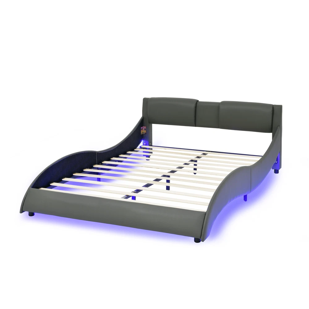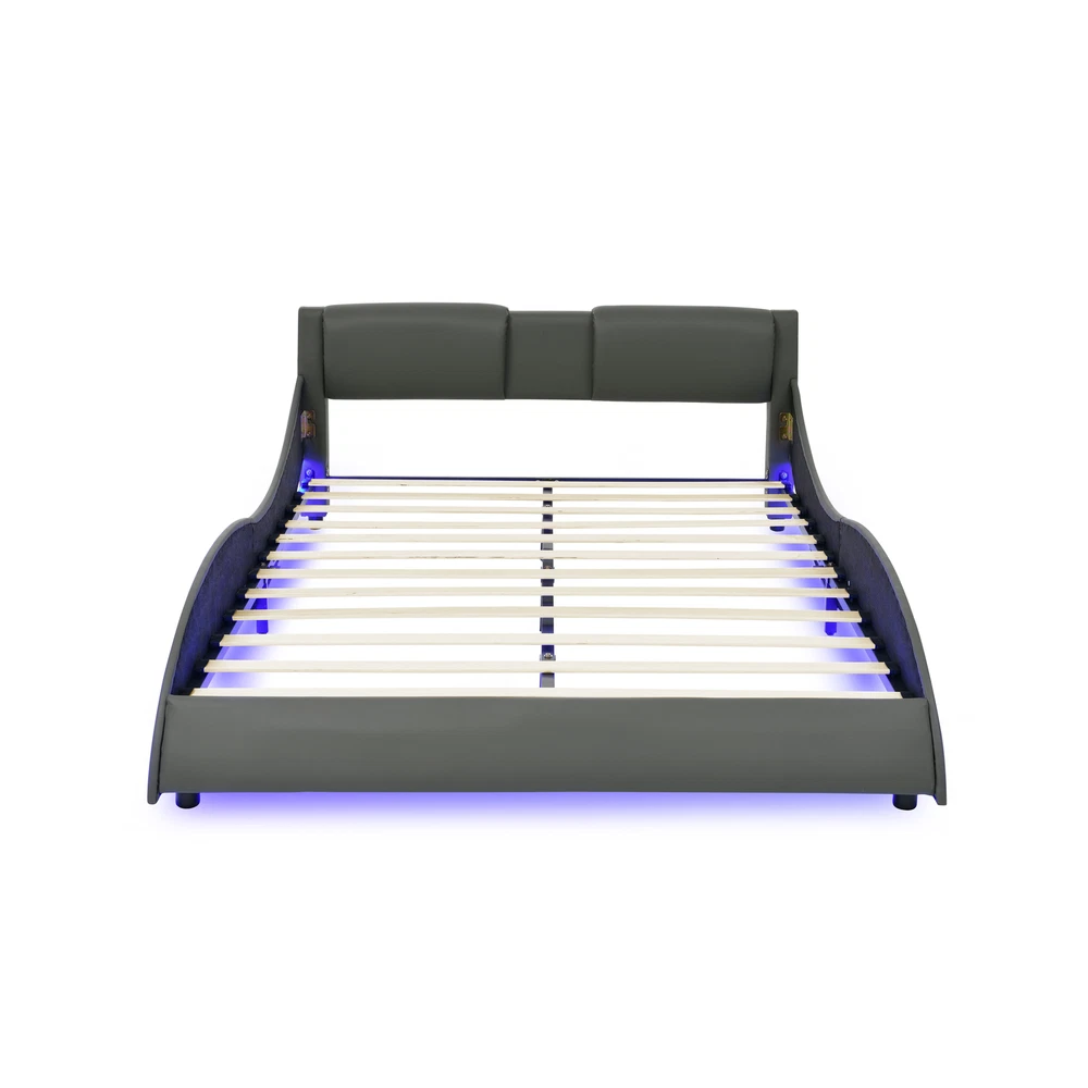 Queen Led Bed Frame Modern Faux Leather Upholstered Platform Bed Frame with RGB