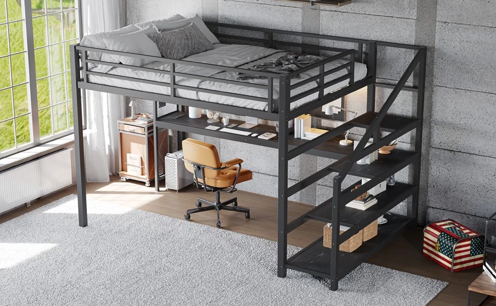 Queen Loft Bed with Desk and Storage Stairs, Metal Loft Beds with LED Lights Features 【Space-Saving & Functional Design】This queen loft bed with desk and storage stairs maximizes your room by combining a built-in desk, shelves, and sturdy stairs. The unique iron nets let you hang photos, calendars, or small items, making your space practical and personalized. 【LED Lights & USB Ports】Equipped with built-in LED lights and convenient USB ports, this queen loft bed with storage creates a cozy atmosphere and keeps your devices powered. It’s perfect for studying, working, or relaxing in style and comfort. 【Durable Metal Frame】Crafted from premium steel with a rust-resistant finish, this queen loft bed frame provides reliable stability and long-lasting use. The solid construction ensures both safety and durability for daily living. 【Noise-Free Experience】Designed with noise-reducing rubber plugs, this queen loft bed minimizes squeaks and friction, ensuring quiet and restful sleep every night. Ideal for those who value comfort and peace. 【Easy Assembly】All parts are clearly labeled and come with detailed illustrated instructions and a complete tool kit. This queen loft bed with desk and storage stairs can be assembled quickly and securely without hassle. Descriptions Description Upgrade your bedroom with this Queen Loft Bed with Desk and Storage Stairs, a multifunctional solution for modern living. Its space-saving design combines a built-in desk, shelves, and storage stairs, while the unique iron nets add a personal touch by allowing you to hang photos, notes, or accessories. Built-in LED lights and USB ports enhance convenience, creating a cozy and tech-friendly environment for studying, working, or relaxing. Crafted from heavy-duty steel with a rust-resistant finish, this loft bed frame ensures long-lasting stability and safety. Rubber plugs reduce noise for a peaceful sleep, while the detailed illustrated instructions and included tool kit make assembly easy. Perfect for apartments, dorms, or family homes, this loft bed blends practicality, durability, and style to meet your everyday needs. Weight & Dimensions Product Type Metal Loft Bed Color Black Size Queen Material Metal+MDF Overall Product Dimension 98.5”L*60.5’’W*65”H Overall Product Weight 147.27 LBS Weight Capacity 500LBS for Upper Bed Recommend Mattress Thickness 6'' Number of Package 2 Package Dimension & Weight Please refer to the Specification Level of Assembly Full Assembly Needed Eligible for Hardware Packs Yes Country of Origin China Note All the pictures are taken by actual samples, slight chromatic aberration may occur due to lighting or display.