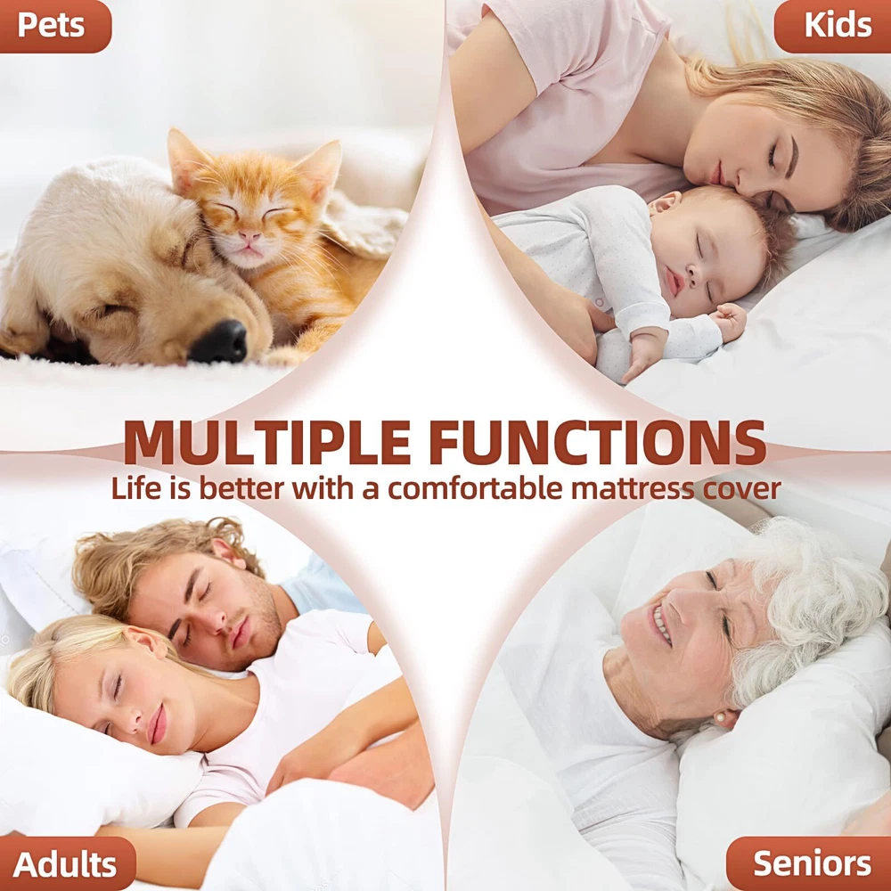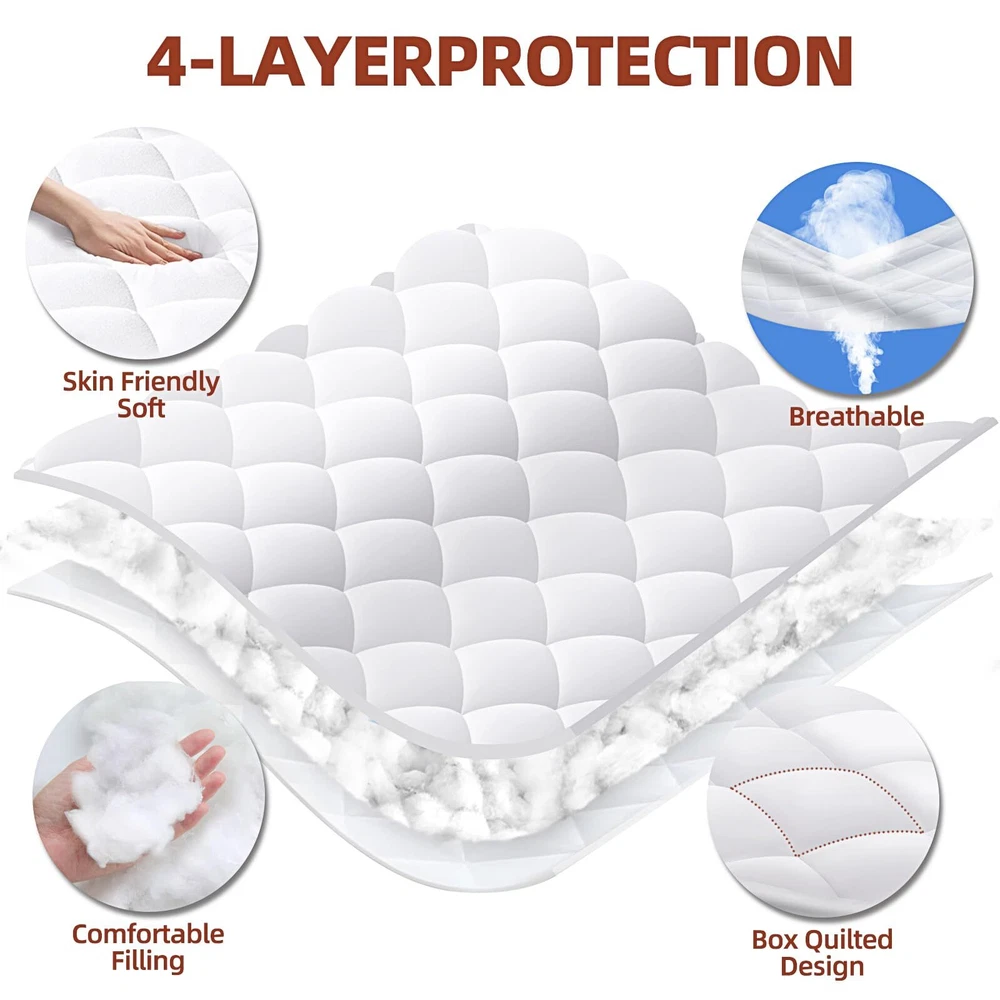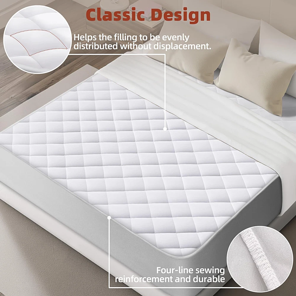 Comfortable Touch: This mattress topper is filled with high-quality natural cotton, which has good breathability, bringing infinite coolness, softness and soothing to the skin, making it easier for you to fall into a peaceful sleep state and enjoy a high-quality sleep time. It is suitable for people with various needs. Extra Fit for Your Bed: Air Mattress Pad is designed with an adjustable elastic band at the bottom, which is convenient for different air mattresses to be adapted by sticking. It can make the mattress pad fit firmly with the inflatable mattress. No matter how you turn over or move in bed, the mattress topper will not shift or slide. Deep Pocket: The 80×60 inch queen mattress pad can be stretched to 20 inches. The deep pocket mattress pad is very easy to install, and you don't need to pull and adjust it laboriously. The 360° surround design fits your air mattress perfectly, prevents wrinkles, and provides all-round protection, making your sleep more stable. Box Quilting Design: This design fixes the filling in a small grid of 10×10cm, avoiding the displacement and accumulation of the filling, bring you a stable and comfortable feeling. The tightly reinforced stitching greatly extends the life of the mattress cover. The regular and atmospheric box pattern symbolizes high-end quality of life. Machine Washable and Easy to Care: Machine washable ensures the cleanliness of the mattress topper. Choose the appropriate washing mode and use cold water for gentle circulation to easily complete the cleaning work. You don't need to feel anxious and tired about cleaning the mattress pad in your fast-paced life.