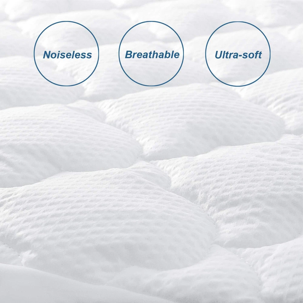 Breathable and Soft: Premium breathable microfiber fabric of the queen mattress pad provides softness touch feeling, the fabric with down alternative filling increases more breathable, which can allow you to stay comfortable throughout the night. Comfortable and Noiseless: Our air mattress pad is filled with down alternative fiber, and the mattress pad bottom layer use soft microfiber fabric, that won't make any crinking sounds. Durable and Protection: This mattress pad queen is durable and long lasting, which is significant for keeping your mattress free of damage, stains, sweat, skin oils, keep your mattress clean and extend it longer lifespan. (It would be more fluffy after releasing from the vacuum package in a few days) Fitted Sheet Style: The mattress topper is fitted sheet style with deep pocket, perfectly fits the queen air mattress (60 x 80 inches), the skirt stretches up to fit at least 23 inches deep mattress, more stretch for easy on or off. Guarantee: Since the mattress pad cover is vacuum packed, we suggest that it can be placed for a few days or gently patted after opening to make it return to original state. The product quality you can trust so you can buy at ease. And if you have any questions, please contact. Our customer service staff will reply you within 24 hours.