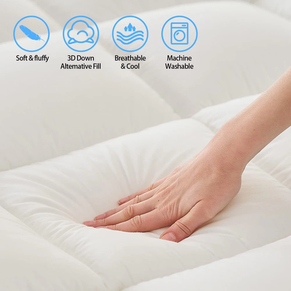 Queen Mattress Topper Cover Cooling Mattress Pad Pillow Top Mattress Cover Quilted Fitted Mattress Protector with 8-21 Inch Deep Pocket ENJOYING SLEEP: Enjoy this cloud-like mattress topper with the overfilled plush luxury down alternative fill, which exhibits a soft and fluffy loftiness for the existing mattress, provides ultra comfort for all sleeping positions. COOLING & BREATHABLE:Made of carefully selected the fabric is breathable, quick dry and shrink-resistant, a durable and smart choice for you. Processed with Peach skin finish, it brings a cozy feeling to touch, also wicks moisture, keeps your skin dry and cool. No more sweaty nights caused by memory foam or traditional mattresses. DEEP POCKET: Deep pocket with 360°all-around elastic skirt perfectly fits and grips any mattress up to 21", so the pillow top will stay in place and you can toss and turn freely during the sleepy nights. The mattress pad is suitable for a wider range of size, no more worry about the pillow top is not enough to wrap, unstable, and easy to run. EASY TO CARE: The mattress topper packaged in a vacuum bag, please spread it for a few days before use so the feather bed topper would return to normal thickness. (Best Way Fluffy Again: Put mattress topper in a tumble dryer on low heat & low speed for 15 minutes, or lay It in the Sun for a Few Hours.) OUR COMMITMENT:Mattress Topper pad is tested to be safe from 300+ harmful chemicals. Rest assured, if you're not happy with our mattress toppers, write to us and we will resolve your query within 1 business day.