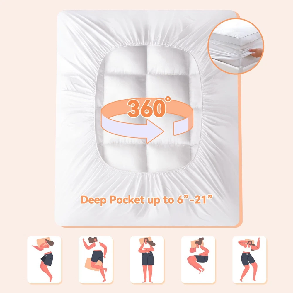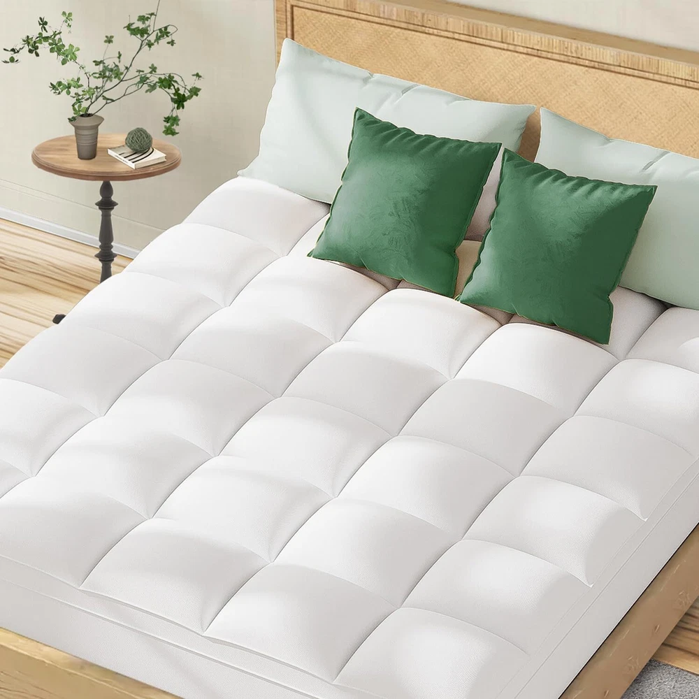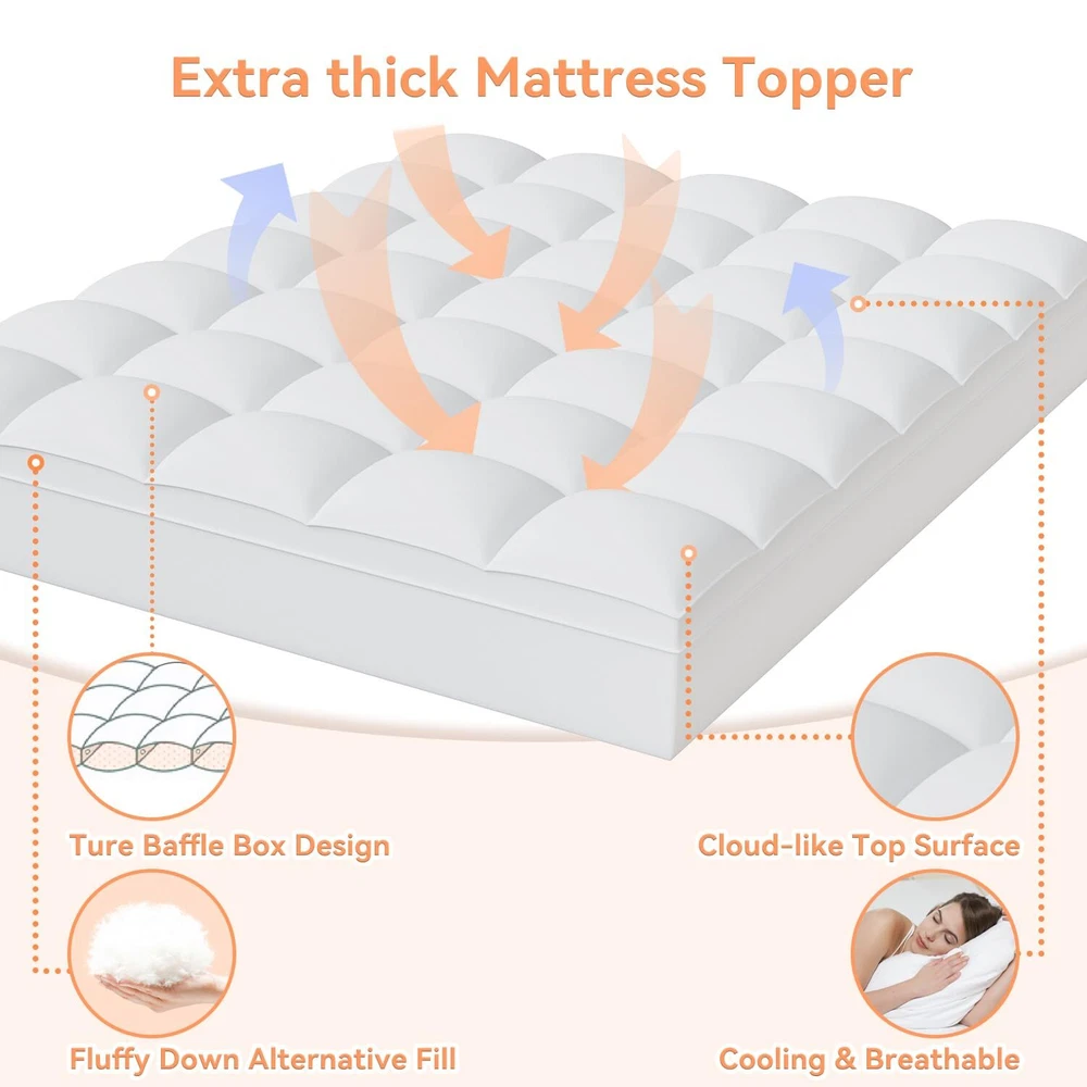 【Rational Design & Premium Materials】: This Queen mattress topper adopts a baffle box design to evenly distribute the filling. The supportive 3D snow down alternative filling not only protects you from allergies, but also relieves your shoulder and back pain. The extra thick filling of our mattress pad gives you a restful sleep experience all night. 【Soft and Breathable】: Selected fabrics and high-quality 3D structure fiber filling materials have good ventilation and can dissipate heat to help regulate temperature. The cooling mattress topper is skin-friendly and soft to the touch. The cloud-like surface can provide you with a good sleep in various sleeping positions. 【Deep Pockets & Anti-slip】This Queen size mattress topper's pocket 360° wrap design protects your mattress from all sides. Thanks to the high elastic pockets, this mattress protector cover can fit tightly to mattresses of 8-21 inches and is not easy to slide. pillow top mattress topper also provides a variety of sizes for you: Twin 39"x75", Twin XL 39"x80", Full 54"x75", Full XL 54"x80", Queen 60"x80",Short Queen 60"x75", King 78"x80", Cal King 72"x84". 【Machine Washable & Easy Care】Our mattress topper Queen is machine washable. You can wash it at home without sending it to an expensive dry cleaner, making your daily cleaning easier. The mattress pad can be easily folded and stored. At the same time, our Queen mattress topper is firmly quilted and made of featured fabric, which has a long service life. 【Customer Service】:Your satisfaction is our biggest goal. If you are not satisfied with our products, please feel free to contact us and we will respond to you within 24 hours. hopes that our pillowtop mattress topper can bring every customer a good sleep and shopping experience.
