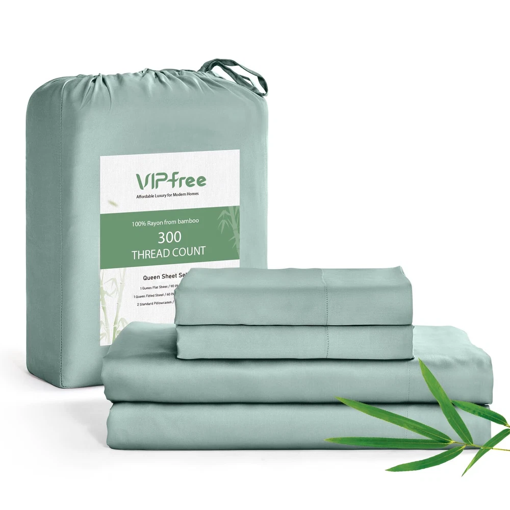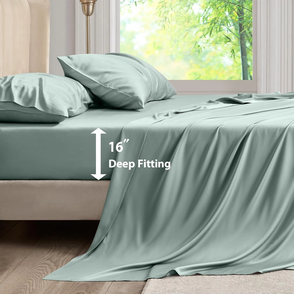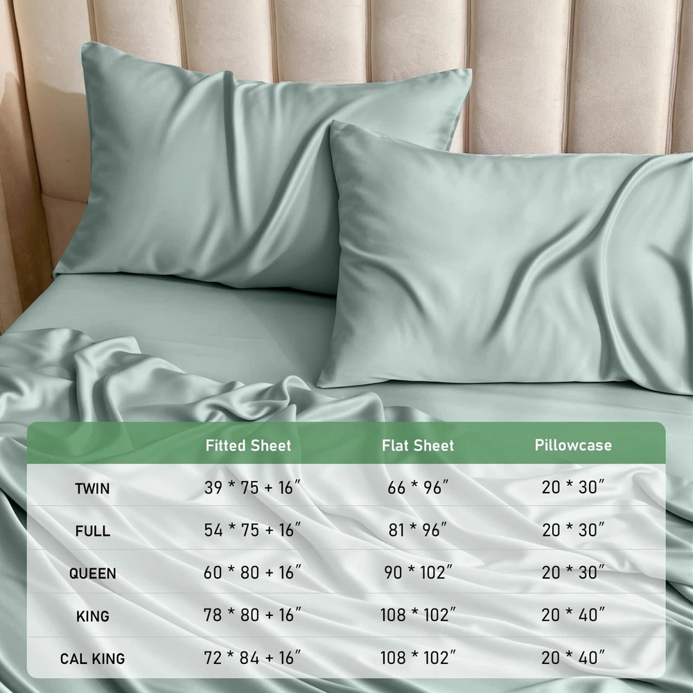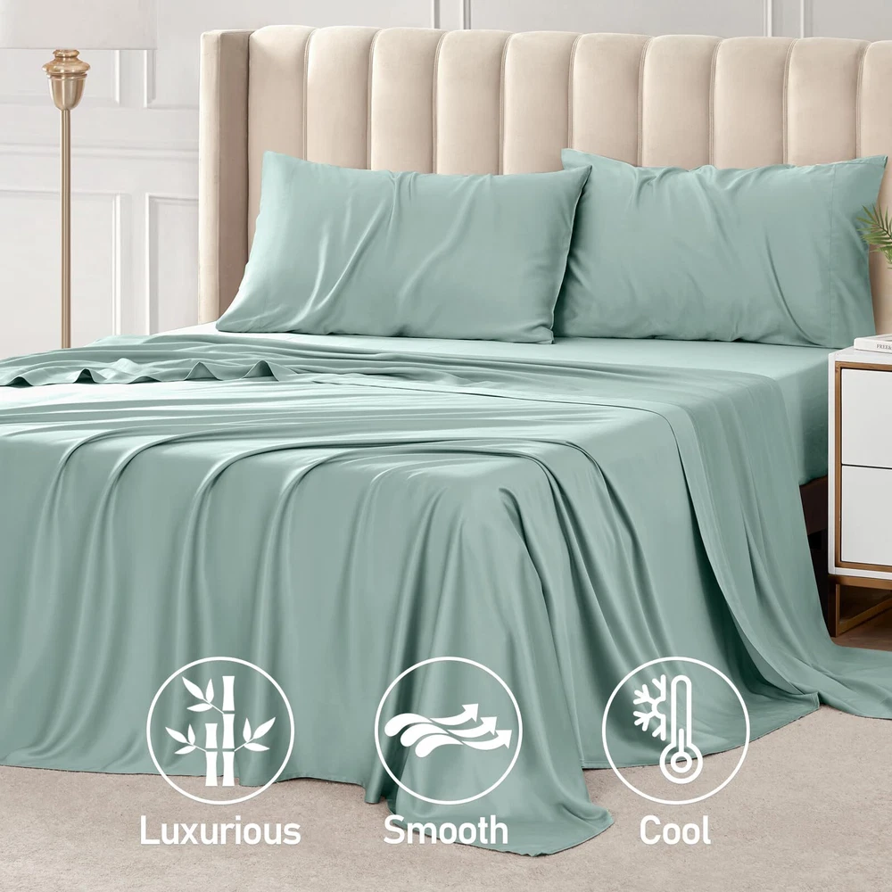 4 Piece Queen Sheet Set: Includes 1 deep pocket fitted sheet(60x80 IN), 1silky sateen weave sheets flat sheet(90x102 IN) and 2 envelope-style pillowcases(20x30 IN) with overlapping closure Cool & Breathable: Rayon Derived from Bamboo sheets have natural heat dissipation and a cool and comfortable surface. Using advanced breathable weaving technology, the unique mesh structure allows air to flow freely between the sheets and the body, helping to quickly dissipate heat, regulate body temperature, and improve sleep quality throughout the night Silky & Soft: Our luxury sheets set are made from 100% Rayon Derived from Bamboo, it has a delicate and soft texture, feels silky and smooth, and brings a refreshing skin experience. Its natural material is not only gentle and skin-friendly, but also effectively reduces friction, and is particularly friendly to hair, reducing the trouble of hair tangling after getting up in the morning Practical Design: The cooling sheets are designed to be both stylish and functional, with "TOP" and "SIDE" labels to guide placement, and 16-inch elastic straps to keep the sheet securely in place. Each sheet set also includes two envelope-style pillowcases, which prevent hair from being pressed down while sleeping, and keep the pillow insert from slipping out Easy to Care: The bed sheet set design is convenient and easy to take, and daily care is easy and quick. It is machine washable and supports low-temperature ironing, ensuring a fresh touch every time you use it. More importantly, the sheets set are not easy to fade or stain, Suitable for most users Helps Sleep: This sheet set has excellent texture and feels smoother and softer than cotton sheet set. Compared with polyester, it has better breathability and stays dry and comfortable. These good properties make it more suitable for improving sleep quality, providing you with a more comfortable sleeping environment, and helping you enjoy a good night's sleep