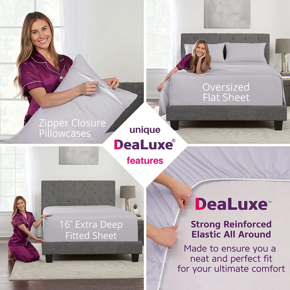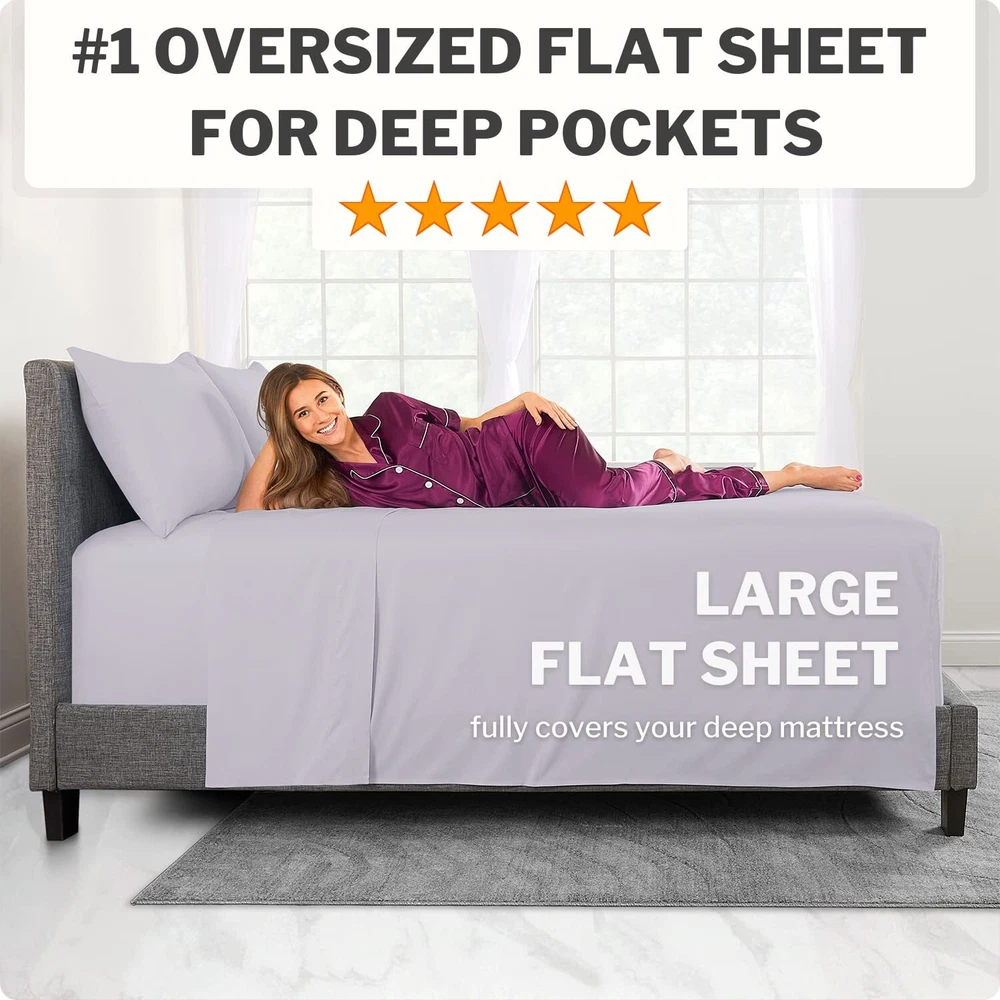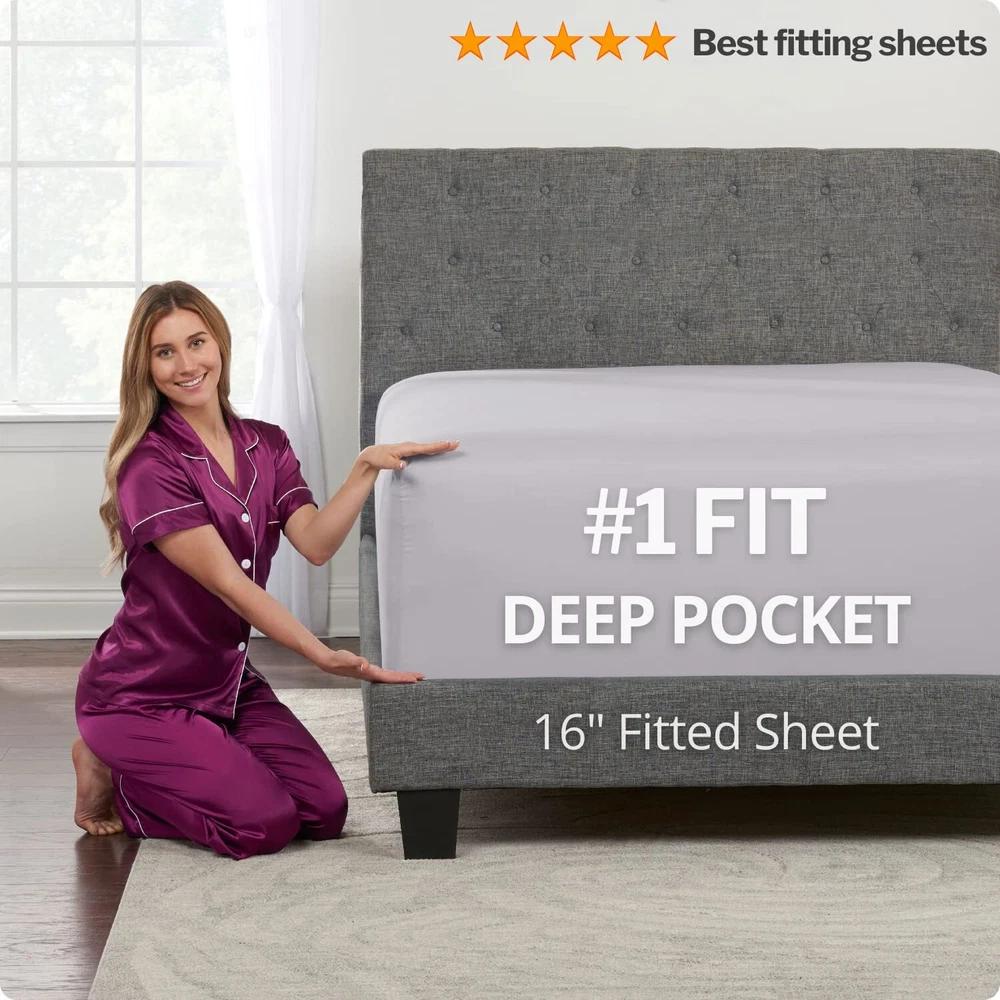 This is your perfect real 16” Extra Deep Queen Size 4-Piece Bed Sheet Set. Each and every piece with the best details. Queen Size: 16” Fitted Sheet 60” X 80” + 16”, Oversized Flat Sheet W 102” X L 108”, 2 Zipper Closure Pillowcases 20” X 30”. Designed and tested in the USA by our bedding experts for comfort, durability, easy care and style. Revolutionary real super oversized flat sheets for your high profile mattress up to 18”. What does real super oversized flat sheets mean for you? Well, the problem with all the other sheets sets on is that it has a regular flat sheet, and they will not cover your high-profile mattress. Our custom-fit flat sheets are different they are designed to cover your high profile 18” mattress they will hang over 21” on each side and neatly cover your high profile mattress on all sides. Real 16” extra deep pocket fitted sheets perfect for your 14”-18” inch mattress. What’s the difference between 14”sheets and 16” Deep Pocket Sheets? 14” Regular fitted sheets are made for mattress up to 16” only, vs these 16” Deep Sheets will fit a mattress from 14” up to 18” making it the perfect choice for high profile pillow-top mattresses, the more fabric there is, the better it will hold all night long for a neat look and cozy feel, made for your ultimate pleasure and comfort. 2 Zipper Closure Pillowcases. What does this mean for you? Most bed sheets sets and pillow cases on come with flap closure pillow cases that are is flimsy, messy and annoying. Our Pillow Cases are different, featuring a special zipper closure, no more distress with messy, flimsy flap closures pillowcases. Now you can look forward to resting your head on a neat, cozy and comfy pillow case. Get some peace of mind. Sleep in a cloud with these lush and super soft pillowcases. Made for you to enjoy hassle free Perfect Fit for 14”–18” Pillow Top Mattress with minimal care. Machine washable 16” Inch Deep Pocket Sheets, tumble dry low, remove promptly, no ironing needed. free, stain and fade resistant.