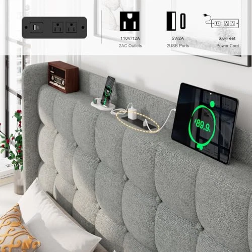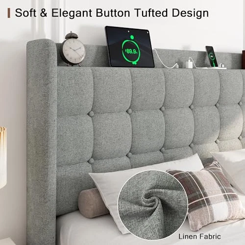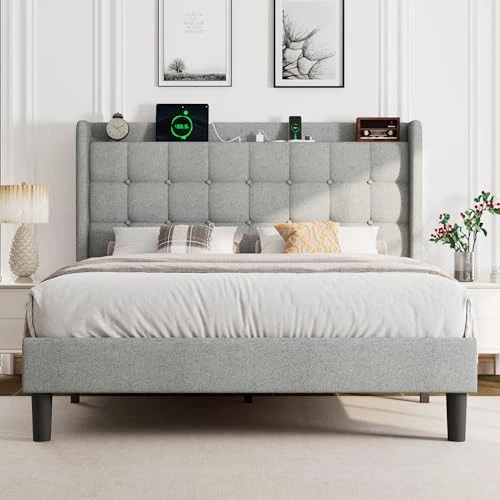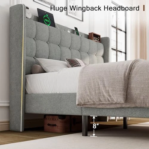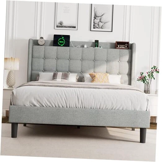 Return Policy Fast Delivery Trusted seller Queen Size Bed Frame, Upholstered Platform Bed Frame with Charging Station, Modern Wingback Storage Headboard, Solid Wood Slats Support, No Box Spring Needed, Light Grey Product Description Storage & Charging 2-in-1: 2 Outlets & USB Ports in the headboard which makes it convenient to charge your electronics. This makes it easy to charge and store, things are within reach Soft Touch & Comfortable: High-quality linen fabric and classic button-tufted, wrapped in high elastic sponge, it can enjoy more comfort in relaxing time when you watching TV or playing iPad Classic & Modern Design: Modern wingback headboard combined with classic button tufting to provide great back support when sitting up in bed, meanwhile, Add Minimalist style to any bedroom Stable & Druable: Sturdy slat frame construction that can withstand a weight of 1,000 pounds, providing you with a supportive and comfortable sleeping experience Quick Assemble: All products come with numbers and assembling this bed is as easy as child's play. It only takes about 30 minutes to complete the assembly. No squeaking Shipping Returns Payment Shipping Shipping is FREE to all addresses other than APO/PO boxes in the lower 48 states. All our stock ships from US-based warehouses. Shipped via USPS or UPS (depending on location and package weight) Unless stated otherwise, all orders will ship within 24-72 hours of your payment being processed. Check our feedback to see the great reviews of FAST shipping we offer. Returns Seller does not accept returns Payment We currently accept payment via eBay managed payments only. Once payment is cleared, we will dispatch your shipment within 1-3 business days. Please refer to the "Shipping" tab for more information regarding shipping speed to your destination.