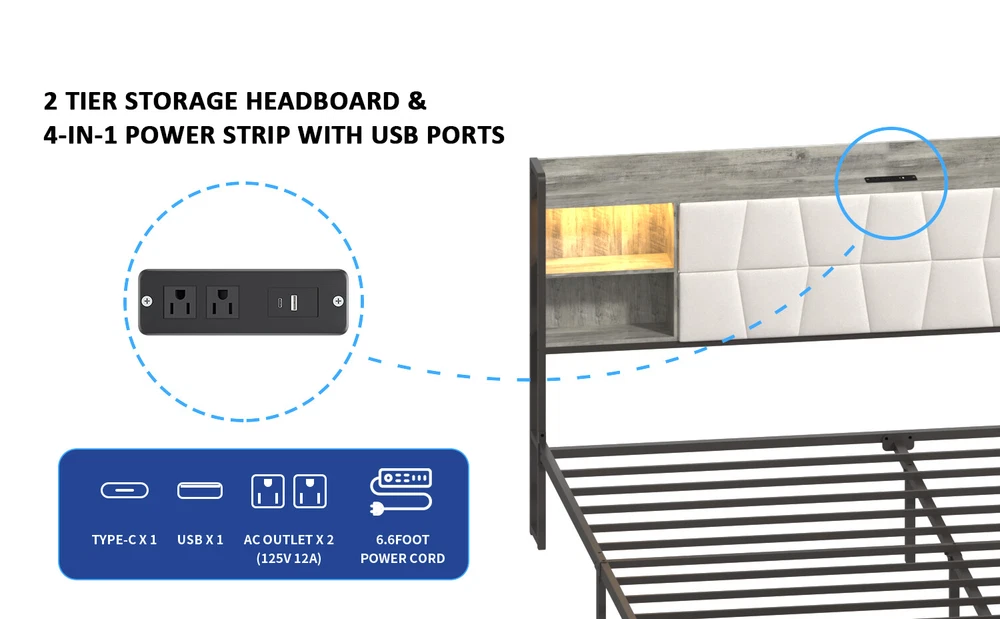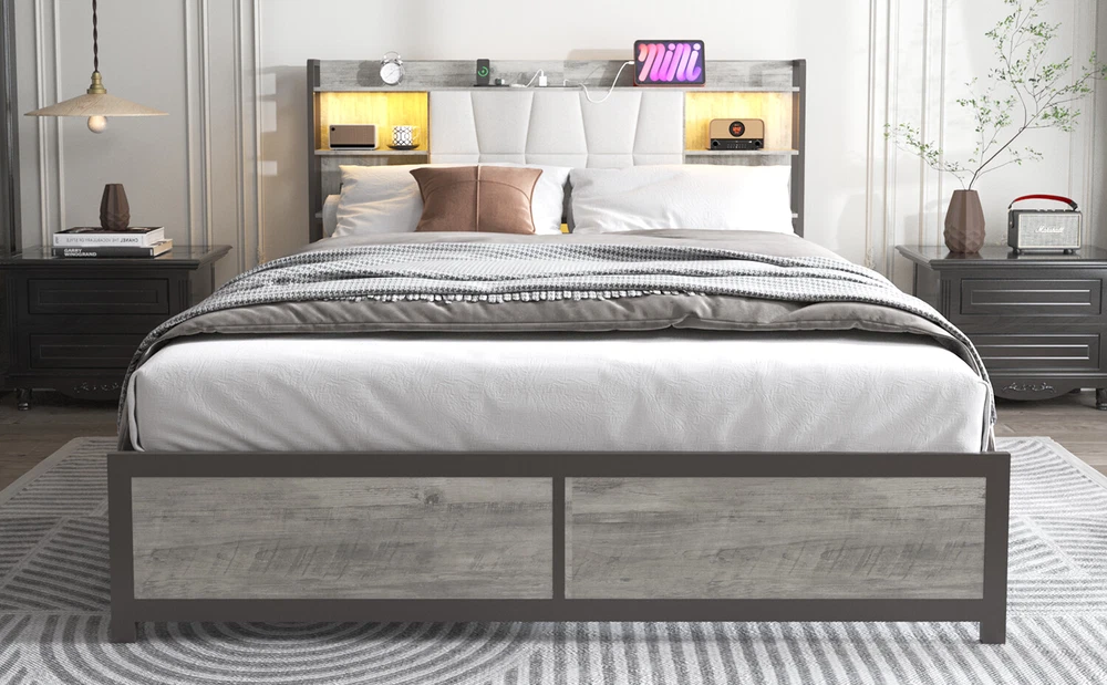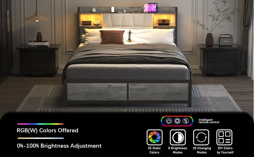 Brand Unbranded Item Length 62.5 Item Width 16.50 Item Height 6.30 Color Ancient Oak Frame Material MDF Metal Type BED FRAME Compatible Mattress Size As described Diamond-ring-1 Simple life Queen Size Bed Frame with LED Light & Power Outlet, Platform Bed with Upholstered Headboard and Storage, Sturdy Metal Slats Support, No Box Spring Needed, Easy Assembly, Noise-Free 【 Upholstered Headboard with Charging Station】 It is also built in 2 power outlets and 2 USB charging ports, which make it super convenient to charge your phone or tablet right by your bedside at night while you are laying on the bed. 【Multifunctional Smart RGB LED Lights】The queen size bed frame comes with RGB led lights . It is built in music sync function, 60000 colors, multiple dynamic modes, turn on/off and timing setting function by IR remote control for convenient daily use. You can use it as reading light, night light or set a comforting mood for sleep or relax. It gives off a great vibe for the room. 【Sturdy, Stable and Well-built】The heavy duty metal frame is very sturdy and well-built. It is strong enough to hold up a memory foam mattress, a gel pad and also 2 persons on it.This queen bed frame is steady and firm with no wobbles or shakes. It also doesn’t make noise getting in and out of bed. You are able to get rid of your box spring and ensure a comfortable night’s sleep with this frame. 【Quick & Easy to Assemble】The assembly process is a breeze. The step-by-step guidance is easy to follow, and all the pieces were numbered. The platform bed frame is easy to setup and install. 【Great Storage Space】The headboard offers extra storage space but they don’t take any space at all. It’s convenient to store your phone, an alarm, water and photos if you are lacking a nightstand. The queen size platform bed frame has perfect height off the ground to store boxes, shoes, toys, books under the bed without being too obvious. It is easy to clean under and has enough room for a robot vacuum to get under. Item Specifics Brand Unbranded Item Length 62.5 Item Width 16.50 Item Height 6.30 Color Ancient Oak Frame Material MDF Metal Type BED FRAME Compatible Mattress Size As described Payment Returns Diamond-ring-1 Simple life DESCRIPTION PAYMENT SHIPPING RETURN POLICY CONTACT US Shop Category Store Home Other Hot Item Delivery New List Item Help & Info Payment Policy Shipping Policy Return Policy FAQ About Us Queen Size Bed Frame with LED Light & Power Outlet, Platform Bed with Upholstered Headboard and Storage, Sturdy Metal Slats Support, No Box Spring Needed, Easy Assembly, Noise-Free 【 Upholstered Headboard with Charging Station】 It is also built in 2 power outlets and 2 USB charging ports, which make it super convenient to charge your phone or tablet right by your bedside at night while you are laying on the bed. 【Multifunctional Smart RGB LED Lights】The queen size bed frame comes with RGB led lights . It is built in music sync function, 60000 colors, multiple dynamic modes, turn on/off and timing setting function by IR remote control for convenient daily use. You can use it as reading light, night light or set a comforting mood for sleep or relax. It gives off a great vibe for the room. 【Sturdy, Stable and Well-built】The heavy duty metal frame is very sturdy and well-built. It is strong enough to hold up a memory foam mattress, a gel pad and also 2 persons on it.This queen bed frame is steady and firm with no wobbles or shakes. It also doesn’t make noise getting in and out of bed. You are able to get rid of your box spring and ensure a comfortable night’s sleep with this frame. 【Quick & Easy to Assemble】The assembly process is a breeze. The step-by-step guidance is easy to follow, and all the pieces were numbered. The platform bed frame is easy to setup and install. 【Great Storage Space】The headboard offers extra storage space but they don’t take any space at all. It’s convenient to store your phone, an alarm, water and photos if you are lacking a nightstand. The queen size platform bed frame has perfect height off the ground to store boxes, shoes, toys, books under the bed without being too obvious. It is easy to clean under and has enough room for a robot vacuum to get under. Item Specifics Brand : Unbranded Item Length : 62.5 Item Width : 16.50 Item Height : 6.30 Color : Ancient Oak Frame Material : MDF Metal Type : BED FRAME Compatible Mattress Size : As described Payment Returns All rights reserved.