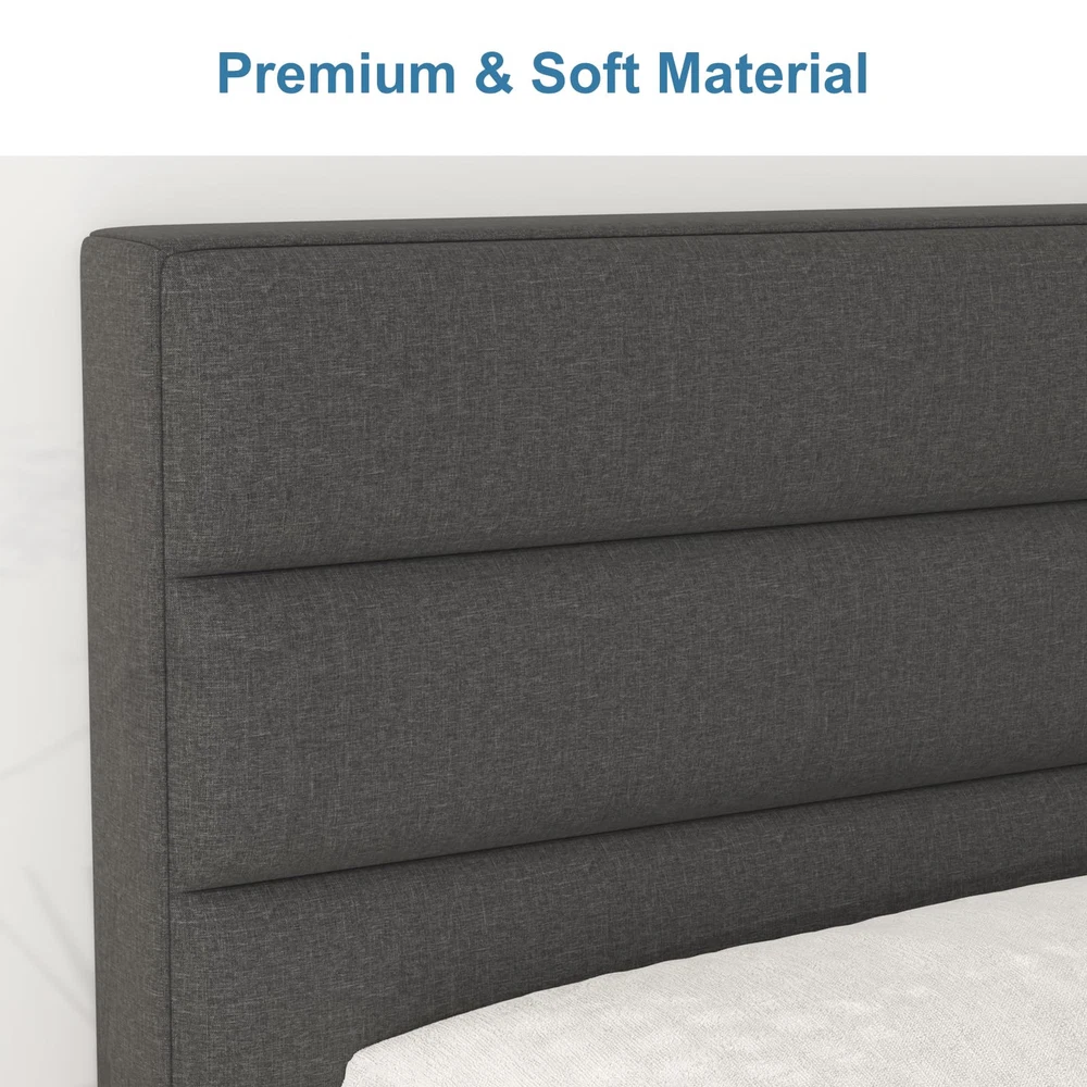 Modern Design:The queen bed frames comes with an upholstered headboard so you can relax or read with your back to the headboard Sturdy Metals Support:The queen size bed Frames is constructed from high-hardness Metals, ensuring exceptional stability; A central leg support system helps prevent sagging No Spring Box Needed:The Bed Frames queen size include sturdy slats that allow the mattress to be placed directly on top of the bed slats,no need for a spring box Easy Assembly:All the parts needed for assembly are stored inside the headboard and each part is clearly labeled for easy identification;You can assemble it in about 30 minutes Adhesion: The feet of the bed frames have non-slip pads to protect the floor and reduce the sound of friction