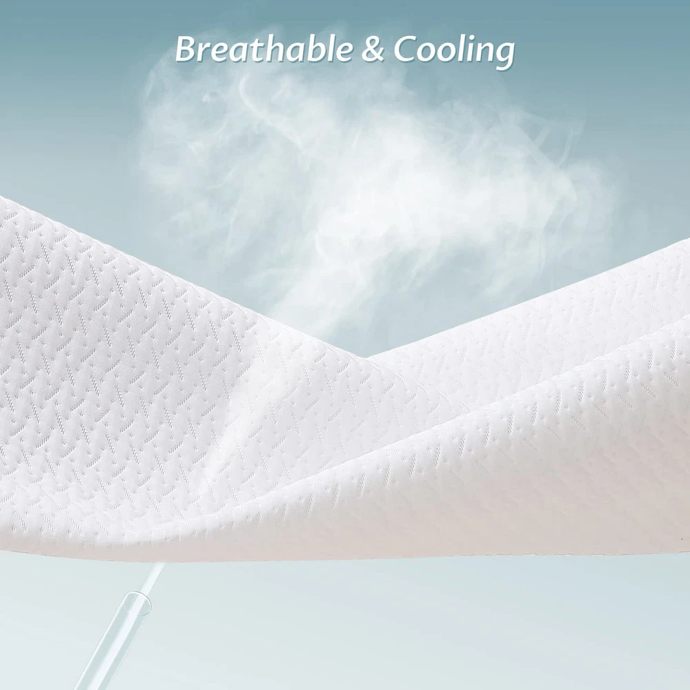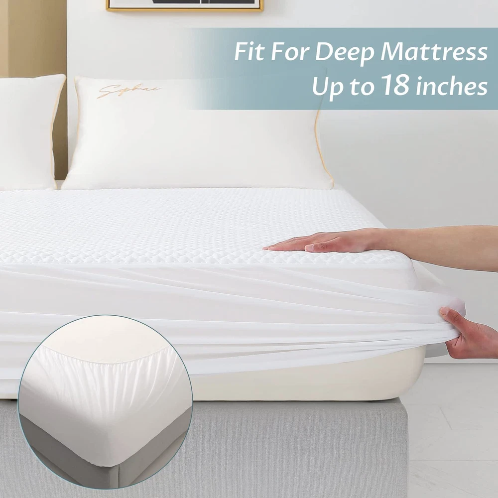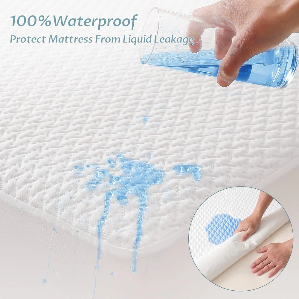 ★OEKO-TEX STANDARD - committed to protecting consumers' sleep , and the mattress cover has been certified and tested to be free of harmful substances. ★WATERPROOF & NOISELESS - Upgraded 2mm TPU waterproof layer protects your precious mattress from liquid leaks and makes no noise when sleep at night. ★3D AIR FABRIC - mattress protector has a unique channel weave structure that facilitates air flow and expels heat for more cooling, especially for hot sleepers. ★MORE SOFT - The surface of this mattress protector is delicately soft to the touch, with the right amount of fluffiness to provide good support, soothing your pressure and bringing a better sleeping environment. ★FITTED STYLE - The bed cover has stretchy skirts to prevent the top from sliding, fits up to 18'' deep pocket. ★SAVE YOUR MONEY - Our mattress pad is totally machine washable with good durability. If there is any problem with the product, please us, we offer 30-Day Return/Service.