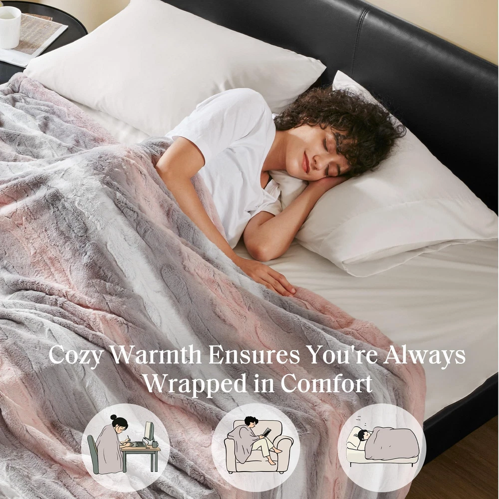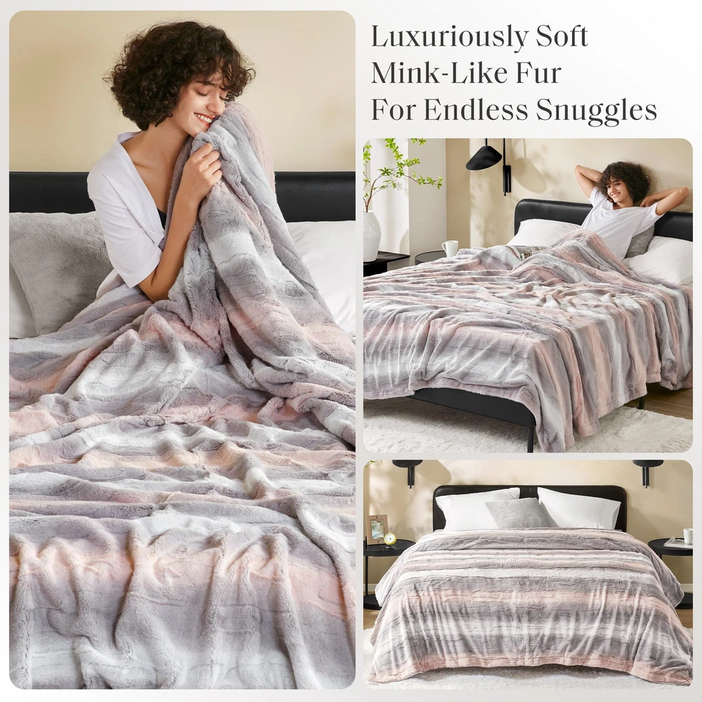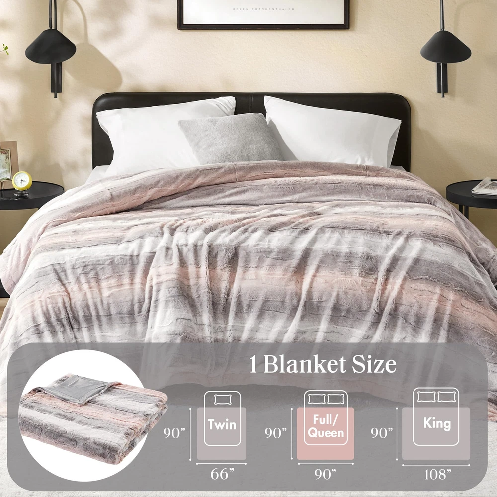 The Zuri blanket features a luxuriously soft faux fur and reverses to a solid faux mink. This faux fur throw is the perfect modern update and adds a glamorous accent to your home. This throw is machine washable for easy care and OEKO-TEX certified, meaning it does not contain any harmful substances or chemicals to ensure quality comfort and wellness. Cozy Snuggles: Indulge in the sumptuous comfort of our luxurious faux fur- mink reversible throw. With its lush fur design, it wraps you in a cozy embrace. For best results on first use, set the dryer to "no heat" or "air fluff" to remove loose fibers Ideal Gift Choice: This luxurious & cozy blanket featuring a warm and cozy furry design makes it a perfect gift for girls, teens, and women on special occasions like Christmas, Thanksgiving, and birthdays Extra comfort for everyday luxury: Whether you're snuggled up for a movie night or seeking comfort at office, our elegantly soft and plush cozy and fuzzy throw ensures you're pampered in warmth and luxury Irresistibly Soft: Made from poly fur, this reversible blanket delivers a buttery-soft feel that’s truly irresistible. Sized at 90 x 90 inches, it’s perfect for full and queen beds, offering generous full-body coverage for cozy comfort DURABLE & EASY CARE: Our faux fur reversible to plush blanket boasts quality stitching offers durability to withstand daily wear and tear. For easy care, simply machine wash separately in cold water on a gentle cycle and tumble dry on low / no heat