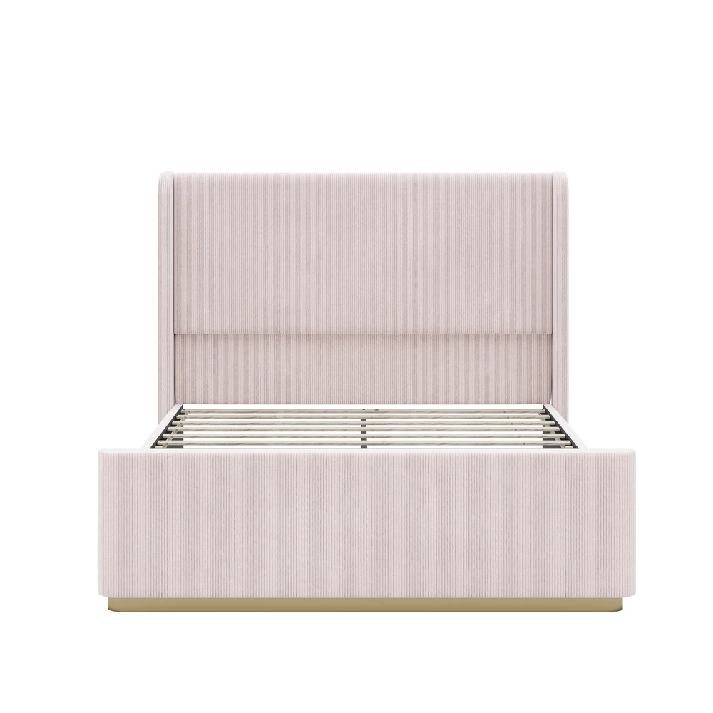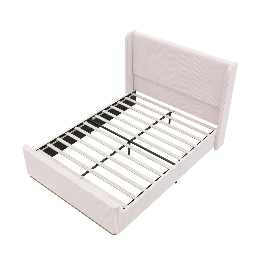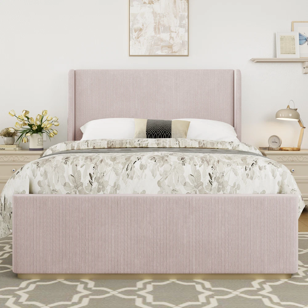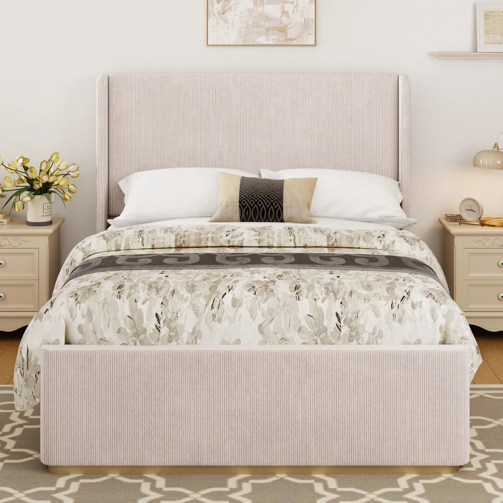 Queen Size Corduroy Upholstered Bed Frame with Vertical Stripe Wingback Headboar