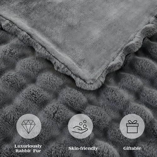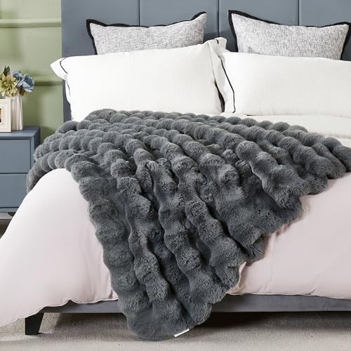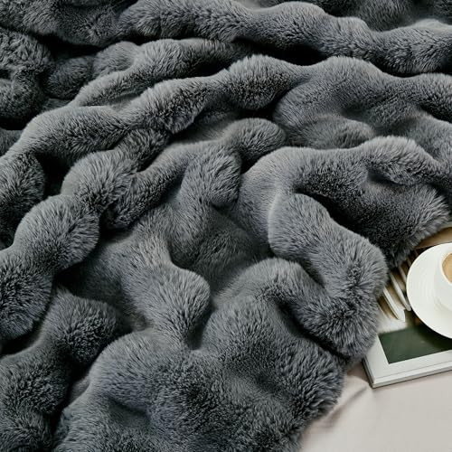 Queen Size Grey Faux Rabbit Fur Bedspread 80x90 Inches Thick Solid Bubble Texture