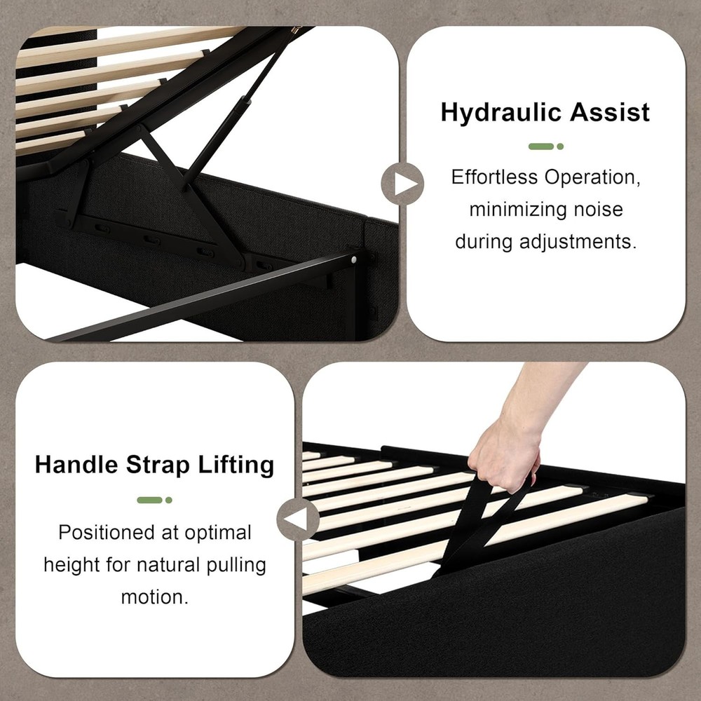About this item Note: The hydraulic rods feature a load-bearing optimization design for effortless operation under full bed capacity. Always place the mattress on the frame after installation—operating the mechanism with an empty bed may compromise lifting functionality Adaptive Hydraulic Lift: Precision-engineered hydraulics deliver gravity-defying control—smooth lifting, adaptive resistance when empty, and effortless lowering under load Cavernous Underbed Vault: Maximizes space with a seamless under-bed compartment. Hydraulic lift system conceals bulky seasonal gear, luggage, or linens—ideal for compact living or minimalist design Tactile Linen Elegance: Breathable linen fabric with cloud-like cushioning meets ergonomic wingback headboard support. Merges sculptural wingback support and lounging luxury for timeless bedroom refinement Rock-solid Stability: 1000lbs static load capacity via reinforced construction. No box spring required; Reinforced joints and solid legs ensure silent stability for any mattress type Zero-Noise & Easy Assembly: Designed for quiet operation, eliminating the annoying noises common in traditional platform beds for truly peaceful sleep. Simplified assembly features—get set up hassle-free with no extra tools required The Queen Size Lift up Storage Bed Frame is a modern and stylish platform bed made with a dark gray linen upholstery. It features a rectangular shape with dimensions of 83.5"L x 62"W x 42.5"H, making it the perfect size for a Queen mattress. This lift-up storage bed frame comes with an assembly kit, hydraulic lift system, slats, and instructions for easy assembly. With a weight limit of 1000 pounds, this bed is designed to support adults and their belongings with its hydraulic support and noise-free operation. Made in the United States, this bed frame offers both functionality and style for a modern bedroom setting.
