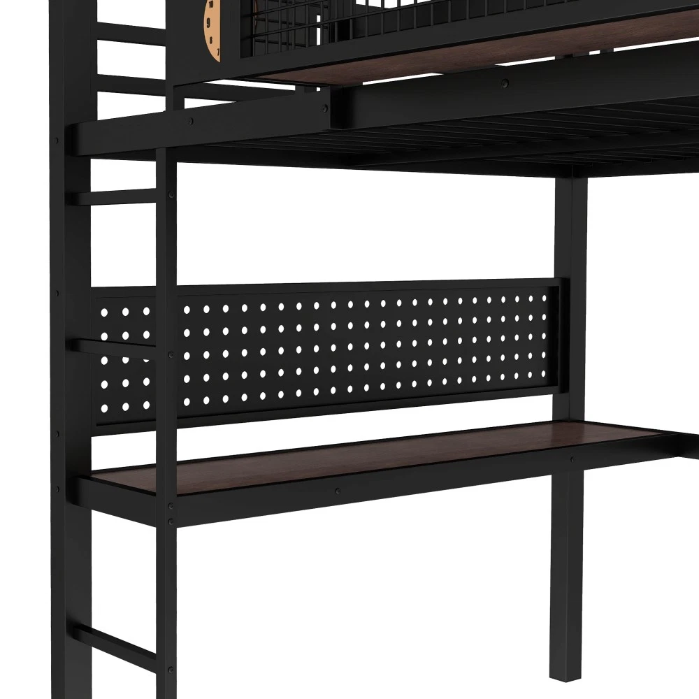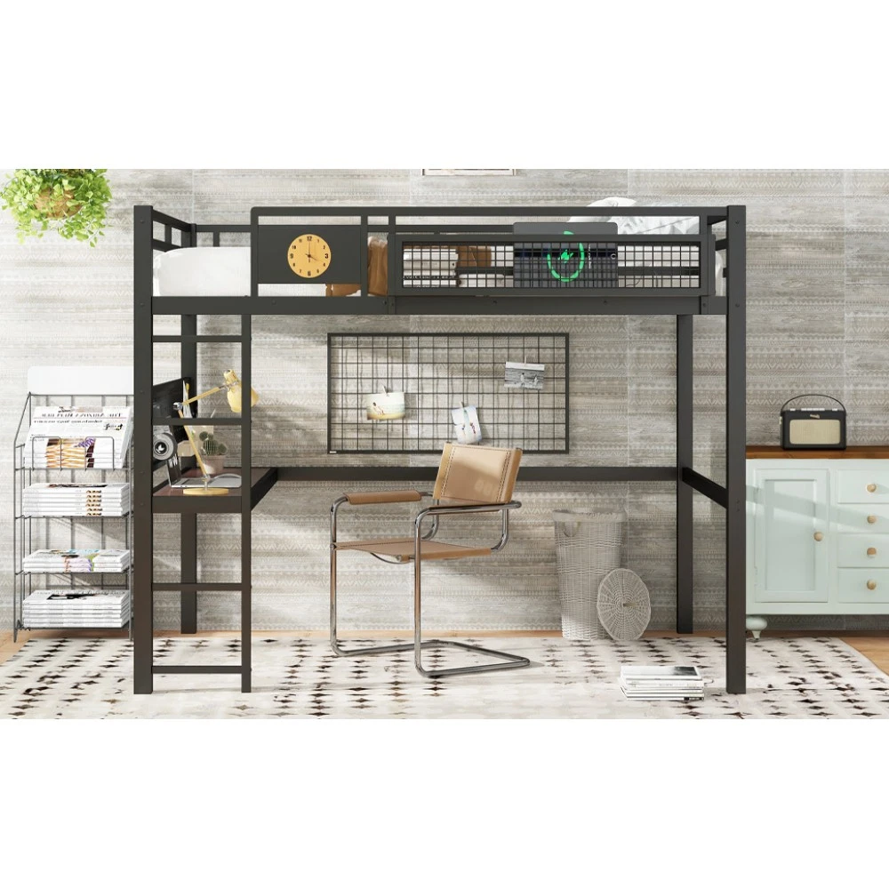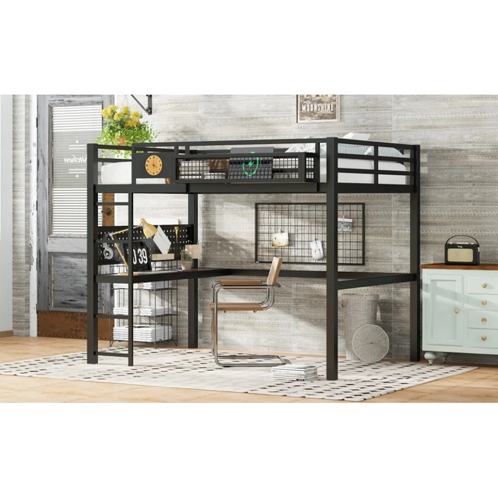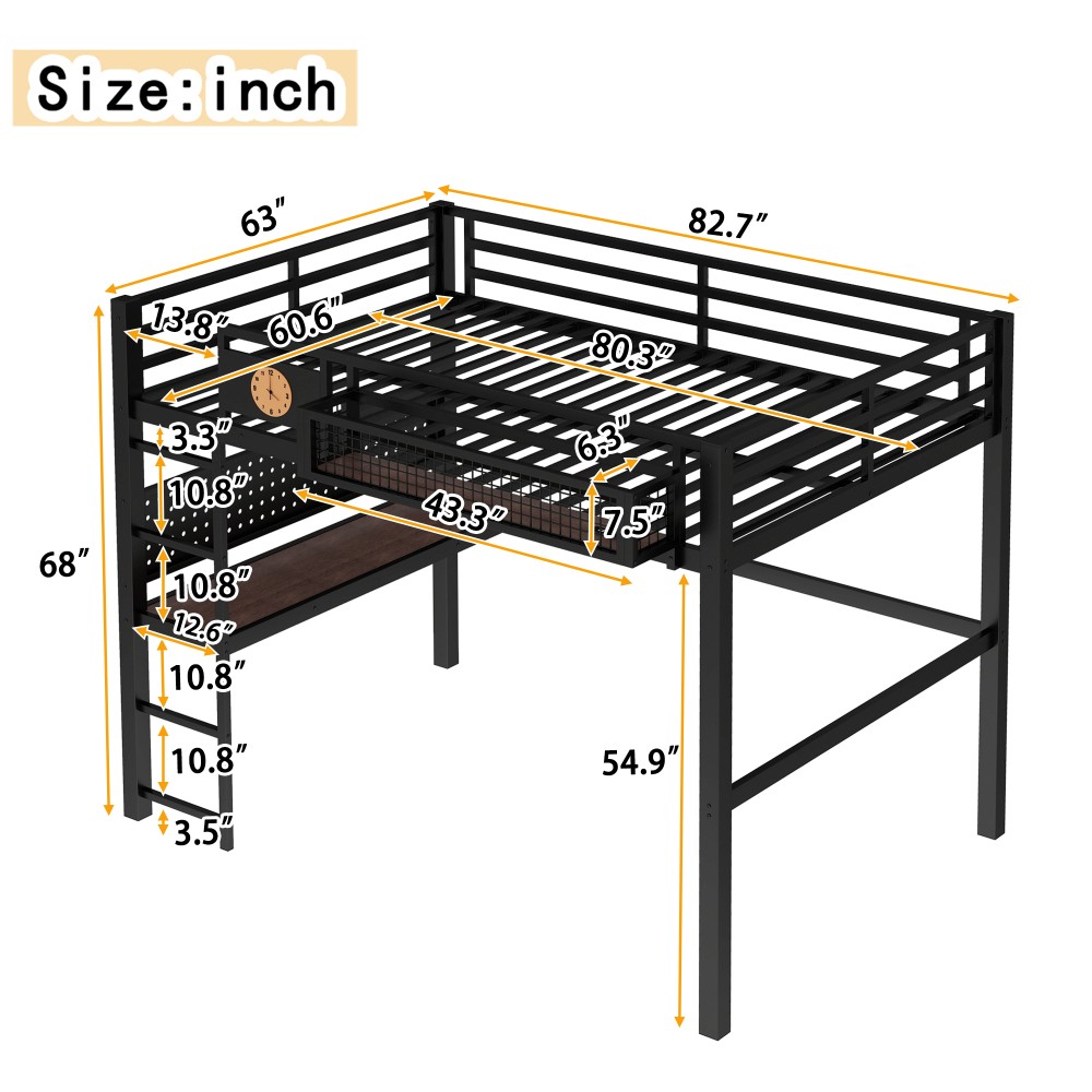 Queen Size Loft Bed Frame with desk storage basket Metal Loft Bed with clock Features 【Side Clock Design】A clock is designed beside the bed, allowing users to easily check the time while getting in and out of bed or moving around its vicinity. This fulfills the daily need to know the time, providing a reference for daily activities. The design occupies no space on the bed itself while delivering practical functionality. 【Bedside storage basket】The headboard features a storage basket for conveniently storing books, phones, and other small items. Equipped with a charging port, it allows you to charge electronic devices effortlessly from bed without searching for an outlet, meeting your daily power needs. 【Pegboard and desk】The space beneath the bed is designed as a desk area, providing a dedicated study and work zone that eliminates the need for an additional desk, thereby saving valuable room space. The included pegboard allows for hanging small tools, decorative items, and more according to your needs, further enhancing the space's storage and display functionality. 【Simple and versatile style】The overall design is sleek and sophisticated, combining black metal with functional components. Its clean lines effortlessly complement modern, industrial, and various other interior styles, adding a touch of minimalist elegance to any space. 【Easy to Assemble】All parts included in your package are indicated clearly. With step-by-step installation manual and pre-drilled holes, you can easily assemble this bed individually. Descriptions Descriptions This metal loft bed is an excellent choice for optimizing space in compact living areas. The storage basket beside the upper bed not only holds books and small items but also features a charging port, allowing you to charge electronic devices from the comfort of your bed—super convenient. The clock on the side makes checking the time effortless while moving around the bed. The lower desk paired with a pegboard creates a dedicated study or work area. The pegboard allows flexible hanging of small items, balancing storage and display. The sturdy metal frame ensures durability and strong weight capacity for safe use. Its minimalist design effortlessly complements various home decor styles, transforming limited space into a multifunctional area for sleeping, storage, and studying—bringing greater convenience and comfort to daily life. Weight & Dimensions Product Type Metal Loft Bed Color Black Size QUEEN Material Metal+MDF Overall Product Dimension 82.7”L*63’’W*68”H Overall Product Weight 106LBS Recommend Mattress Thickness 6'' Number of Package 2 Package Dimension & Weight Please refer to the Specification Level of Assembly Full Assembly Needed Eligible for Hardware Packs Yes Country of Origin China Note All the pictures are taken by actual samples, slight chromatic aberration may occur due to lighting or display. Weight Capacity The table has a weight capacity of approximately 200 lbs, and the net has a weight capacity of approximately 60 lbs.
