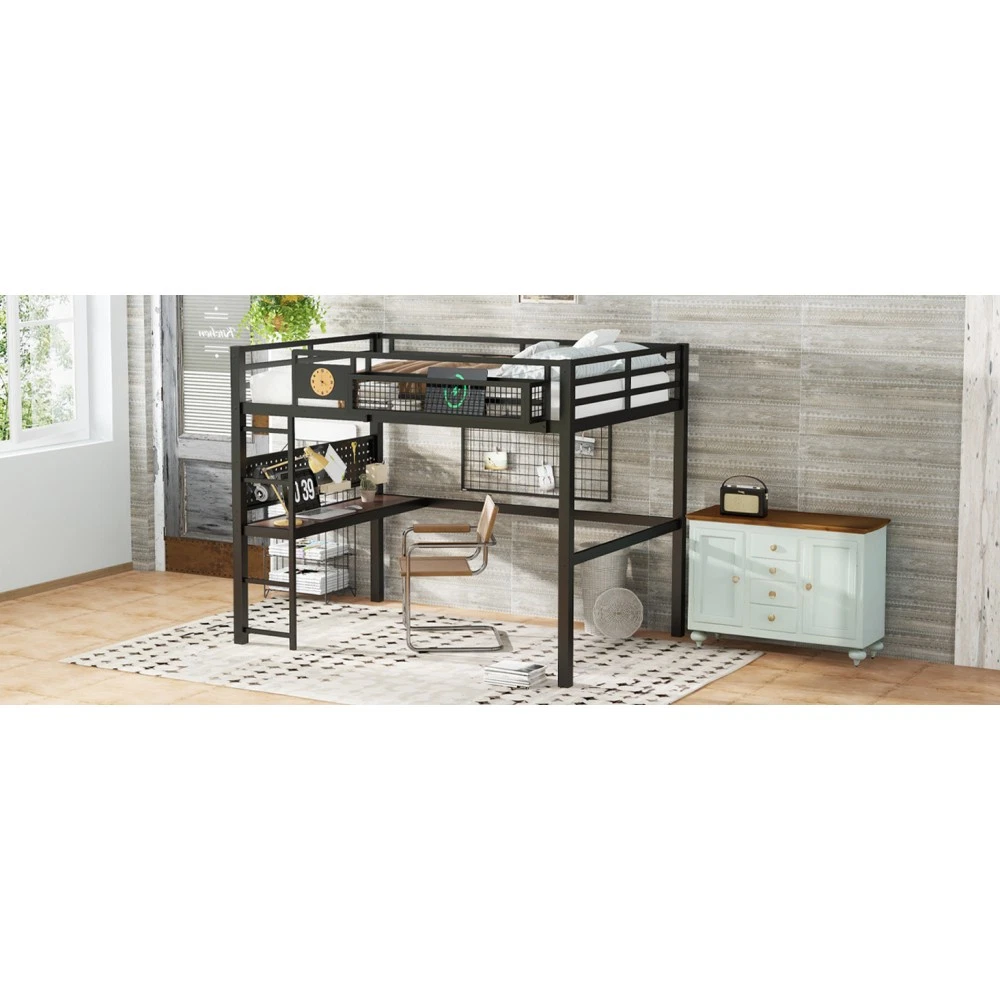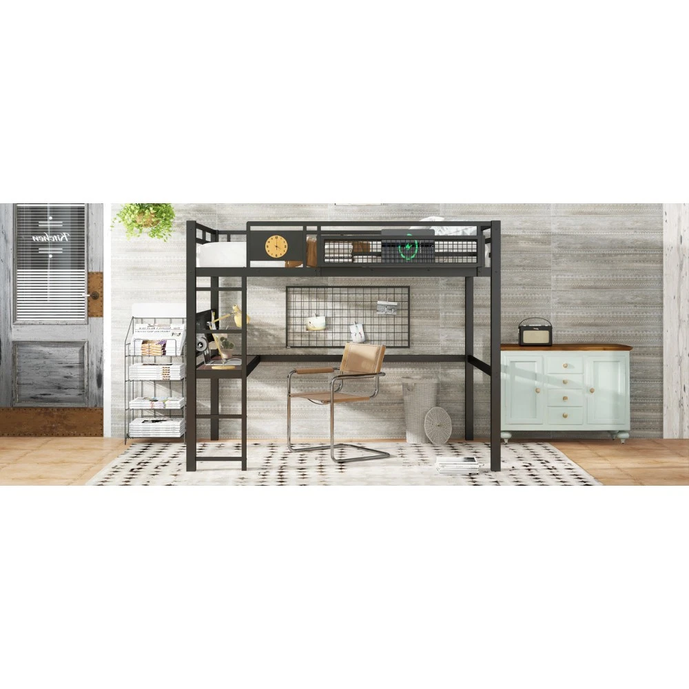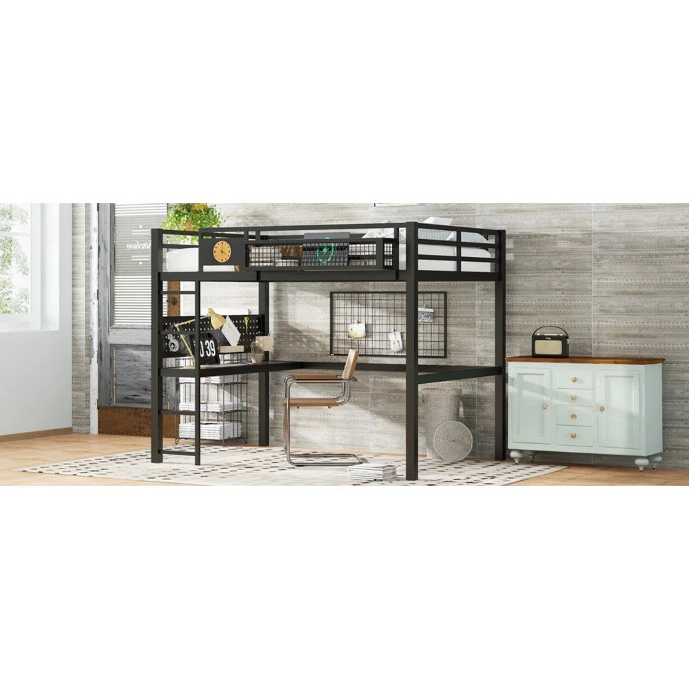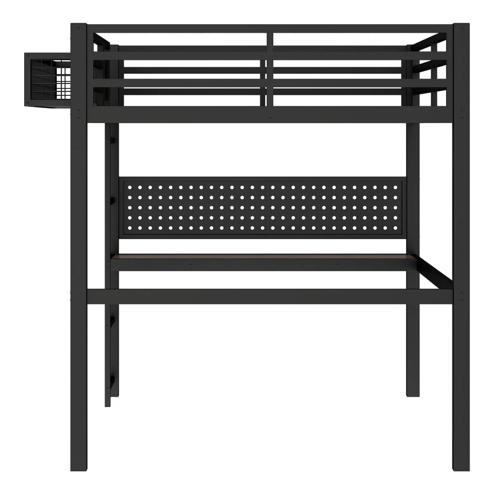 Queen Size Loft Bed Frame with desk storage basket Metal Loft Bed with clock Features 【Side Clock Design】A clock is designed beside the bed, allowing users to easily check the time while getting in and out of bed or moving around its vicinity. This fulfills the daily need to know the time, providing a reference for daily activities. The design occupies no space on the bed itself while delivering practical functionality. 【Bedside storage basket】The headboard features a storage basket for conveniently storing books, phones, and other small items. Equipped with a charging port, it allows you to charge electronic devices effortlessly from bed without searching for an outlet, meeting your daily power needs. 【Pegboard and desk】The space beneath the bed is designed as a desk area, providing a dedicated study and work zone that eliminates the need for an additional desk, thereby saving valuable room space. The included pegboard allows for hanging small tools, decorative items, and more according to your needs, further enhancing the space's storage and display functionality. 【Simple and versatile style】The overall design is sleek and sophisticated, combining black metal with functional components. Its clean lines effortlessly complement modern, industrial, and various other interior styles, adding a touch of minimalist elegance to any space. 【Easy to Assemble】All parts included in your package are indicated clearly. With step-by-step installation manual and pre-drilled holes, you can easily assemble this bed individually. Descriptions Descriptions This metal loft bed is an excellent choice for optimizing space in compact living areas. The storage basket beside the upper bed not only holds books and small items but also features a charging port, allowing you to charge electronic devices from the comfort of your bed—super convenient. The clock on the side makes checking the time effortless while moving around the bed. The lower desk paired with a pegboard creates a dedicated study or work area. The pegboard allows flexible hanging of small items, balancing storage and display. The sturdy metal frame ensures durability and strong weight capacity for safe use. Its minimalist design effortlessly complements various home decor styles, transforming limited space into a multifunctional area for sleeping, storage, and studying—bringing greater convenience and comfort to daily life. Weight & Dimensions Product Type Metal Loft Bed Color Black Size QUEEN Material Metal+MDF Overall Product Dimension 82.7”L*63’’W*68”H Overall Product Weight 106LBS Recommend Mattress Thickness 6'' Number of Package 2 Package Dimension & Weight Please refer to the Specification Level of Assembly Full Assembly Needed Eligible for Hardware Packs Yes Country of Origin China Note All the pictures are taken by actual samples, slight chromatic aberration may occur due to lighting or display. Weight Capacity The table has a weight capacity of approximately 200 lbs, and the net has a weight capacity of approximately 60 lbs.