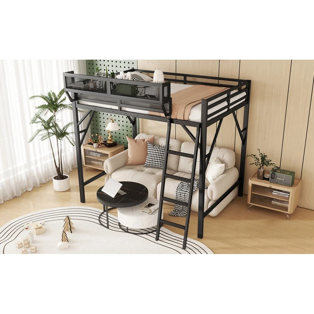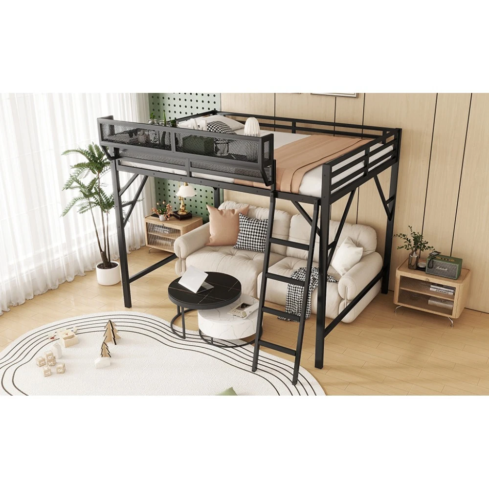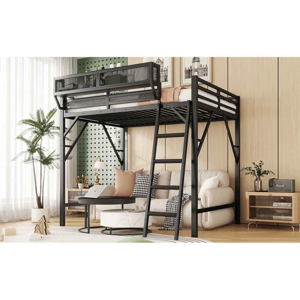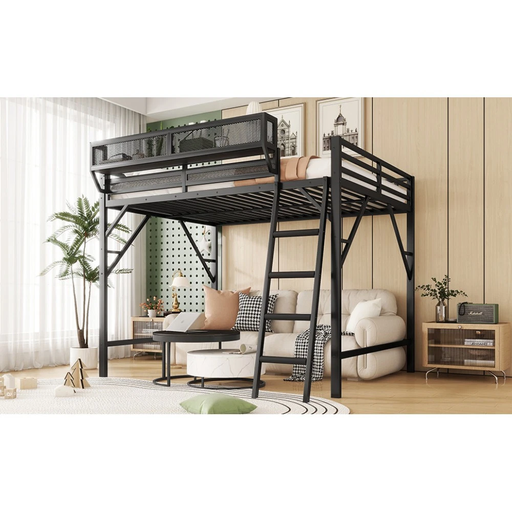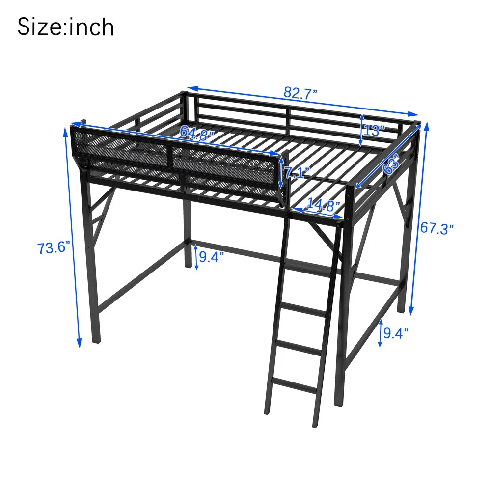 Expect Arrival Date: July 20, 2025 | Patent Product | 1-Year Warranty | 30-Day Free Return & Exchange Upgrade your kid's or teen's bedroom with our heavy-duty queen size metal loft bed—where space-saving design meets maximum functionality! Crafted with premium iron and featuring a sleek black finish, this patent-approved loft bed blends durability with modern style, perfect for any bedroom decor. Whether for storing essentials, creating a study nook, or ensuring safe sleep, it's the ultimate solution for small spaces. ✨ Key Product Specifications Specification Details Bed Size Queen Size Material High-Quality Iron Overall Dimensions (L×W×H) 81.7" × 61.8" × 74" Under-Bed Clearance 54.3" (ideal for storage/study area) Upper Guardrail Height 11.3" (enhanced safety) Weight Capacity 400 LBS Net Weight / Gross Weight 99 lbs / 108.46 lbs Recommended Mattress Thickness 6" (mattress NOT included) Box Spring Requirement No Country of Origin China Package Dimensions (L×W×H) 82.09" × 14.76" × 6.89" 🌟 Standout Features Built-In Upper Storage Shelf with Mesh Guard - Keep books, tablets, nightlights, or small toys within arm's reach! The integrated shelf adds extra storage without wasting space, and the surrounding mesh prevents items from falling off—perfect for kids' messy habits. Non-Slip Safety Ladder - Say goodbye to wobbly, uncomfortable ladders! Our ladder features flat MDF steps that offer a stable, comfortable grip for climbing up and down. Designed specifically for kids and teens, it minimizes slipping risks and ensures safe access to the upper bed. 54.3" Under-Bed Multi-Use Space - Maximize your bedroom's potential! The generous under-bed clearance fits storage cabinets, a small sofa, a study desk, or even a play area—turning one piece of furniture into a versatile hub for sleep, study, and play. Premium Safety Design - Rest easy knowing your child is safe! 11.3" high guardrails surround the upper bed to prevent falls, while plastic stoppers secure the slats tightly—eliminating noisy movements and ensuring a quiet, uninterrupted sleep. Durable & Sturdy Construction - Made from high-grade iron, this loft bed boasts exceptional stability and long-lasting durability. It supports up to 400 LBS and resists wear and tear, while the sleek black metal finish adds a modern touch to any bedroom style. 🛡️ Our Commitment to You 1-Year Manufacturer Warranty - We stand behind our product! Enjoy a 1-year warranty covering any manufacturing defects. If you encounter issues with parts or craftsmanship, our support team will assist you promptly. 30-Day Free Return & Exchange - Shop with confidence! If you're not completely satisfied with your loft bed within 30 days of delivery, we offer free returns and exchanges—no hassle, no hidden fees. 📦 What You Need to Know Assembly is required (clear instructions and all hardware included). Mattress is not included—we recommend a 6" thick mattress for optimal fit and comfort. This patent product is exclusively designed for kids and teens, combining safety, functionality, and style to elevate any bedroom. Don't miss out on this space-saving essential! Add to cart today and get ready to transform your child's bedroom—with the peace of mind from our warranty and free return policy.