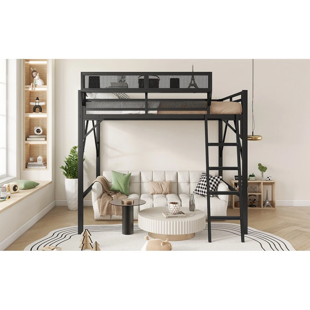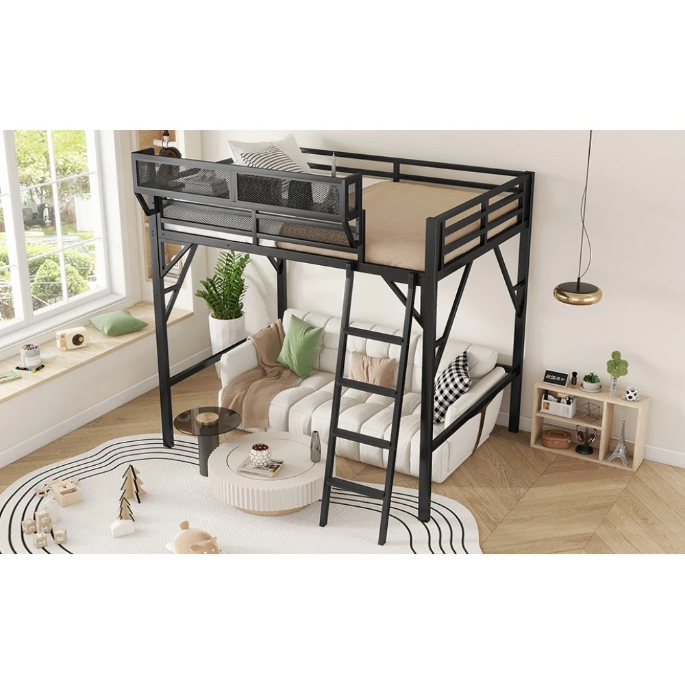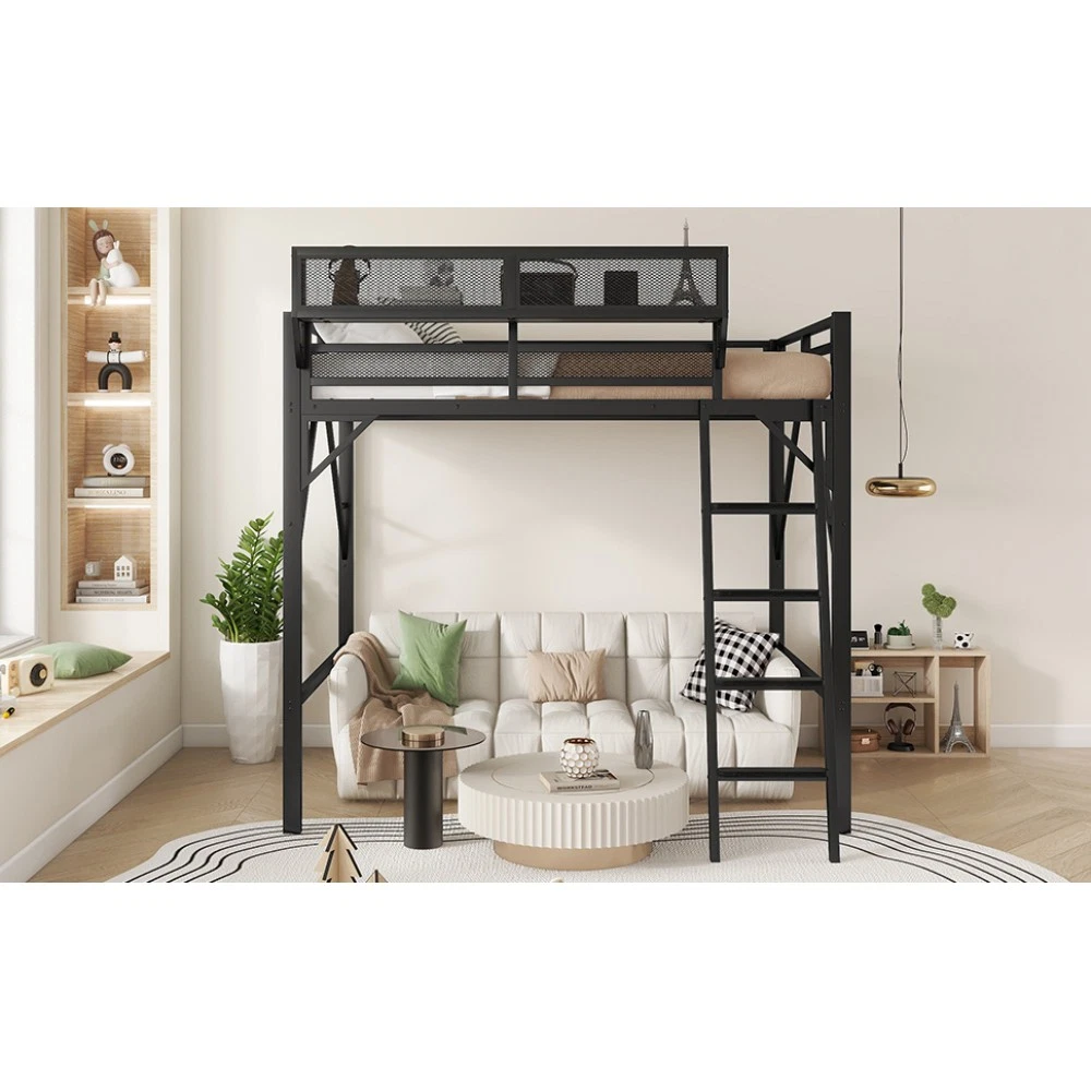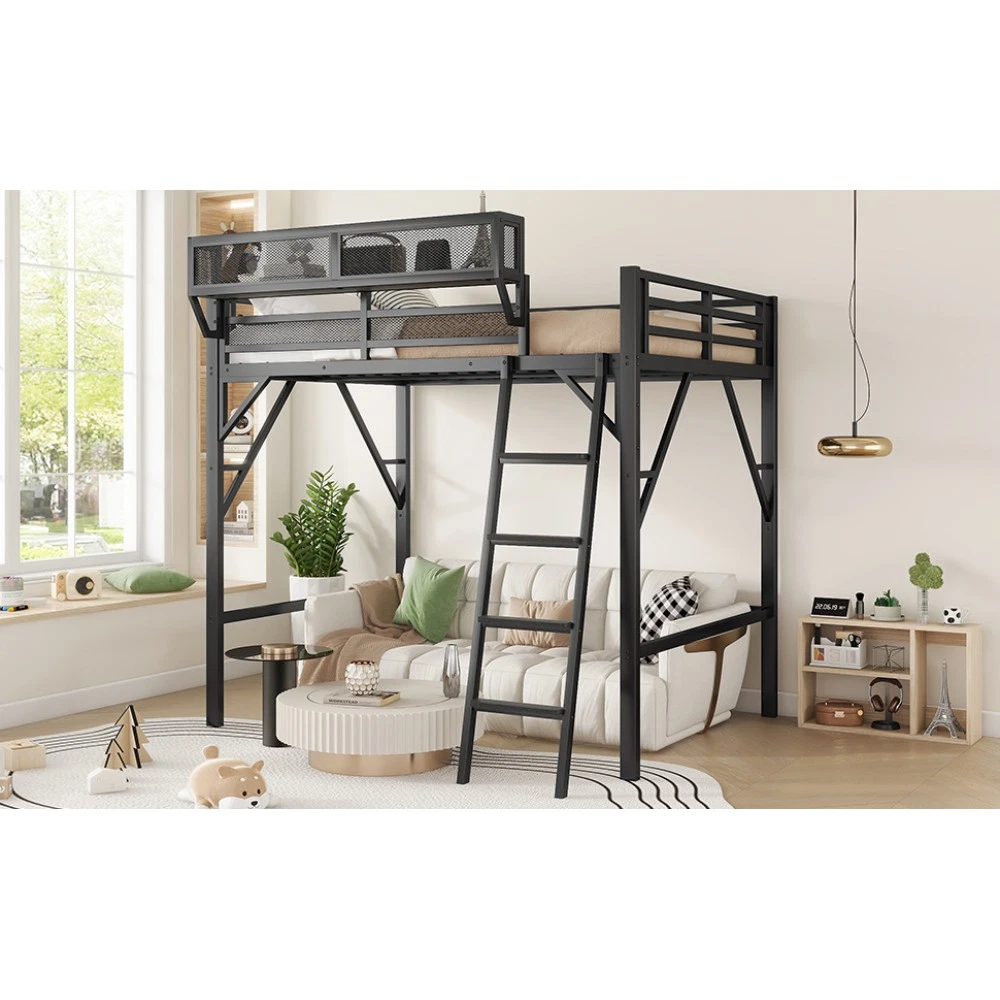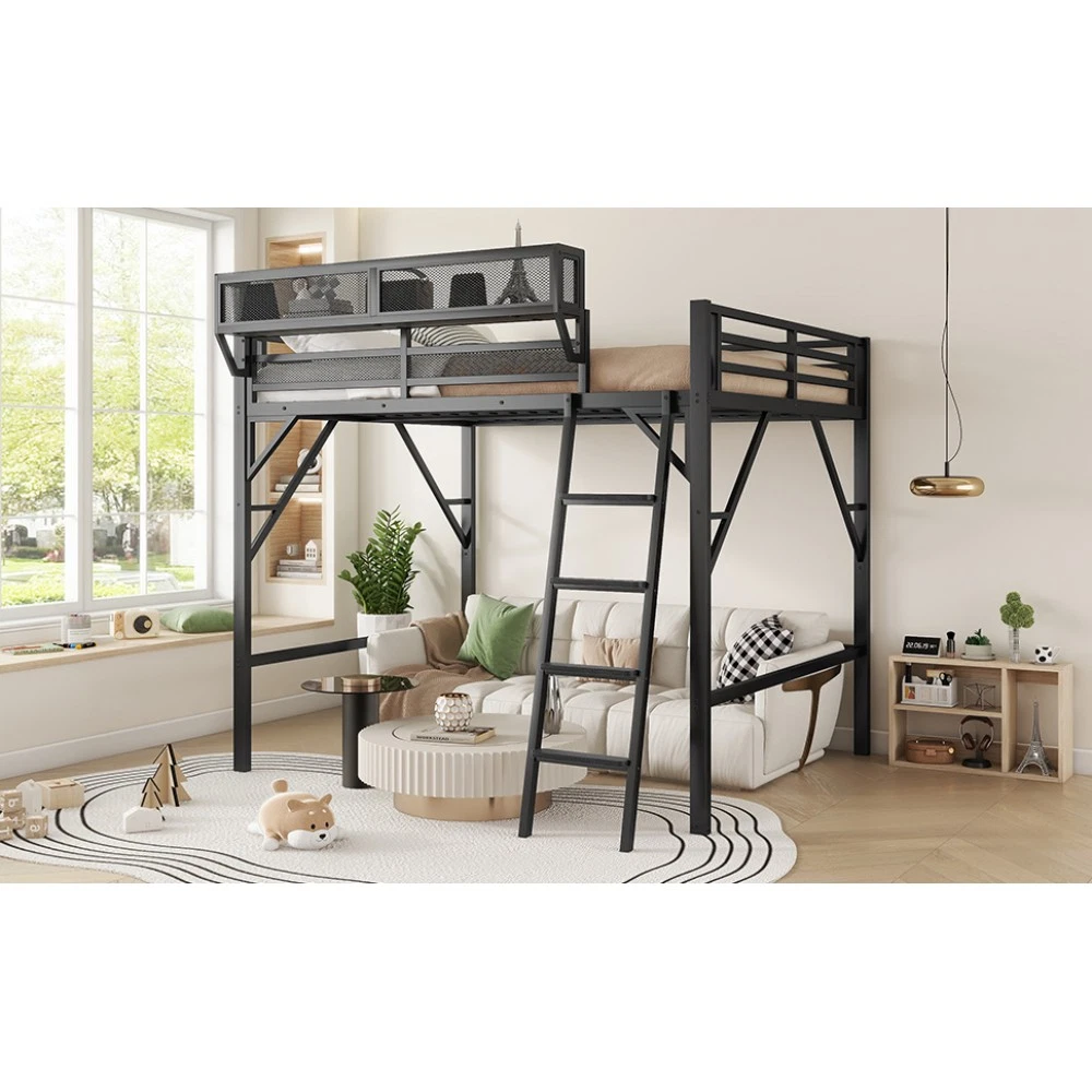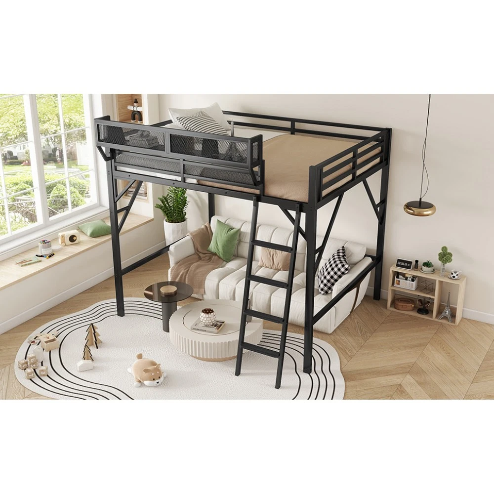 Expect Arrival Date: July 20, 2025 | Patent Product | 1-Year Warranty | 30-Day Free Return & Exchange Upgrade your kid's or teen's bedroom with our heavy-duty queen size metal loft bed—where space-saving design meets maximum functionality! Crafted with premium iron and featuring a sleek black finish, this patent-approved loft bed blends durability with modern style, perfect for any bedroom decor. Whether for storing essentials, creating a study nook, or ensuring safe sleep, it's the ultimate solution for small spaces. ✨ Key Product Specifications Specification Details Bed Size Queen Size Material High-Quality Iron Overall Dimensions (L×W×H) 81.7" × 61.8" × 74" Under-Bed Clearance 54.3" (ideal for storage/study area) Upper Guardrail Height 11.3" (enhanced safety) Weight Capacity 400 LBS Net Weight / Gross Weight 99 lbs / 108.46 lbs Recommended Mattress Thickness 6" (mattress NOT included) Box Spring Requirement No Country of Origin China Package Dimensions (L×W×H) 82.09" × 14.76" × 6.89" 🌟 Standout Features Built-In Upper Storage Shelf with Mesh Guard - Keep books, tablets, nightlights, or small toys within arm's reach! The integrated shelf adds extra storage without wasting space, and the surrounding mesh prevents items from falling off—perfect for kids' messy habits. Non-Slip Safety Ladder - Say goodbye to wobbly, uncomfortable ladders! Our ladder features flat MDF steps that offer a stable, comfortable grip for climbing up and down. Designed specifically for kids and teens, it minimizes slipping risks and ensures safe access to the upper bed. 54.3" Under-Bed Multi-Use Space - Maximize your bedroom's potential! The generous under-bed clearance fits storage cabinets, a small sofa, a study desk, or even a play area—turning one piece of furniture into a versatile hub for sleep, study, and play. Premium Safety Design - Rest easy knowing your child is safe! 11.3" high guardrails surround the upper bed to prevent falls, while plastic stoppers secure the slats tightly—eliminating noisy movements and ensuring a quiet, uninterrupted sleep. Durable & Sturdy Construction - Made from high-grade iron, this loft bed boasts exceptional stability and long-lasting durability. It supports up to 400 LBS and resists wear and tear, while the sleek black metal finish adds a modern touch to any bedroom style. 🛡️ Our Commitment to You 1-Year Manufacturer Warranty - We stand behind our product! Enjoy a 1-year warranty covering any manufacturing defects. If you encounter issues with parts or craftsmanship, our support team will assist you promptly. 30-Day Free Return & Exchange - Shop with confidence! If you're not completely satisfied with your loft bed within 30 days of delivery, we offer free returns and exchanges—no hassle, no hidden fees. 📦 What You Need to Know Assembly is required (clear instructions and all hardware included). Mattress is not included—we recommend a 6" thick mattress for optimal fit and comfort. This patent product is exclusively designed for kids and teens, combining safety, functionality, and style to elevate any bedroom. Don't miss out on this space-saving essential! Add to cart today and get ready to transform your child's bedroom—with the peace of mind from our warranty and free return policy.